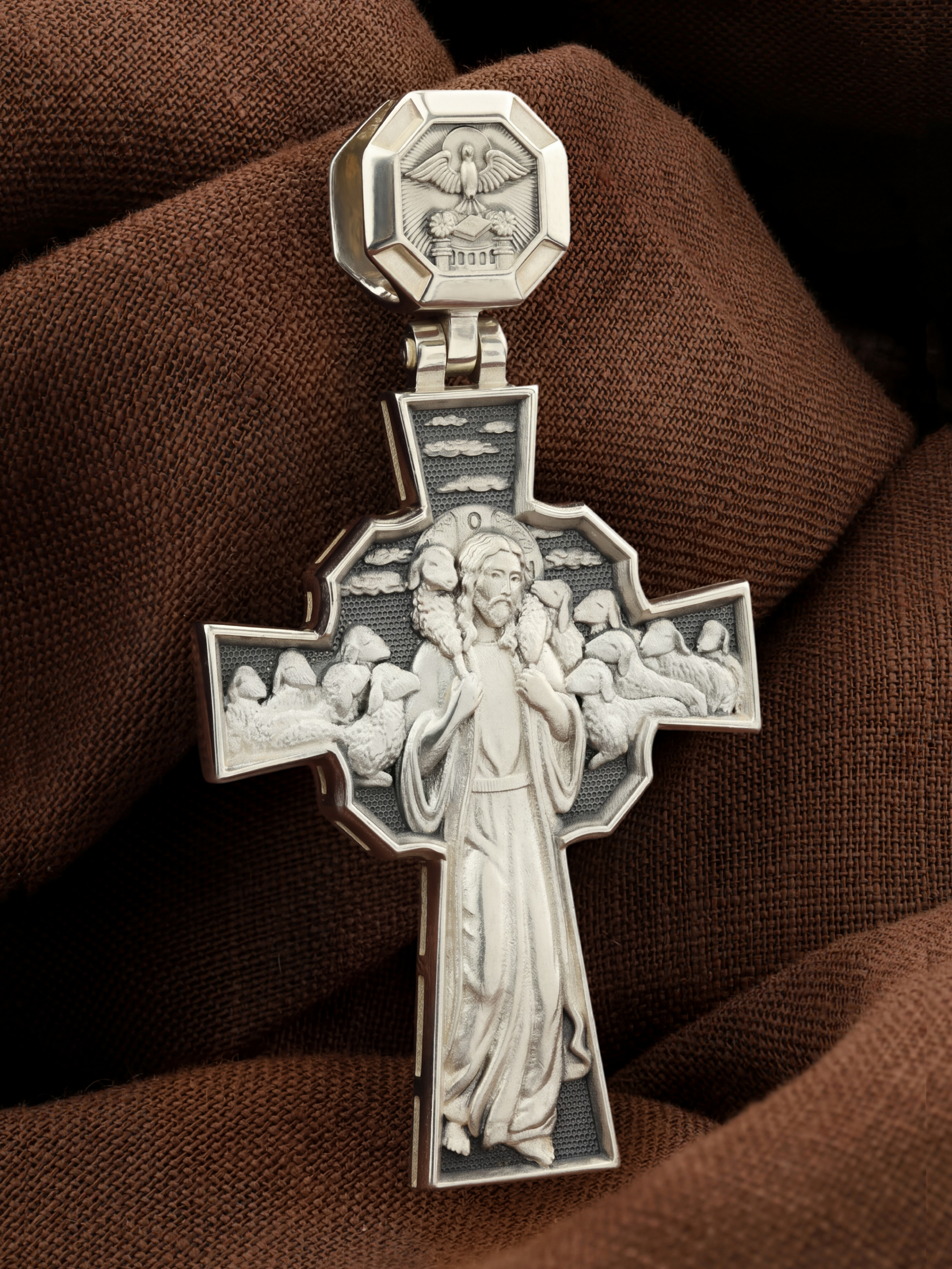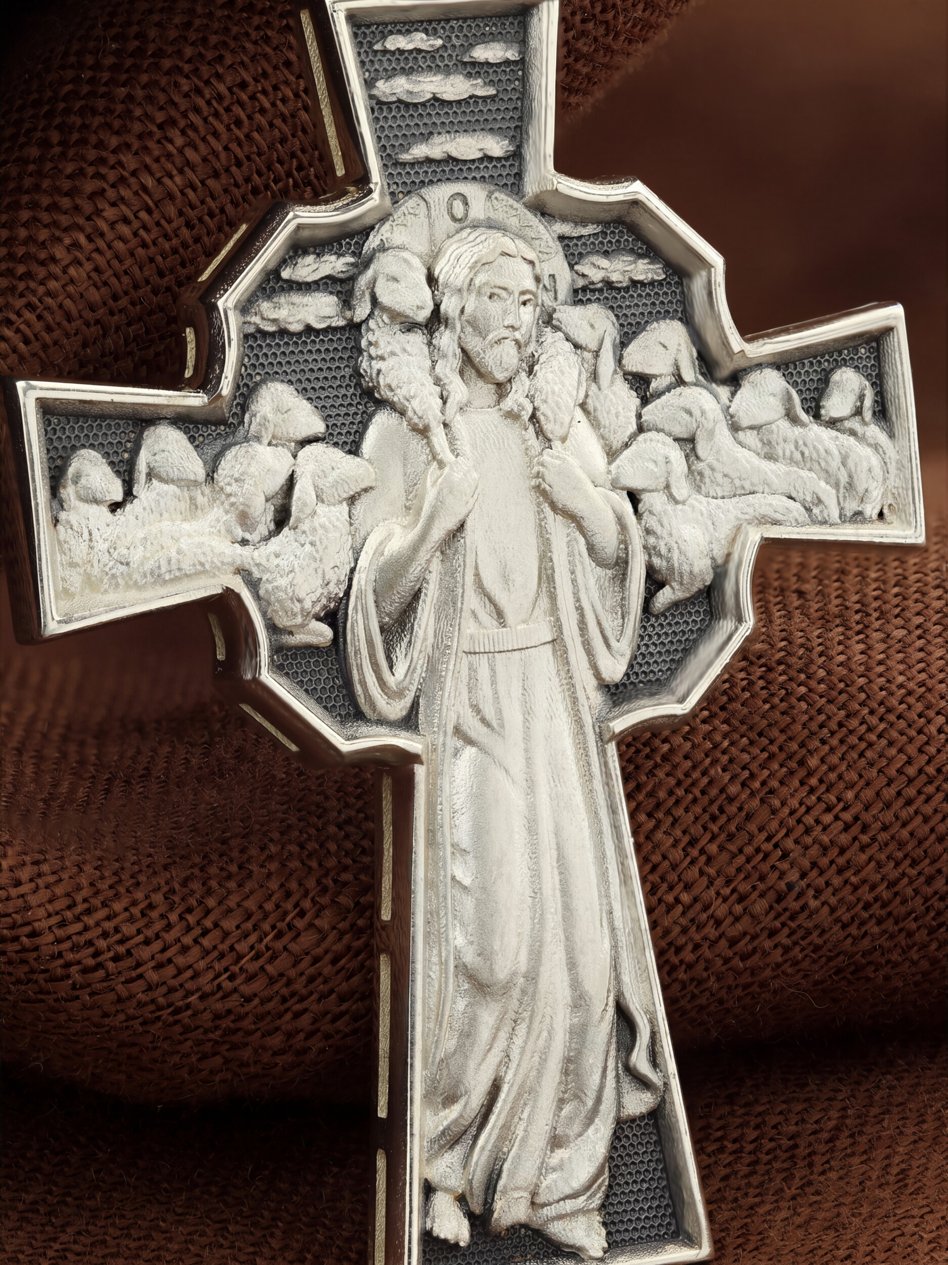 Но обратной стороне креста изображение Иисуса Христа. Добрый Пастырь — символическое именование и изображение Иисуса Христа, заимствованное из Ветхого Завета и повторенное Христом в Новом Завете в своей роли учителя. Иисус изображается с заблудшей овцой, вскинутой на плечи (Лк. 15:3−7).