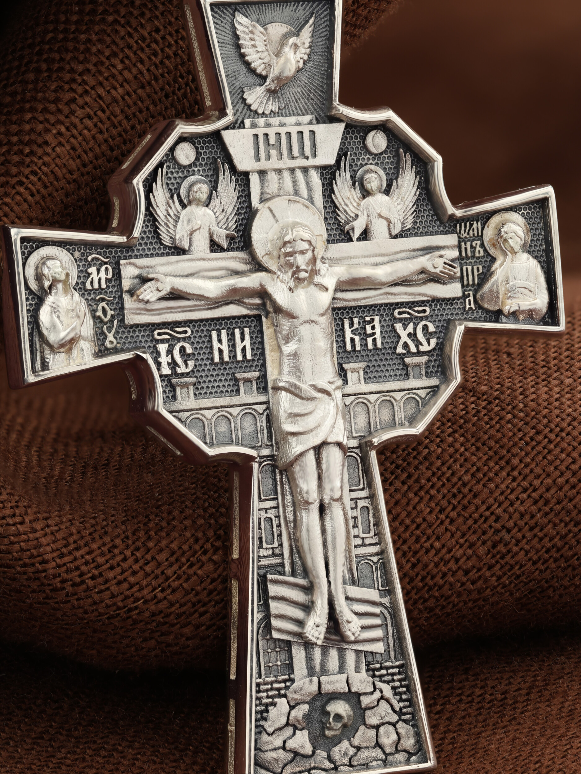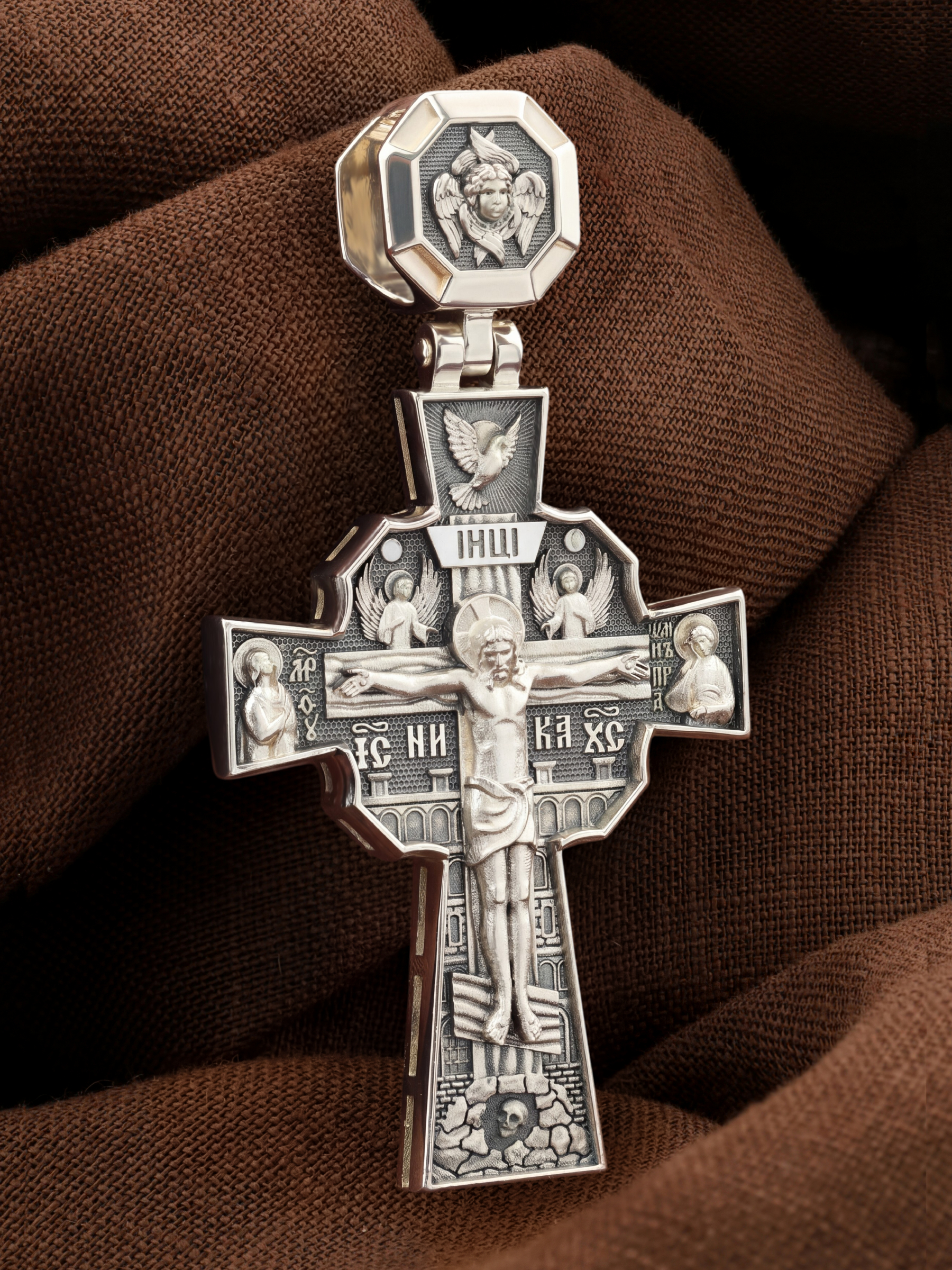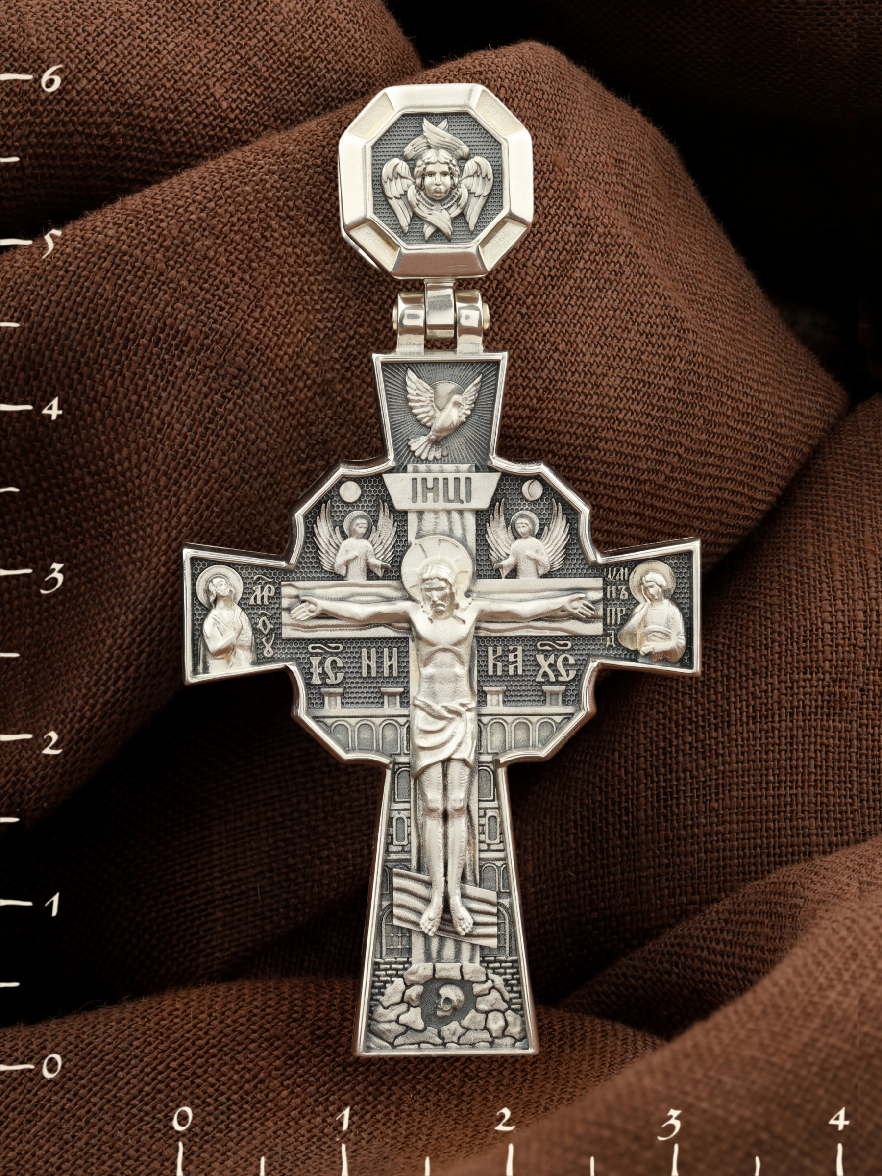 Над Распятием изображен парящий голубь — символ Святого Духа и Его благодати. На кулонном кольце изображен шестикрылый Серафим — самый приближенный к Господу Ангел.