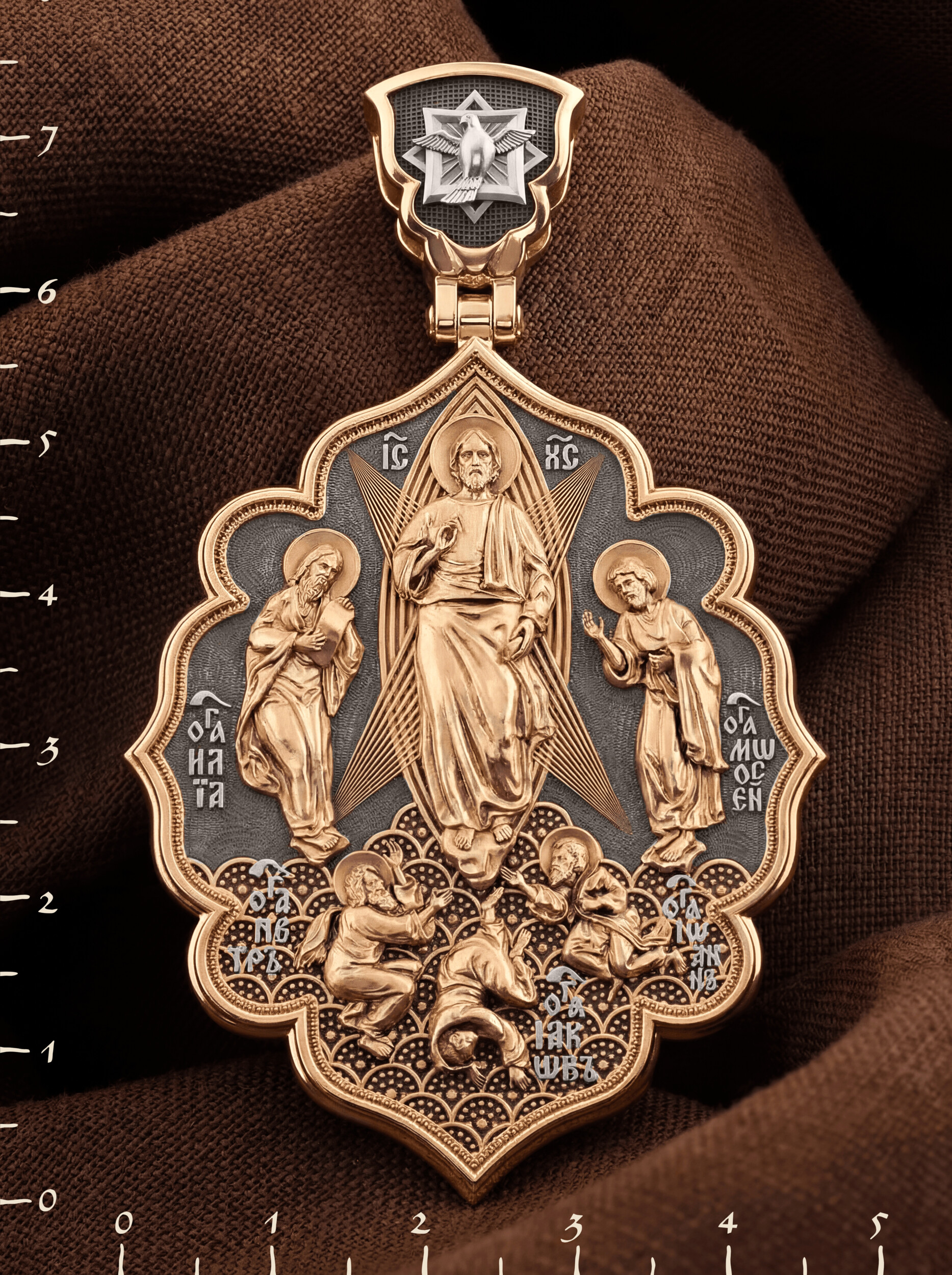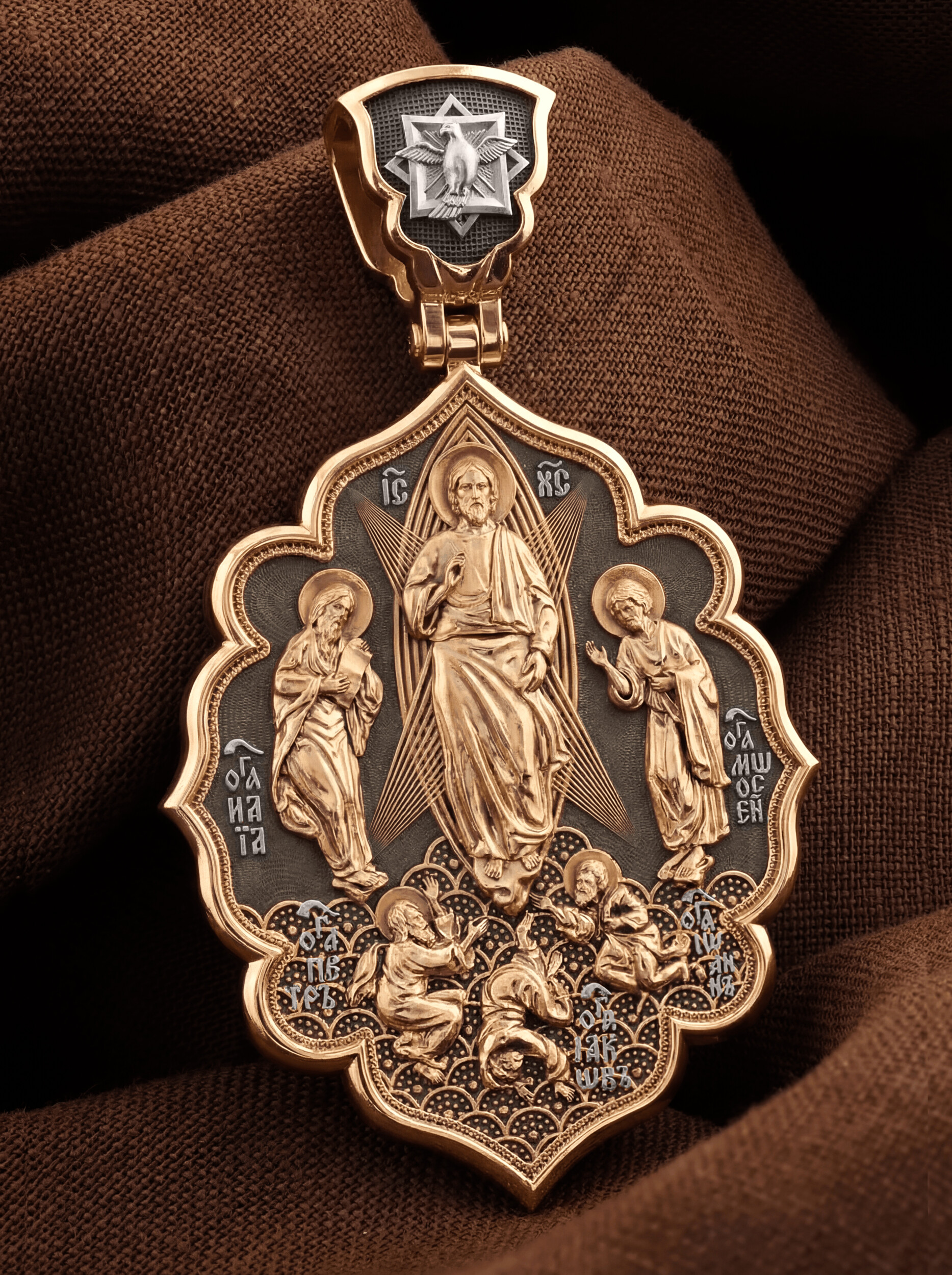На лицевой стороне образка изображена икона «Преображение». Образ являет Господа Иисуса Христа в тот момент, когда Он преобразился во время молитвы перед тремя Своими учениками: Петром, Иаковом и Иоанном Богословом. Пророки Моисей и Илия предстояли рядом и беседовали с Ним. Апостолы едва могли вынести бесконечную радость, которая охватила их в присутствии Бога. Когда же на гору спустилось облако и раздался глас Божий: «Сей есть Сын Мой Возлюбленный; Его слушайте», апостолы в сильном страхе пали на землю (Лк. 9:35). На иконах «Преображение» они так и изображаются — лежащими у ног Христа.