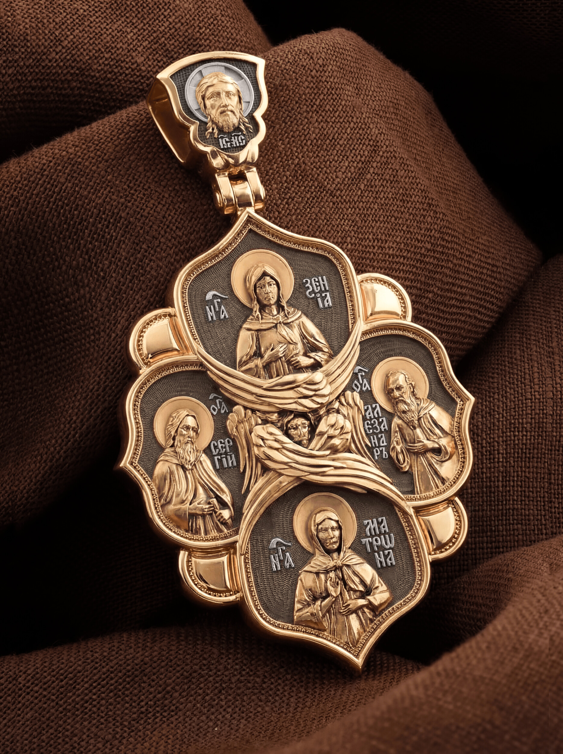 На обороте образка изображены четверо возлюбленных Богом угодников. Слева от Серафима изображен прп. Сергий Радонежский. Этот святой начал свой путь к Богу отшельником в Радонежских лесах, где основал монастырь, ставший духовным центром Руси. Он исцелял больных, которых ему привозили отовсюду, и даже воскресил отрока.