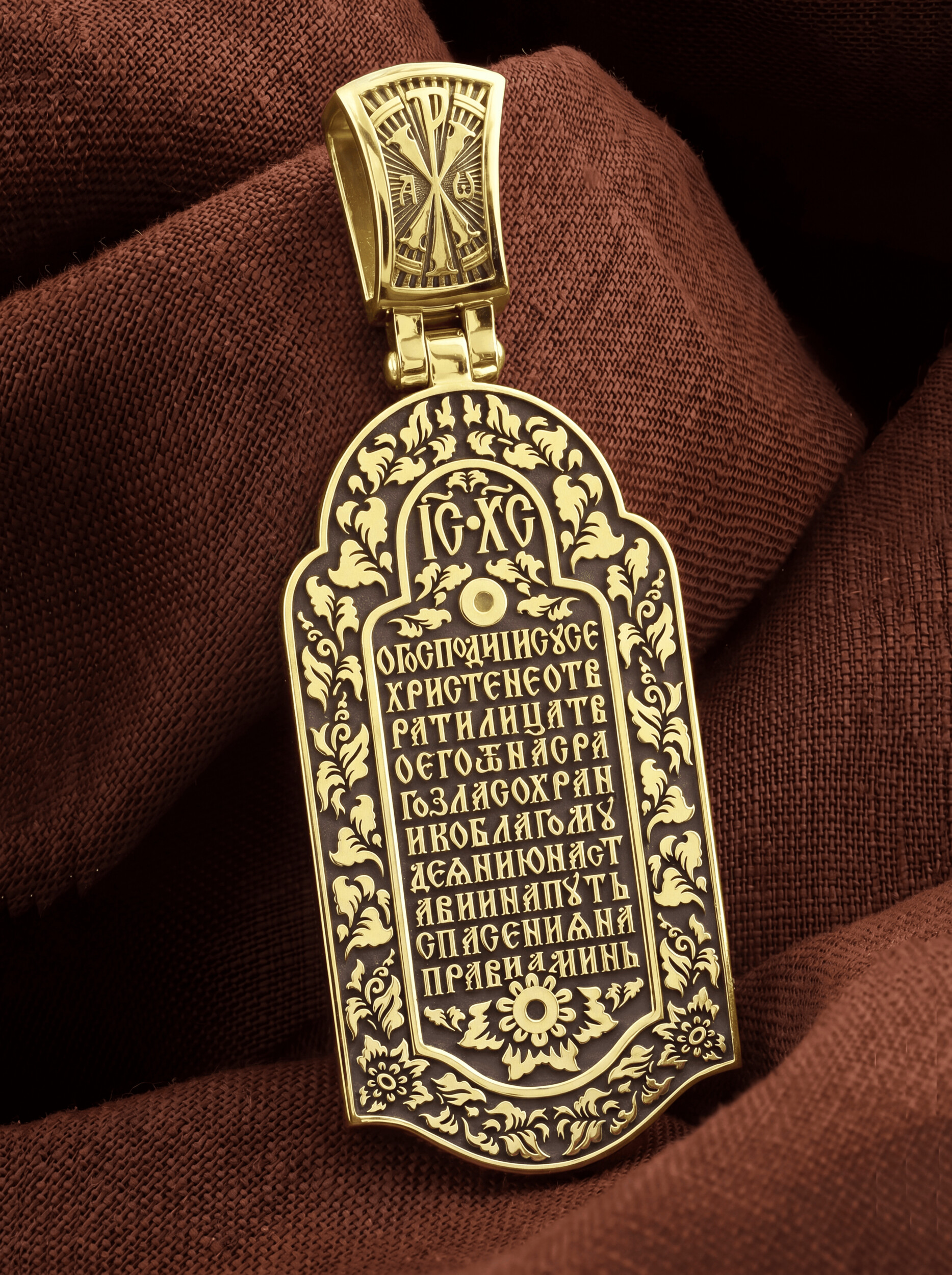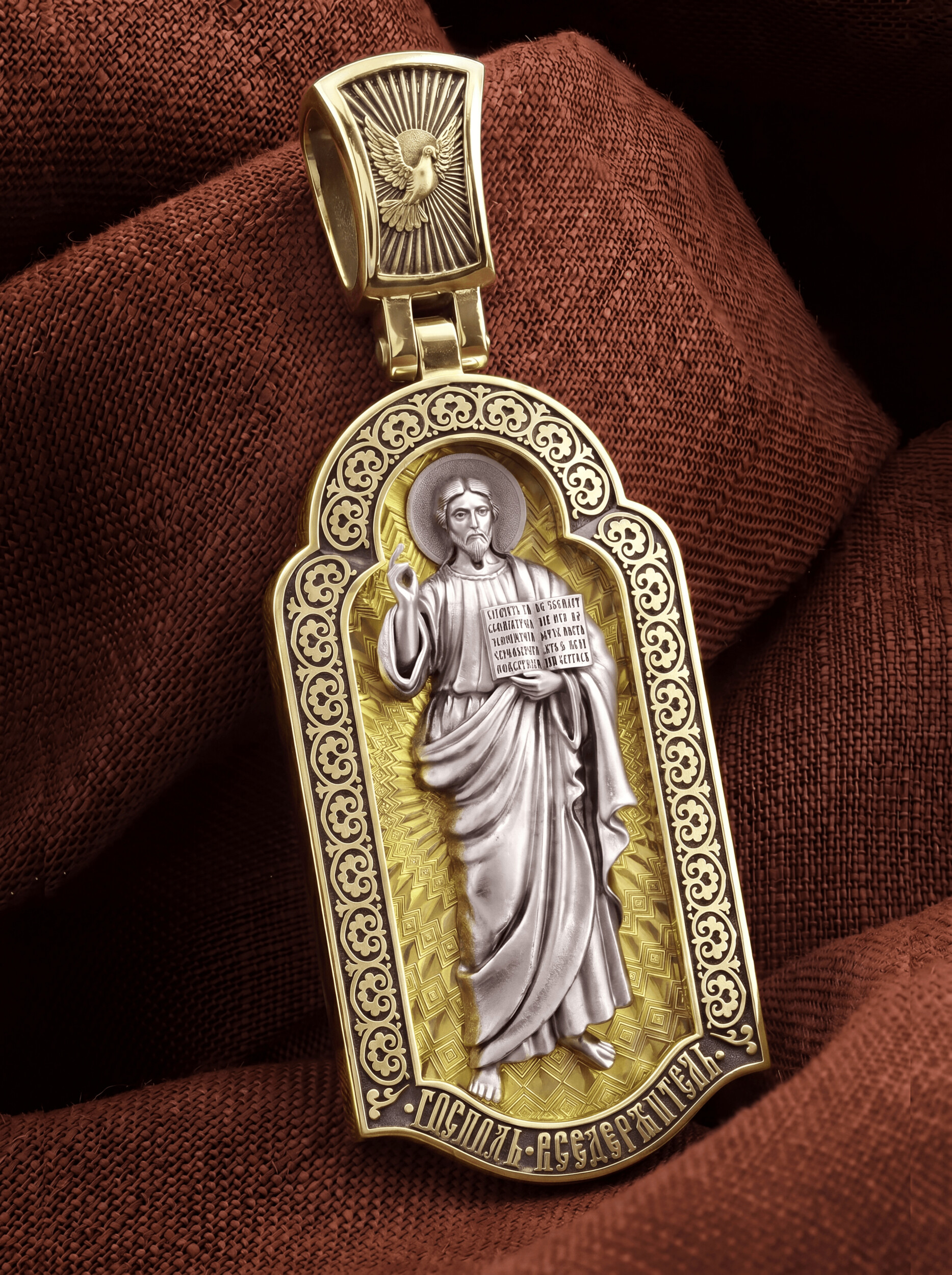 На лицевой стороне креста изображен Иисус Христос в образе Вседержителя, по-гречески «Пантократор». Это древнейший образ Спасителя, на котором Он представлен как властелин и правитель мира. Христос держит в руках Книгу, которая символизирует Книгу Бытия, то есть весь сотворенный Богом мир. В этой Книге судьбы всех людей, живущих на земле. Часто эту Книгу образно называют Книгой Жизни. Первое дошедшее до нас подобное изображение датируется VI веком и хранится в монастыре Святой Екатерины на горе Синай. Такие образы Христа с глубокой древности писались и в Палестине. Но Святая земля так часто подвергалась разграблению завоевателями, что древних икон там не осталось. Большинствоикон в храме Воскресения Христова были созданыв XIX веке.