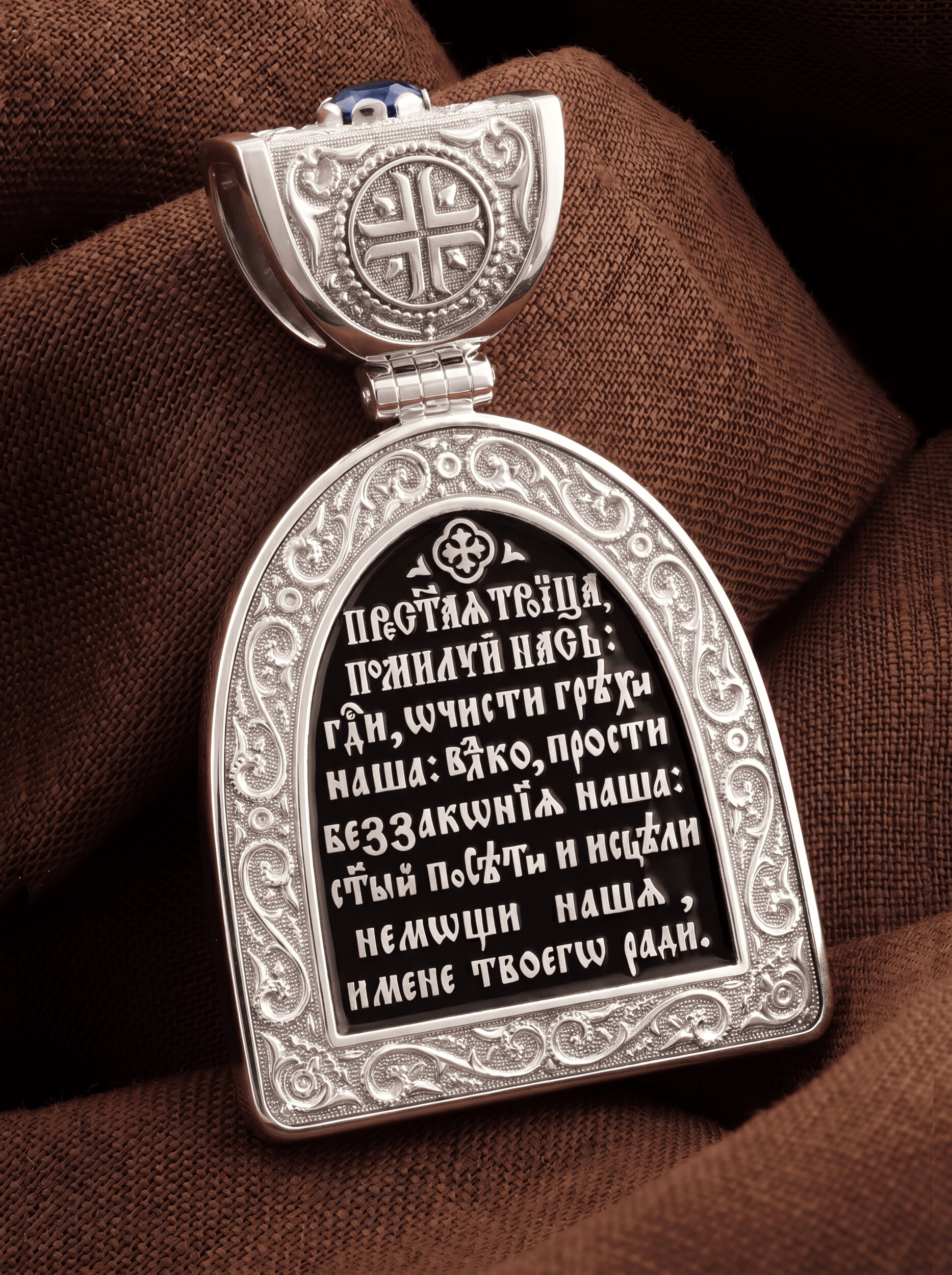 На обороте образка написана молитва: «Пресвятая Троице, помилуй нас; Господи, очисти грехи наша; Владыко, прости беззакония наша; Святый, посети и исцели немощи наша, имене Твоего ради.»