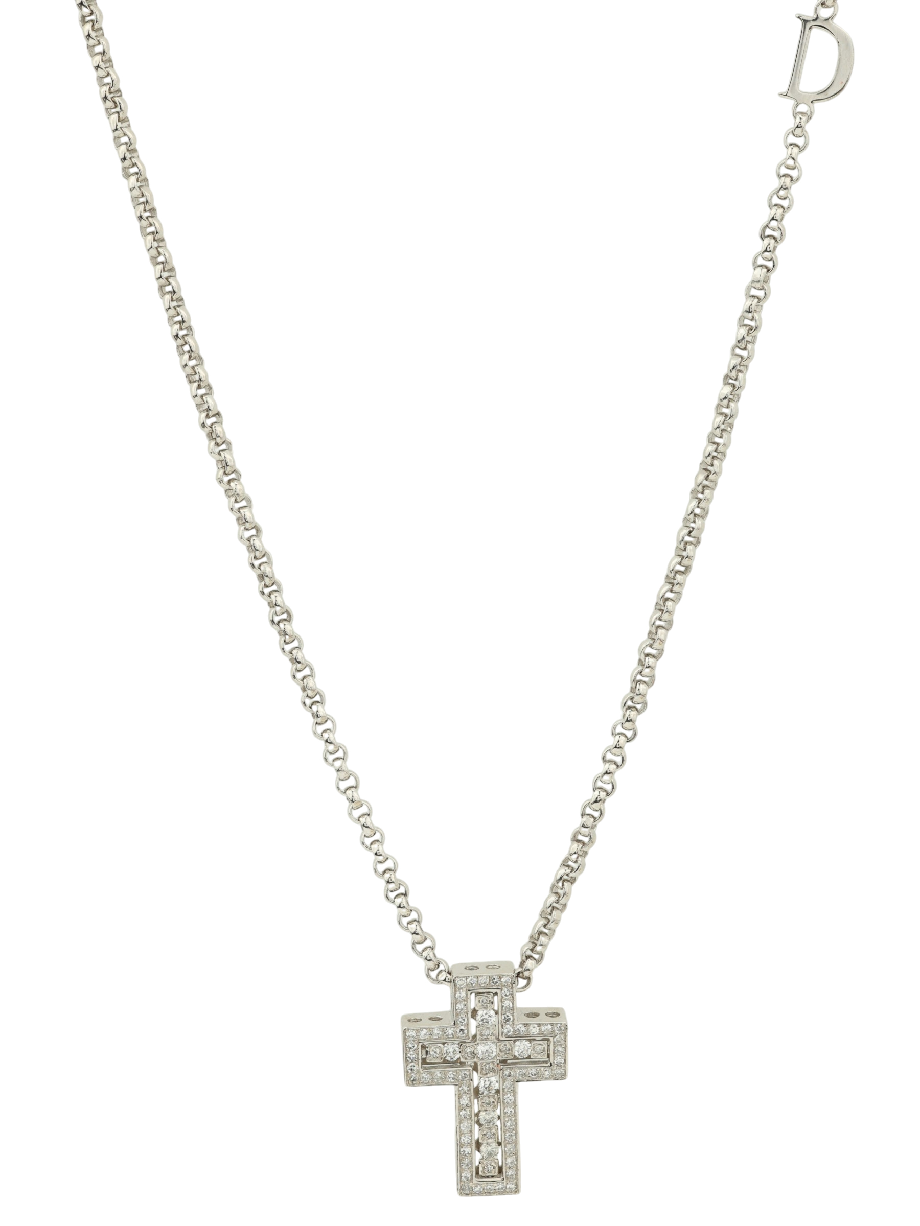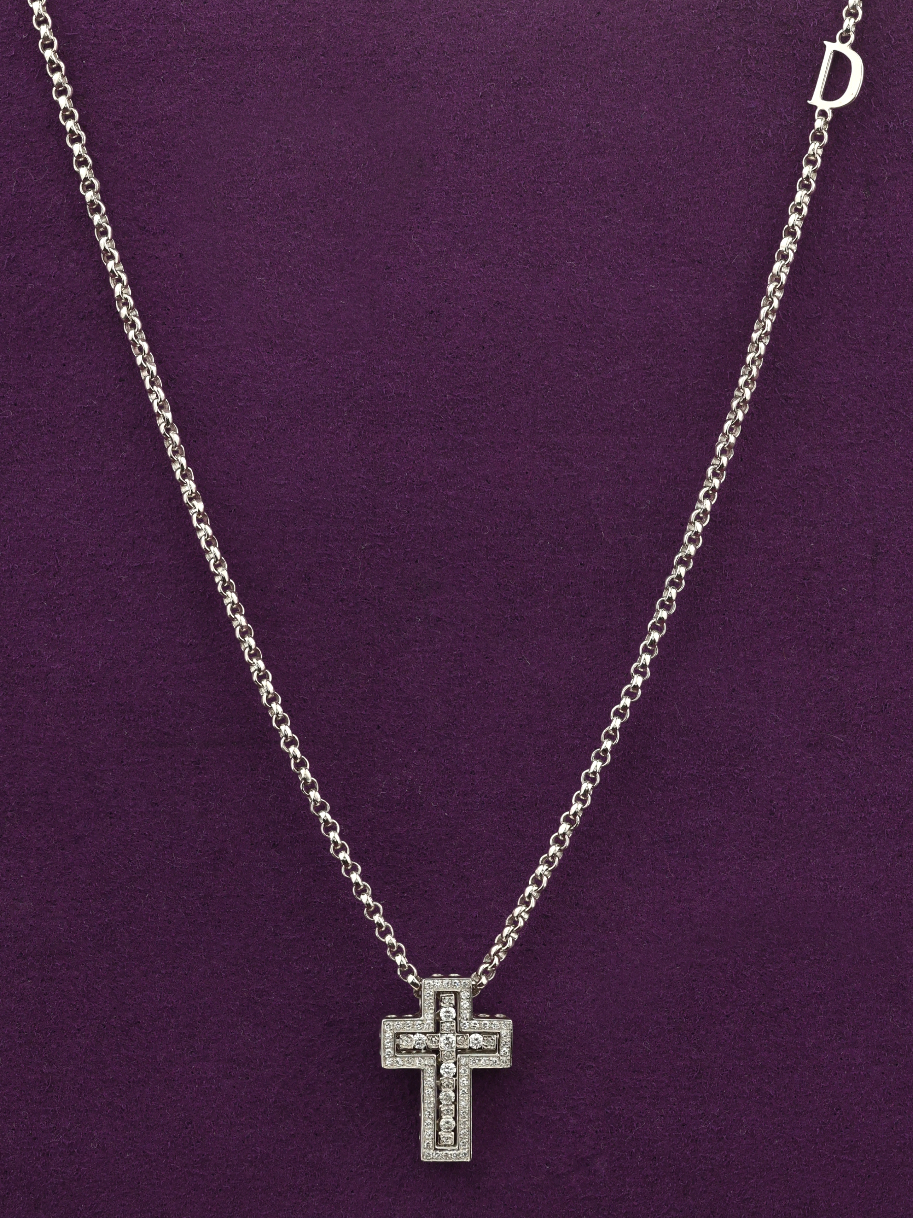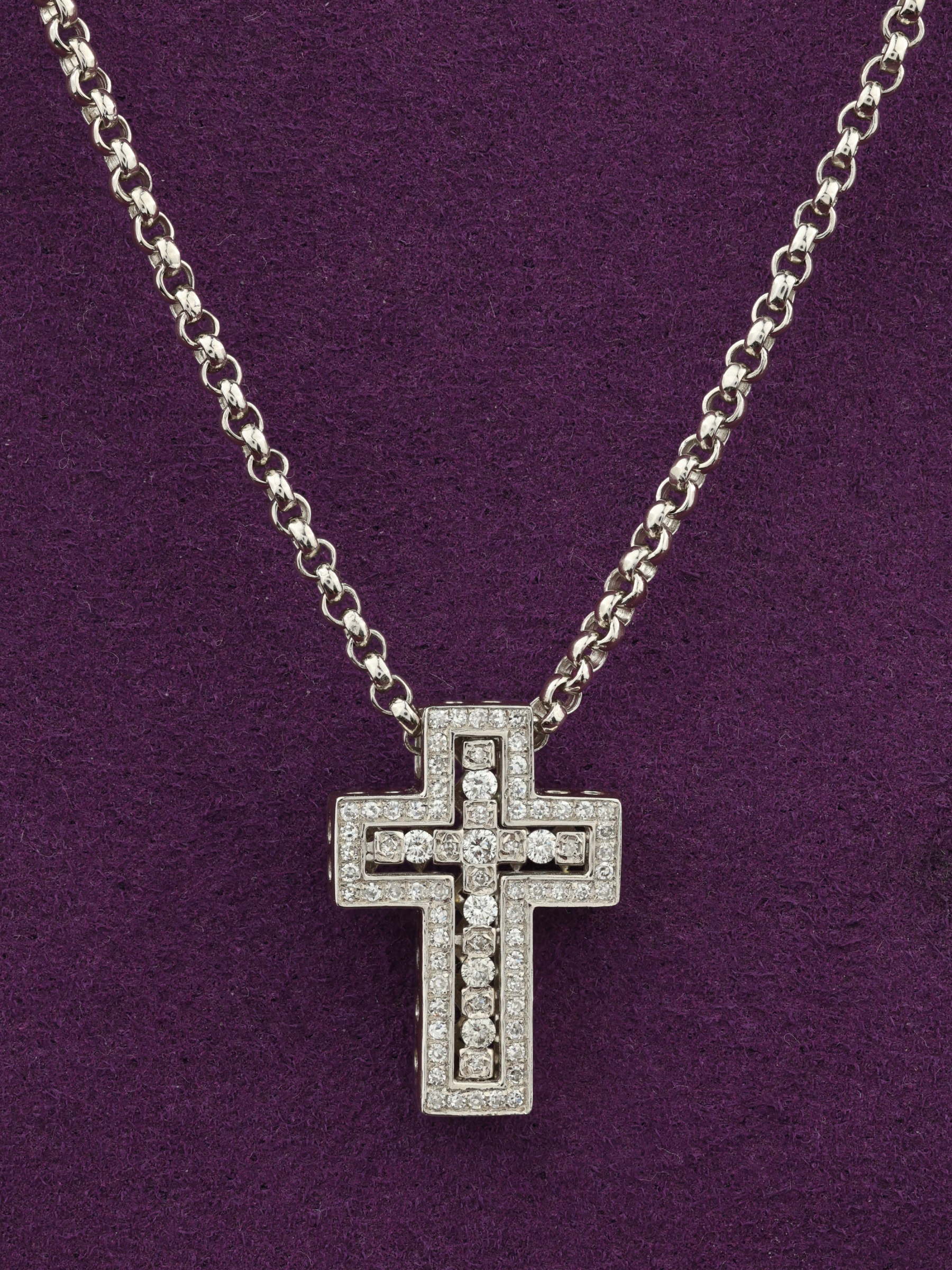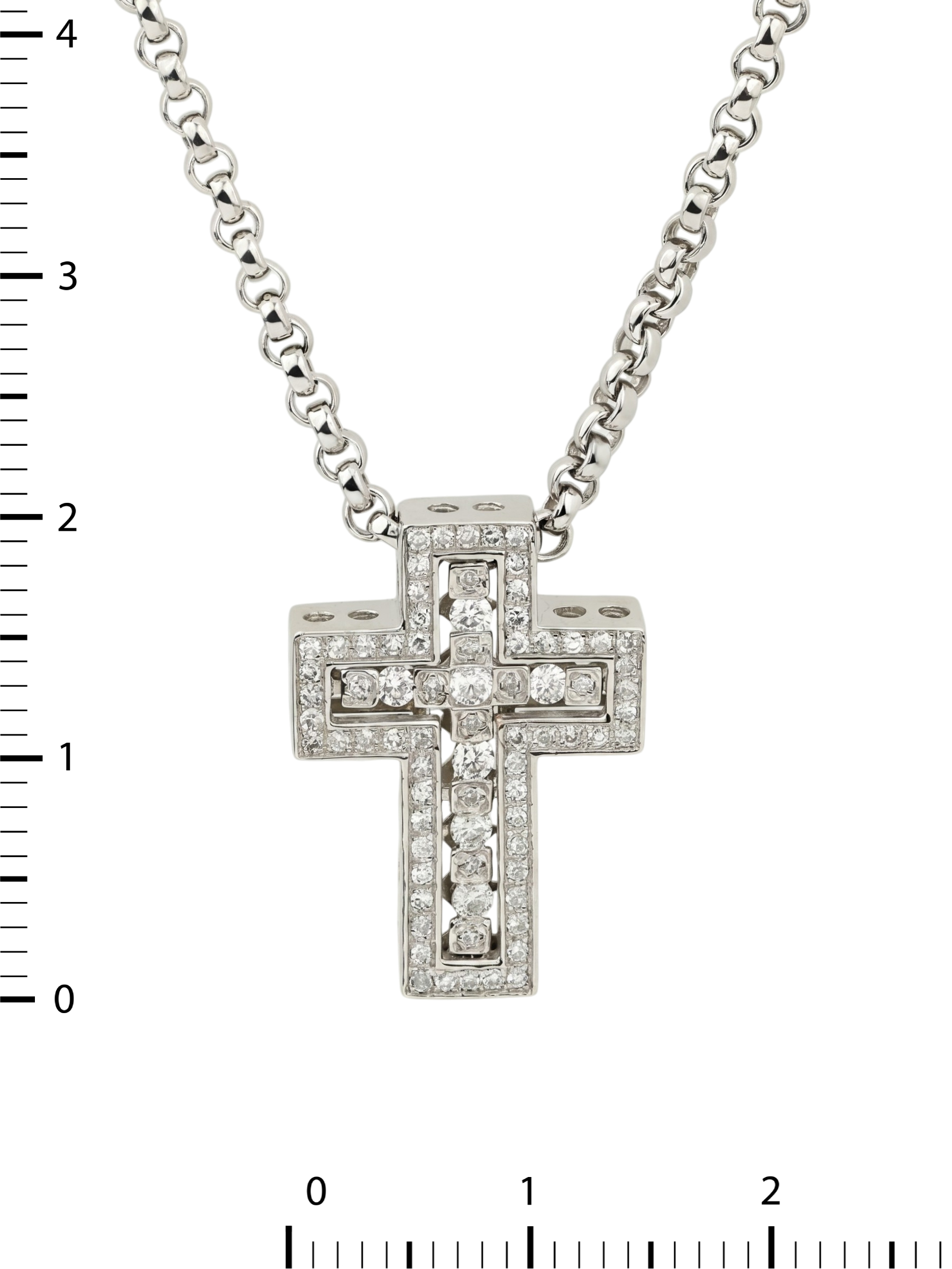 Центральную композицию украшают 75 бриллиантов круглой огранки с безупречным белым цветом вставок. Тщательно отобранные камни инкрустированы таким образом, чтобы максимально раскрыть их природное сияние и чистоту. Благодаря выверенным пропорциям и сдержанной эстетике, этот крест с бриллиантами является универсальным украшением — он гармонично смотрится как на женщинах, так и на мужчинах, становясь завершающим штрихом повседневного или вечернего ансамбля.