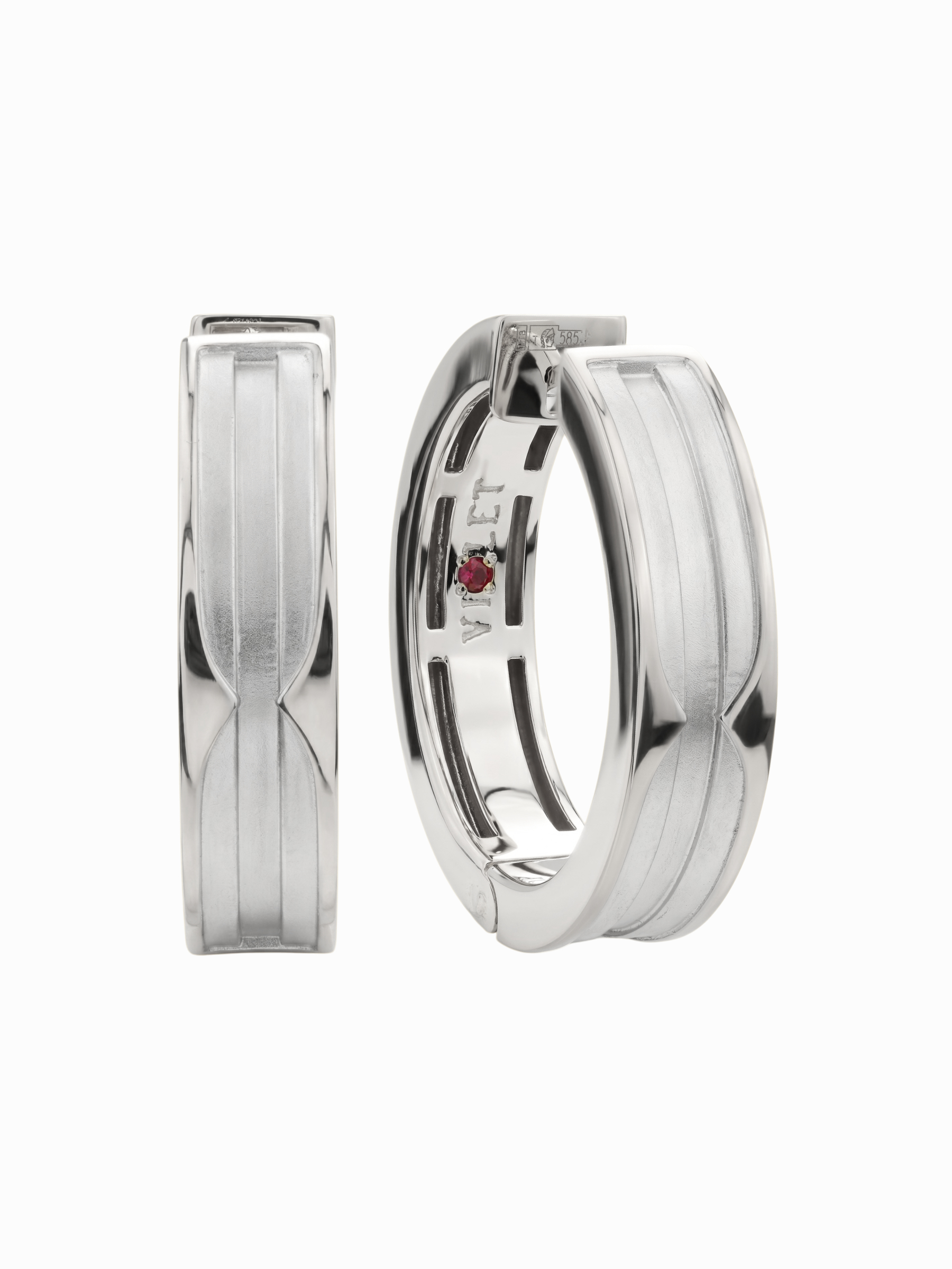 Серьги из белого золота 585 пробы из коллекции Vioretty — DEMETRA представляют собой воплощение современной эстетики и ювелирного мастерства. Это изделие, выполненное в благородном белом цвете, привлекает внимание своей лаконичной геометрической формой и продуманными деталями дизайна. Отличительной особенностью модели является скрытый акцент — по одной инкрустации в каждом украшении. В качестве вставок использованы 2 натуральных рубина ярко-красного цвета с огранкой формы круг, которые придают строгому металлу особую выразительность.