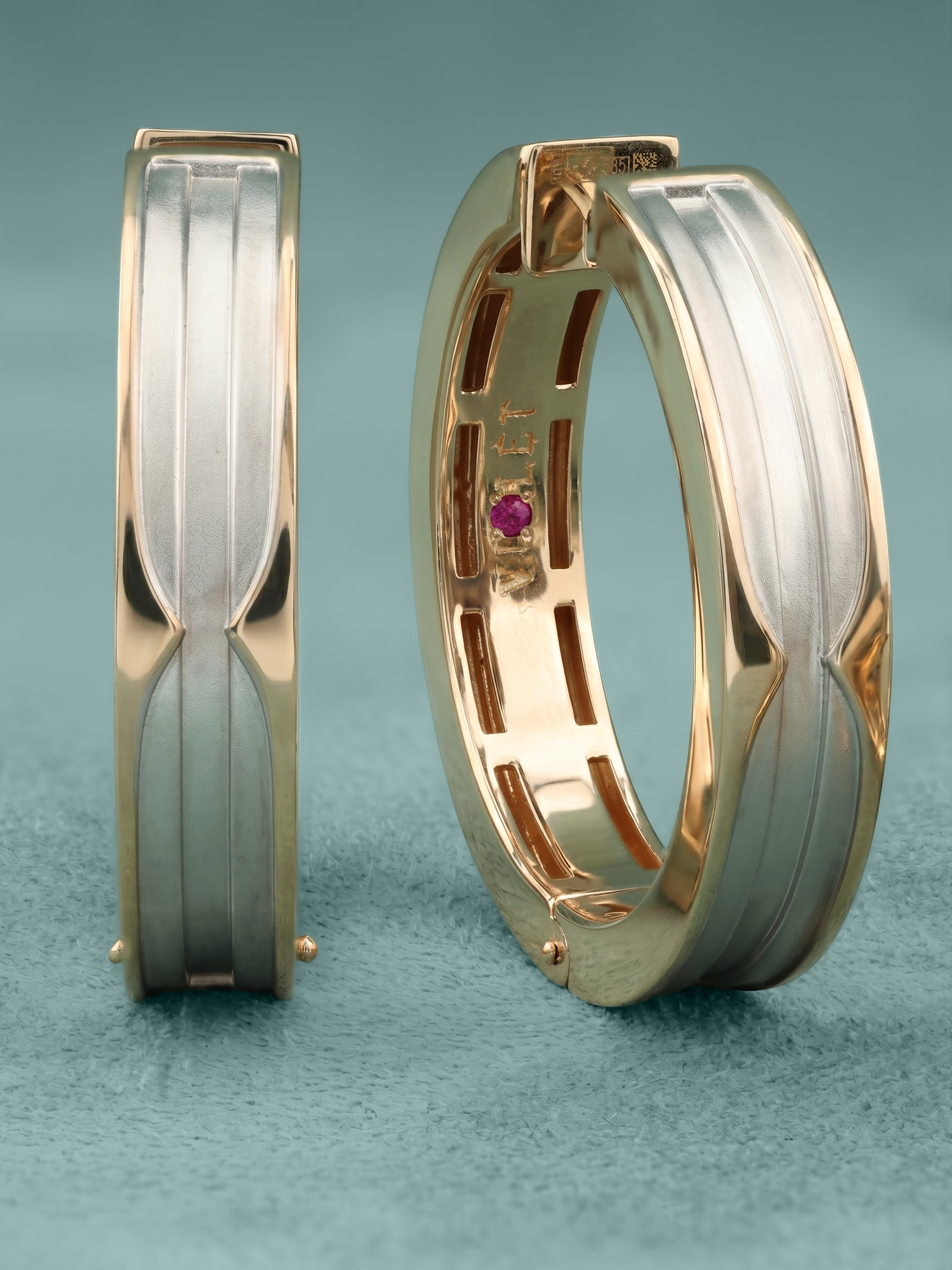 Центральным акцентом дизайна выступает искусно скрытый элемент декора — красная вставка из натурального рубина. В изделии использовано 2 вставки круглой формы, которые гармонично дополняют общую композицию. Красное золото высокого качества обеспечивает долговечность и безупречный блеск аксессуара, а продуманная геометрия формы подчеркивает статус владельца. Серьги прекрасно смотрятся как самостоятельное украшение, так и в составе готовых комплектов, позволяя создавать завершенные ювелирные ансамбли для особых случаев или повседневного ношения.
