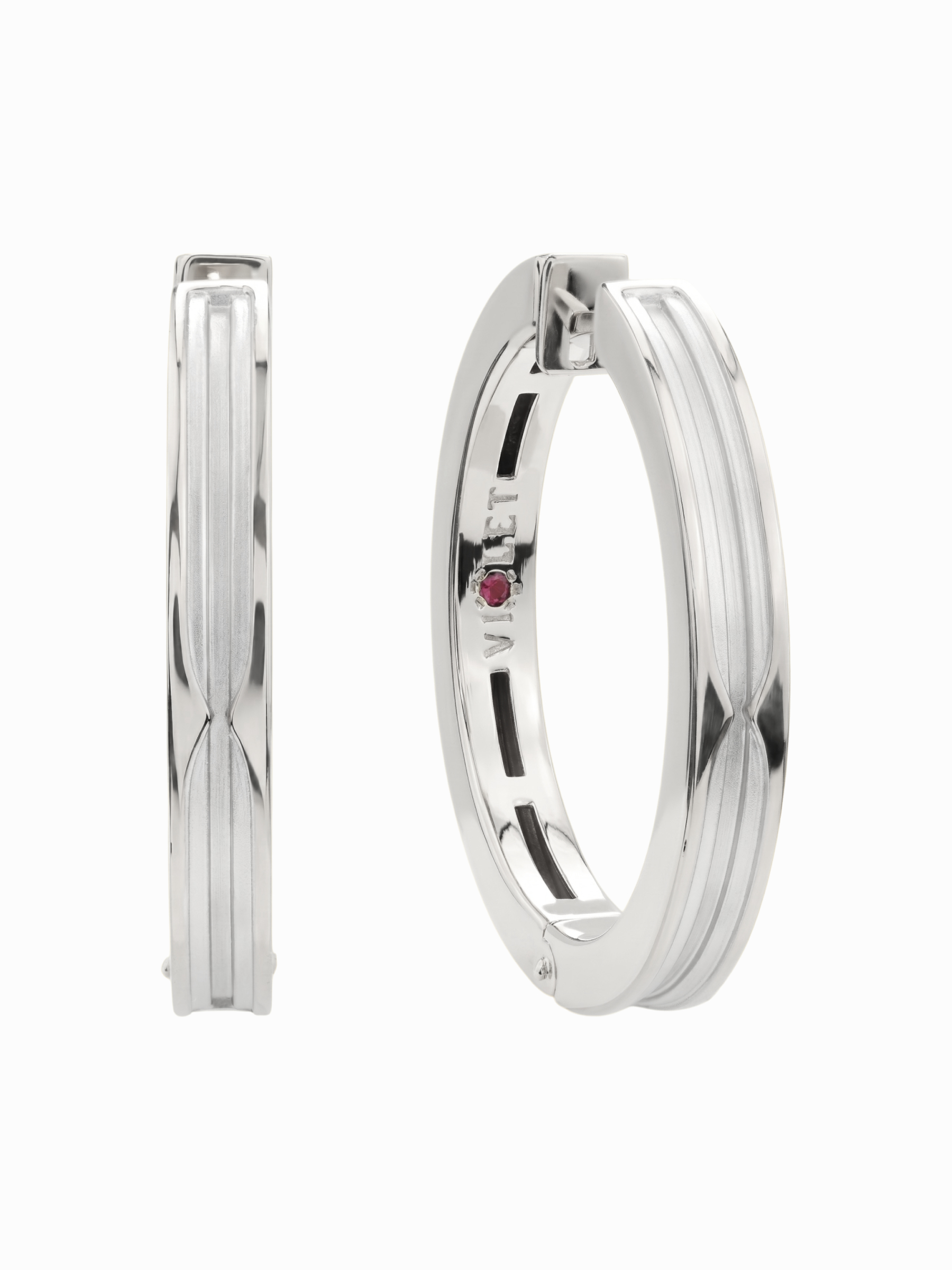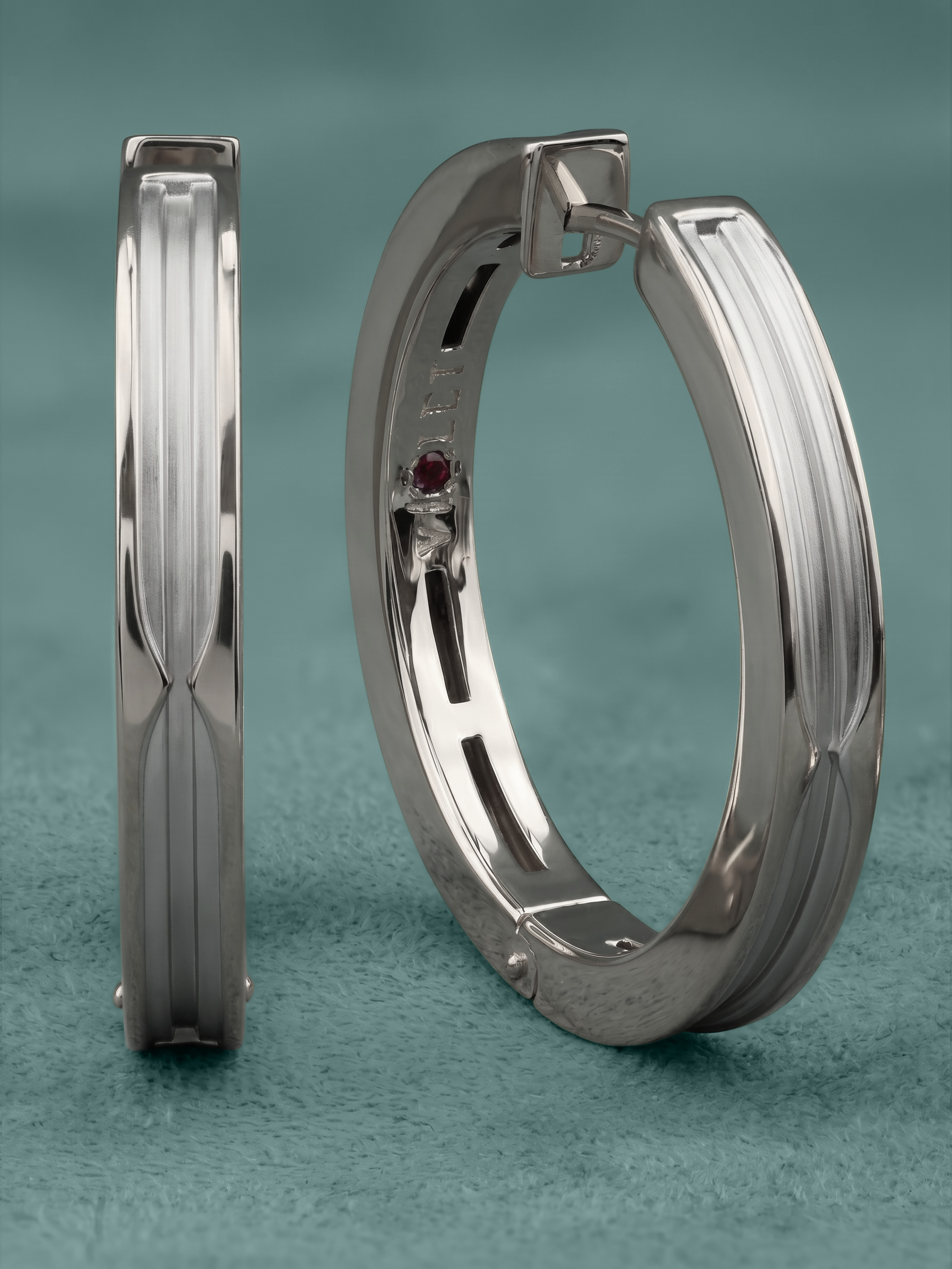Центральным акцентом украшения стали два драгоценных рубина, имеющие классическую форму круга. Красный цвет вставок эффектно контрастирует с белым металлом, создавая выразительный визуальный акцент. Тщательно продуманная форма серег позволяет им гармонично вписаться в образ, придавая ему завершенность и нотку эксклюзивности.