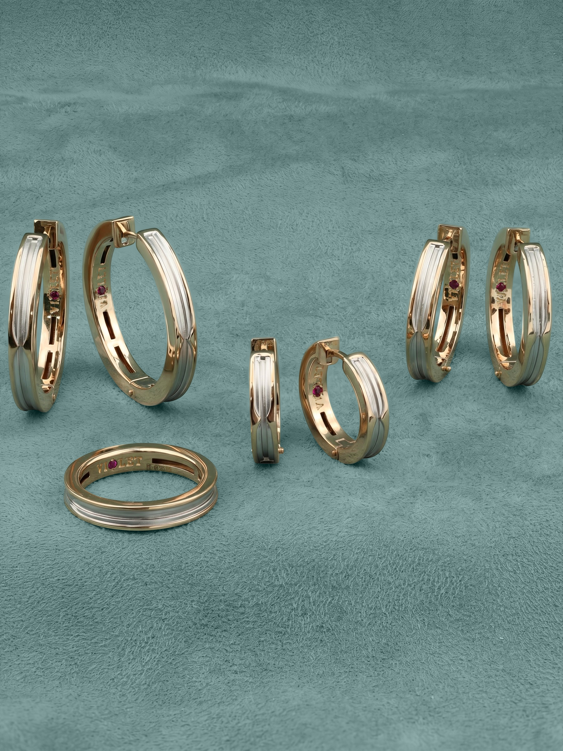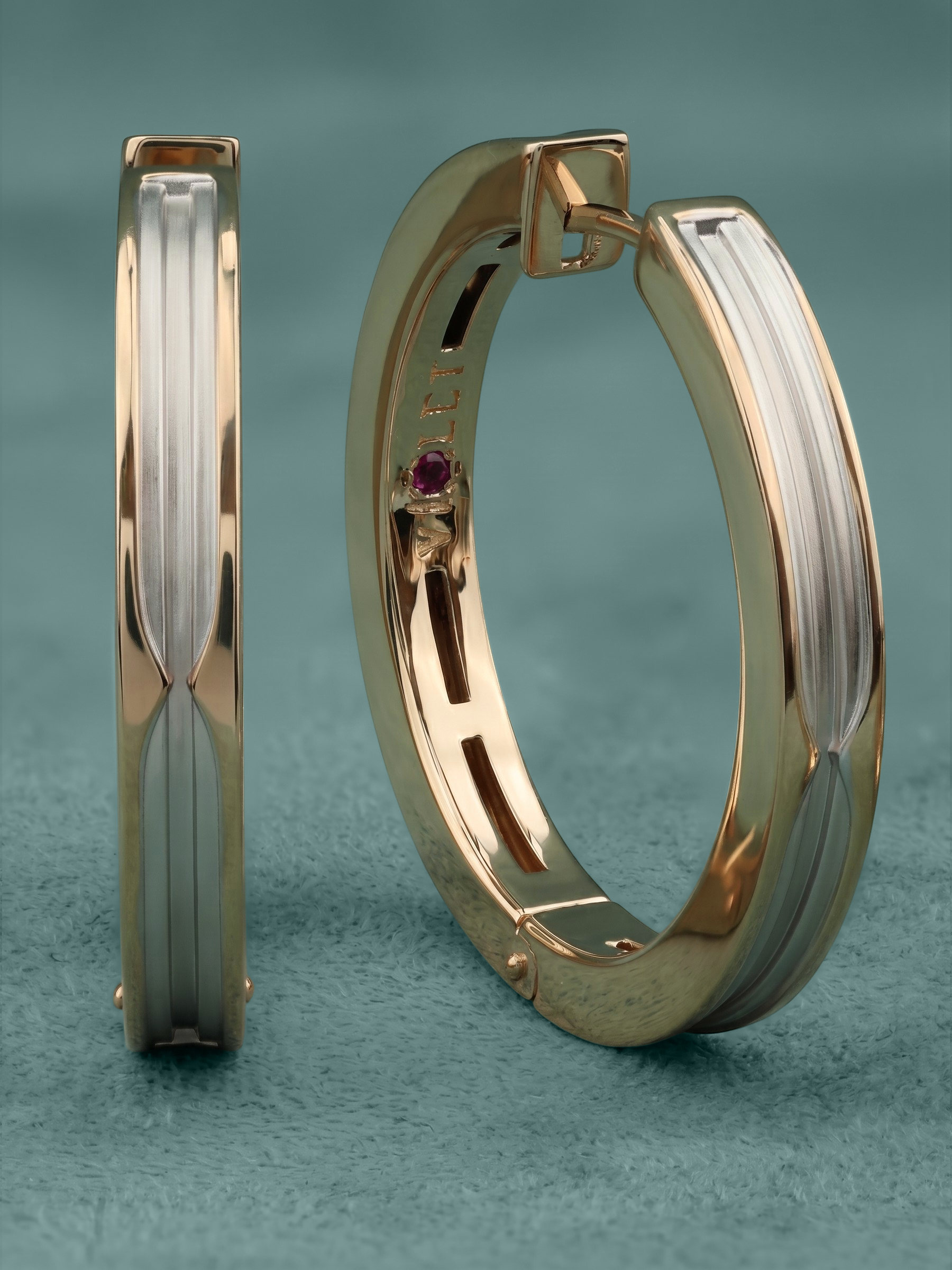 Особую выразительность украшению придает вставка: каждый аксессуар дополнен рубином насыщенного красного цвета. Форма вставок — круг, что идеально гармонирует с мягкими линиями самих серег. Всего в изделии использовано 2 вставки, которые деликатно вписаны в конструкцию, создавая акцент, заметный лишь при близком рассмотрении. Это делает украшение не только статусным, но и интригующим.