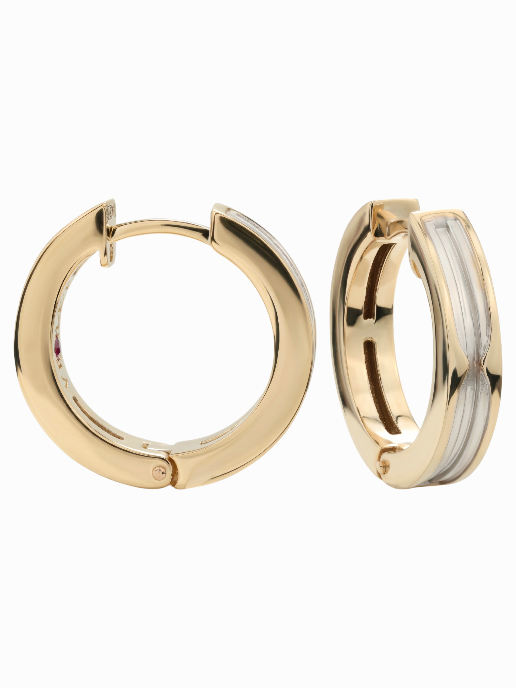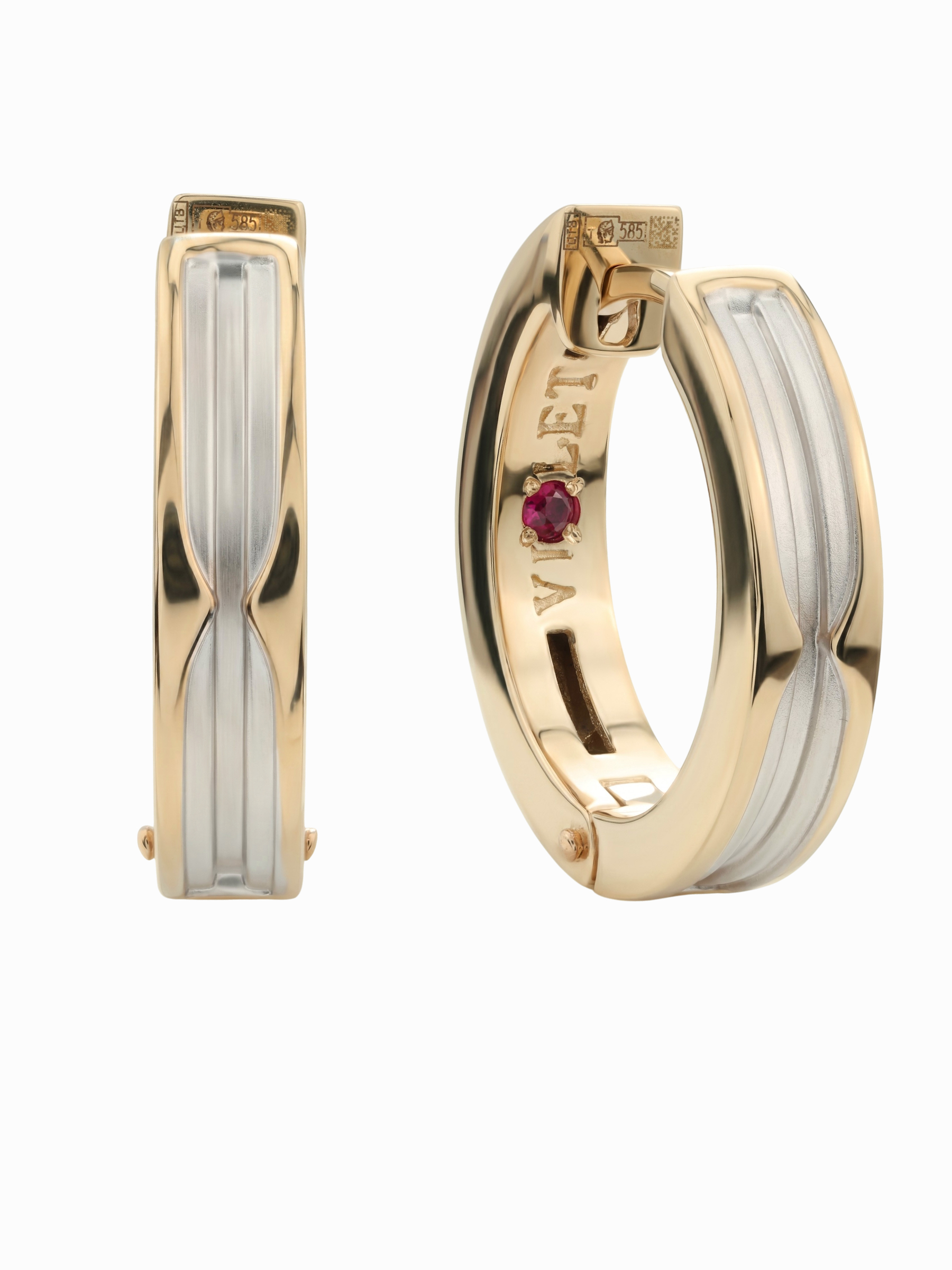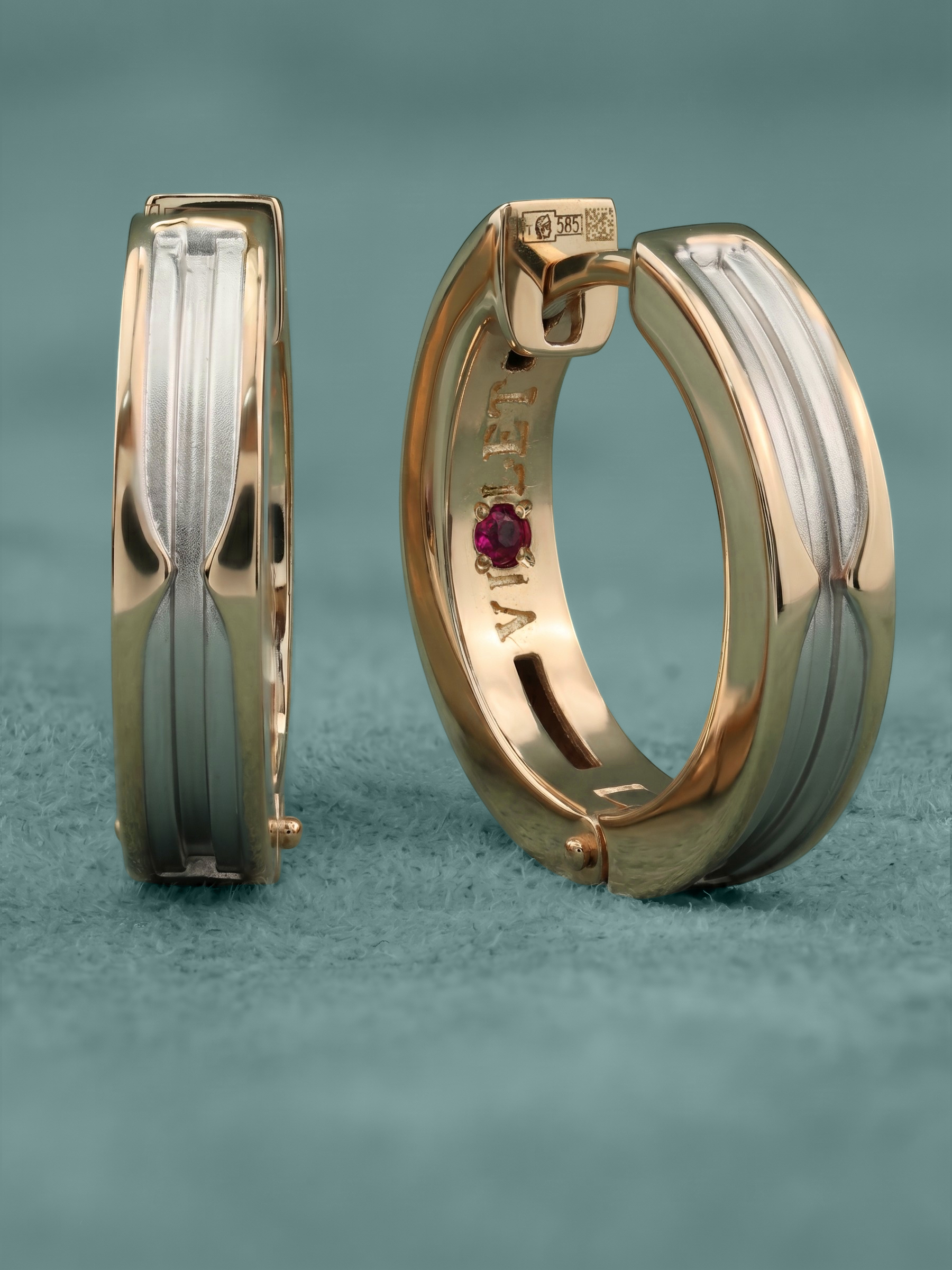 Особую выразительность украшению придает акцентная деталь — вставка из красного рубина круглой формы, расположенная во внутренней части обода. Всего в изделии использовано 2 вставки, создающие деликатный, но узнаваемый визуальный эффект. Мастерство исполнения подчеркивает благородный блеск красного золота, делая эти серьги универсальным выбором как для женщин, так и для мужчин. Лаконичная геометрия формы позволяет сочетать их с другими украшениями, создавая полноценные комплекты.