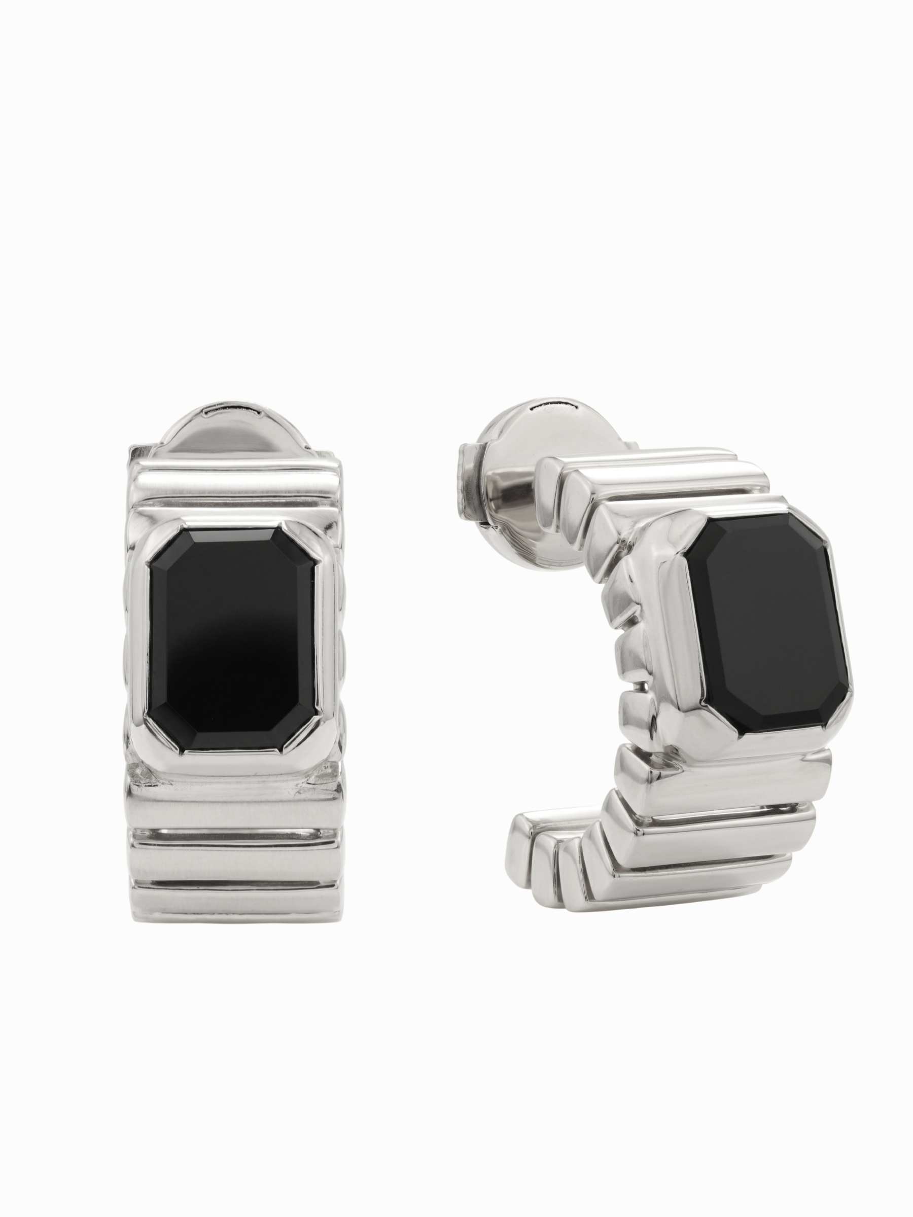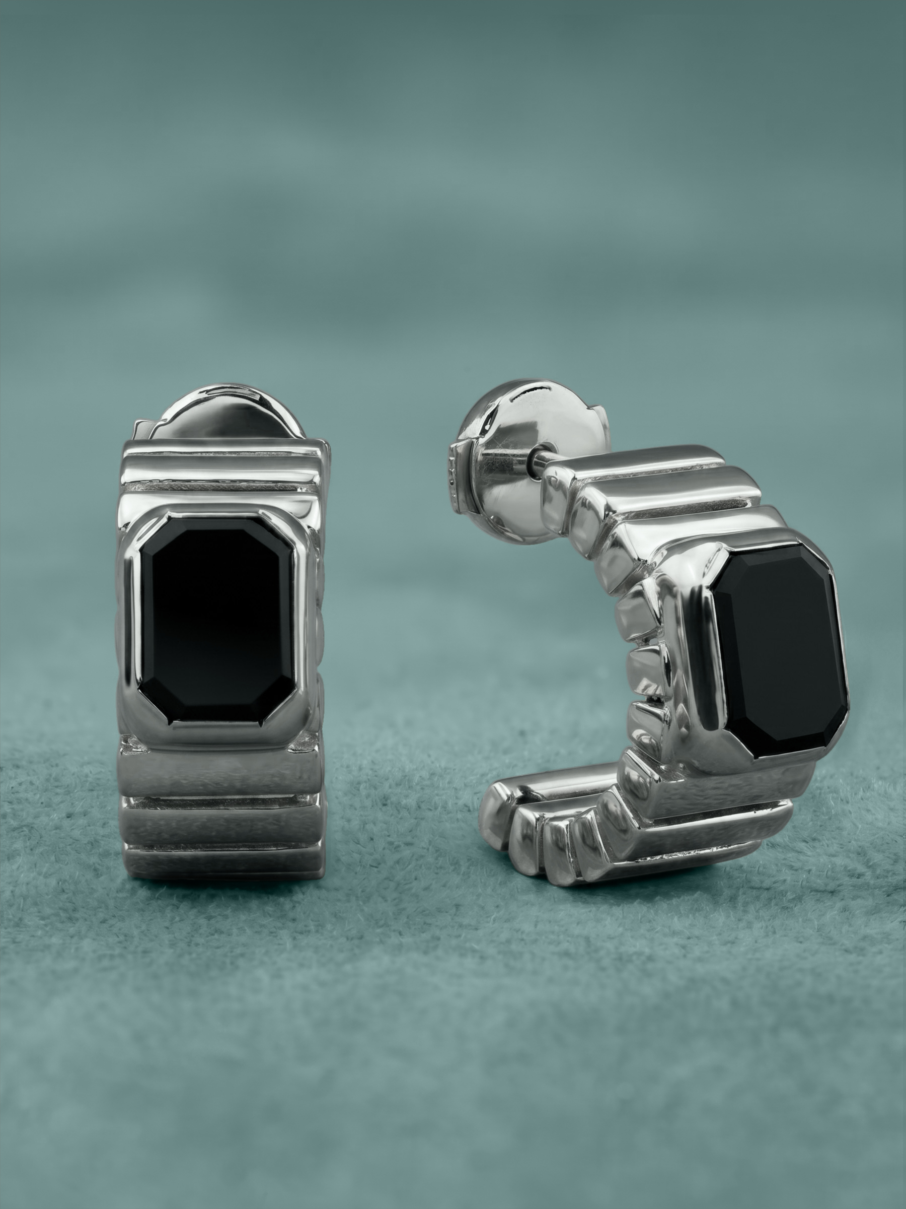 Центральным элементом композиции являются два черных оникса, ограненных в форме октагона. Глубокий, насыщенный цвет вставок эффектно контрастирует с холодным блеском белого золота, создавая стильный и современный визуальный эффект. Качественное исполнение и продуманные линии придают серьгам выразительный характер, позволяя им гармонично вписываться как в деловой дресс-код, так и в вечерние аутфиты.