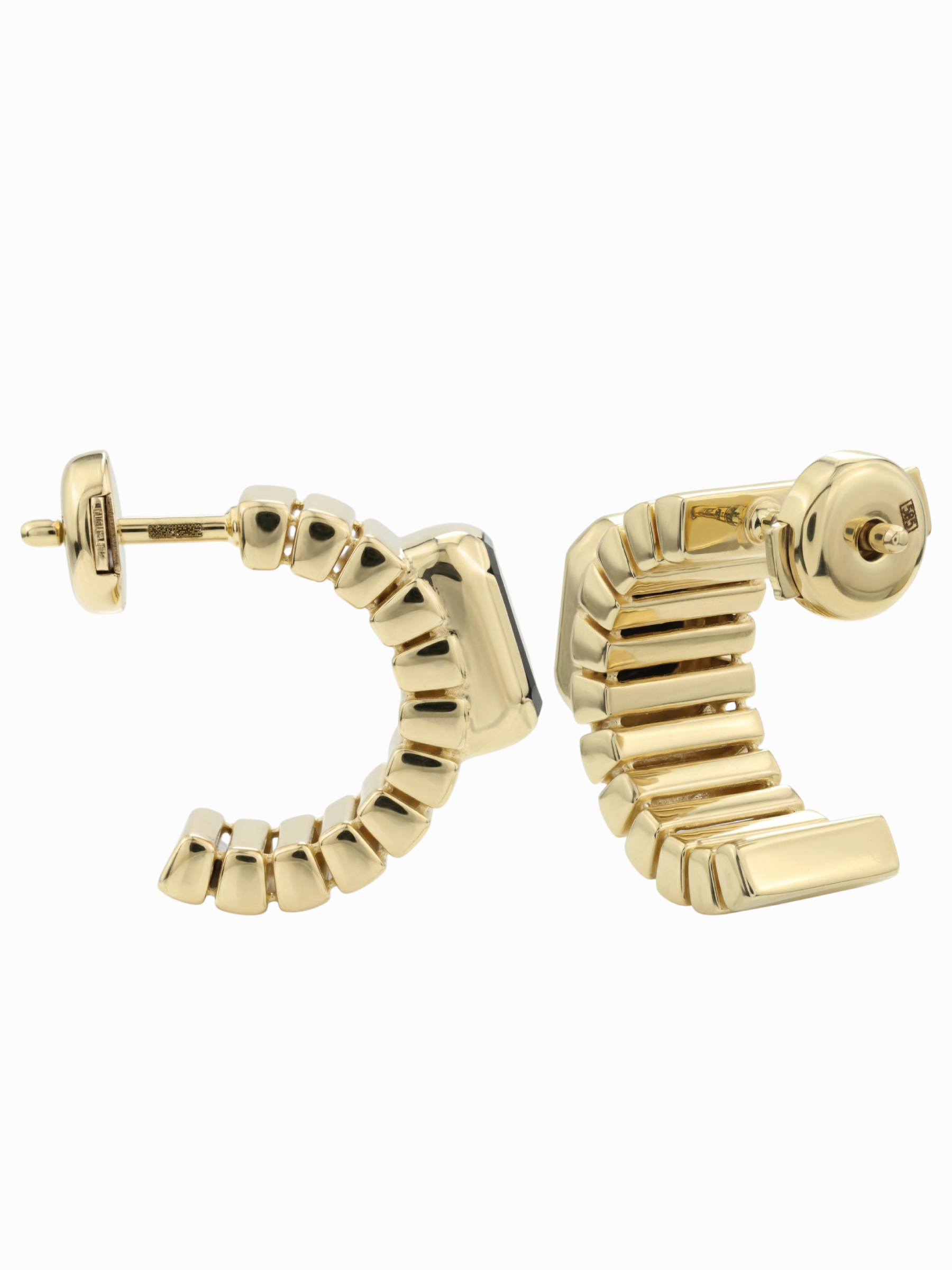 Откройте для себя воплощение современной эстетики с этими изысканными серьгами, выполненными в благородном лимонном золоте 585 пробы. Украшения из коллекции Vioretty — Geometria притягивают взгляд своим строгим, но выразительным геометрическим дизайном. Центральным элементом композиции выступает глубокий черный оникс: две вставки насыщенного темного цвета эффектно контрастируют с теплым сиянием драгоценного металла.