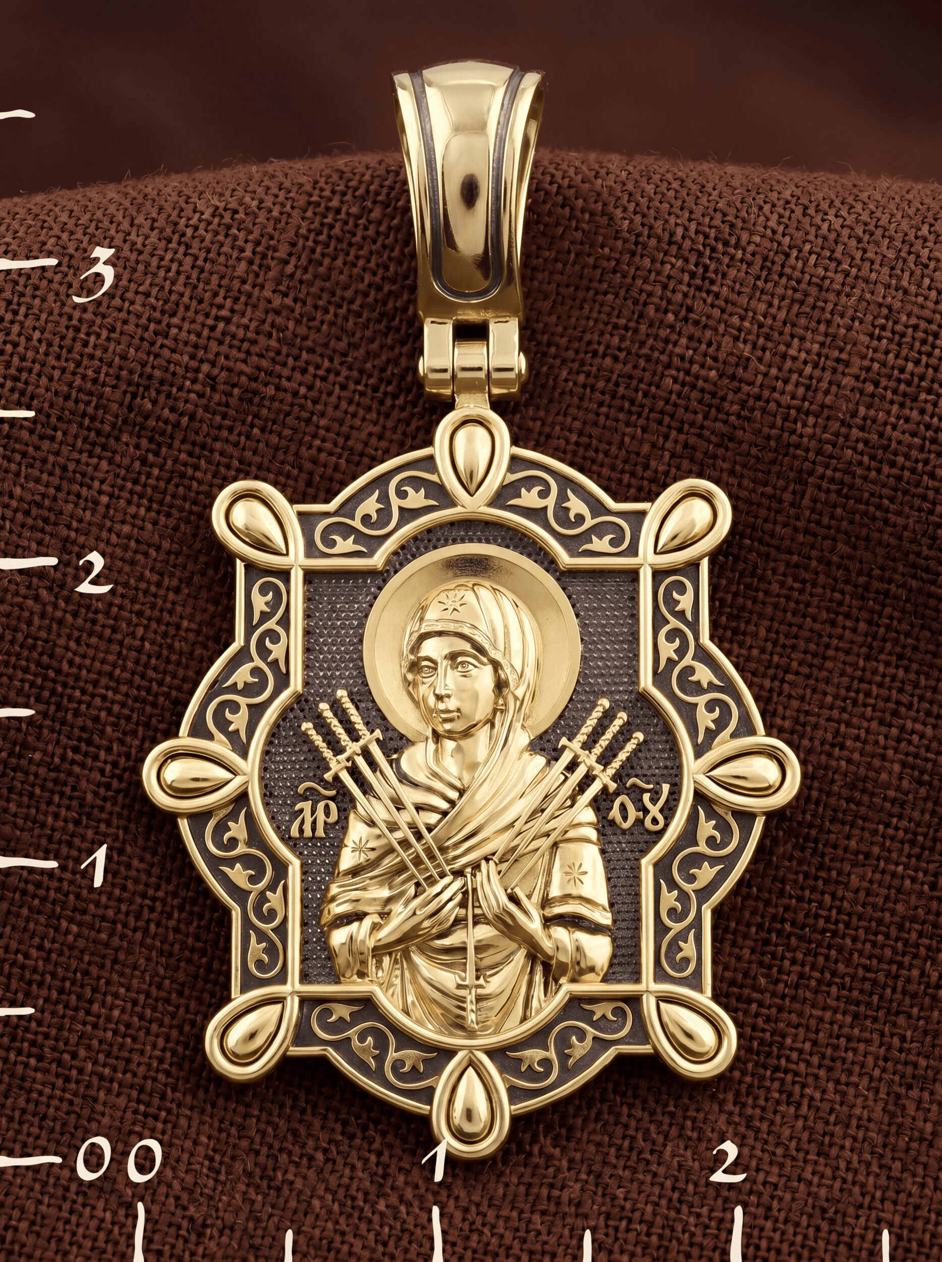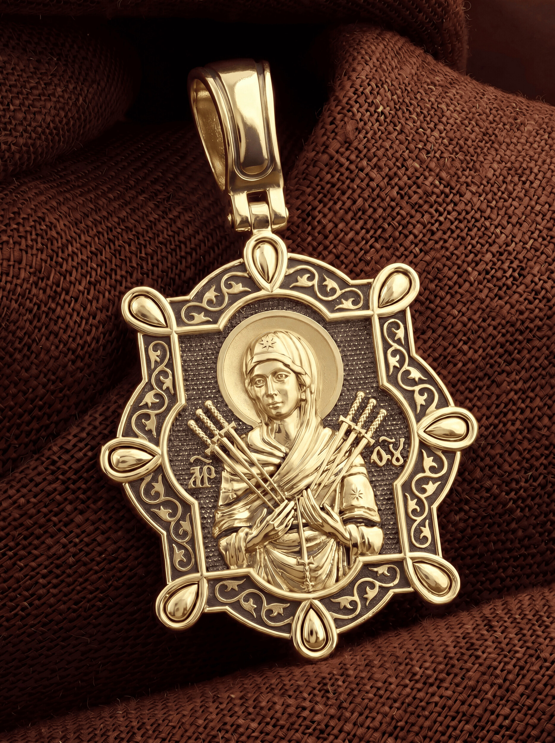 На лицевой стороне образка изображена икона Пресвятой Богородицы «Семистрельная» — одна из самых чудотворных икон на Руси. На протяжении многих веков христиане взывали к Царице Небесной через эту икону, если в стране начинались войны или мятежи.