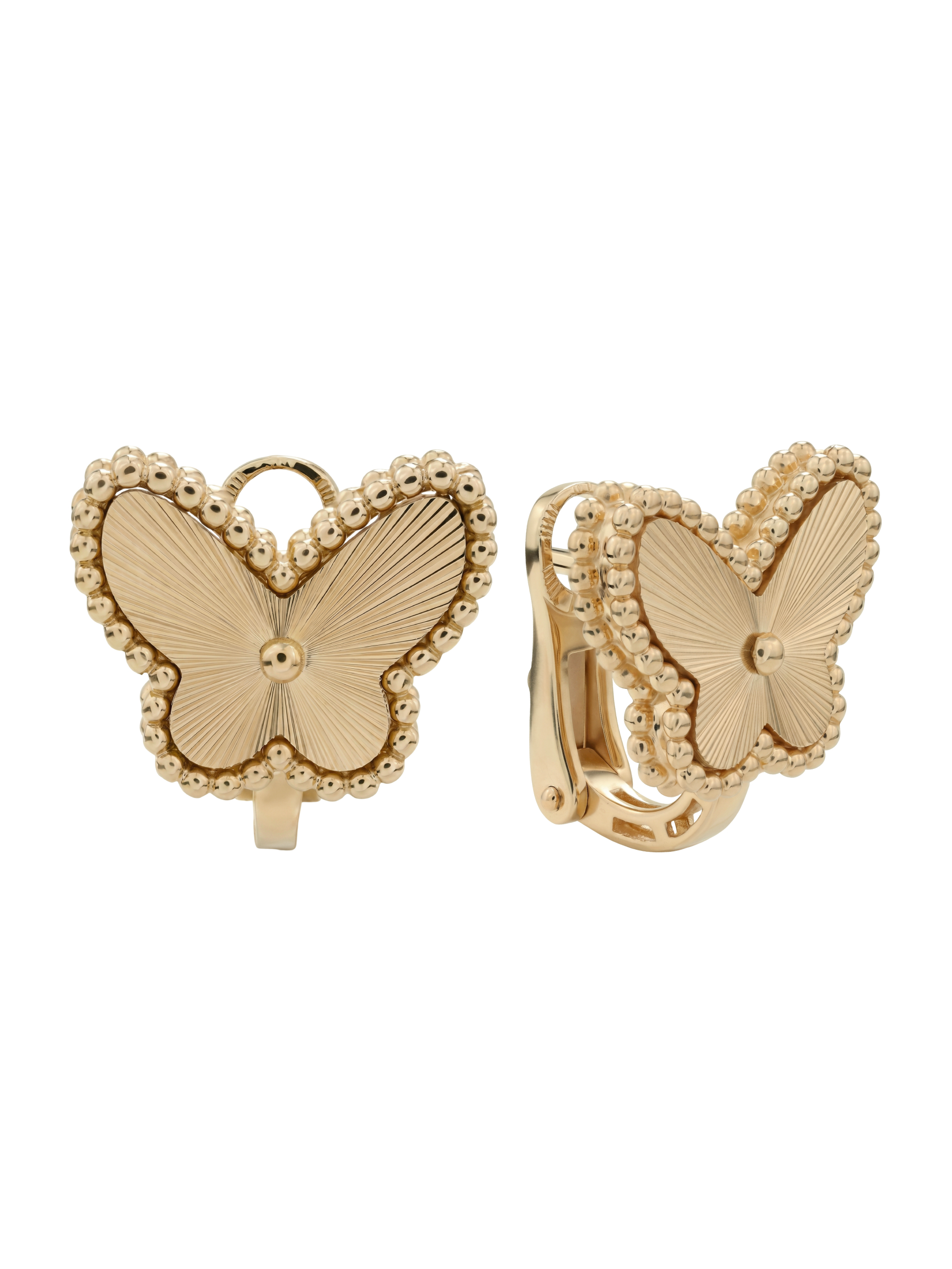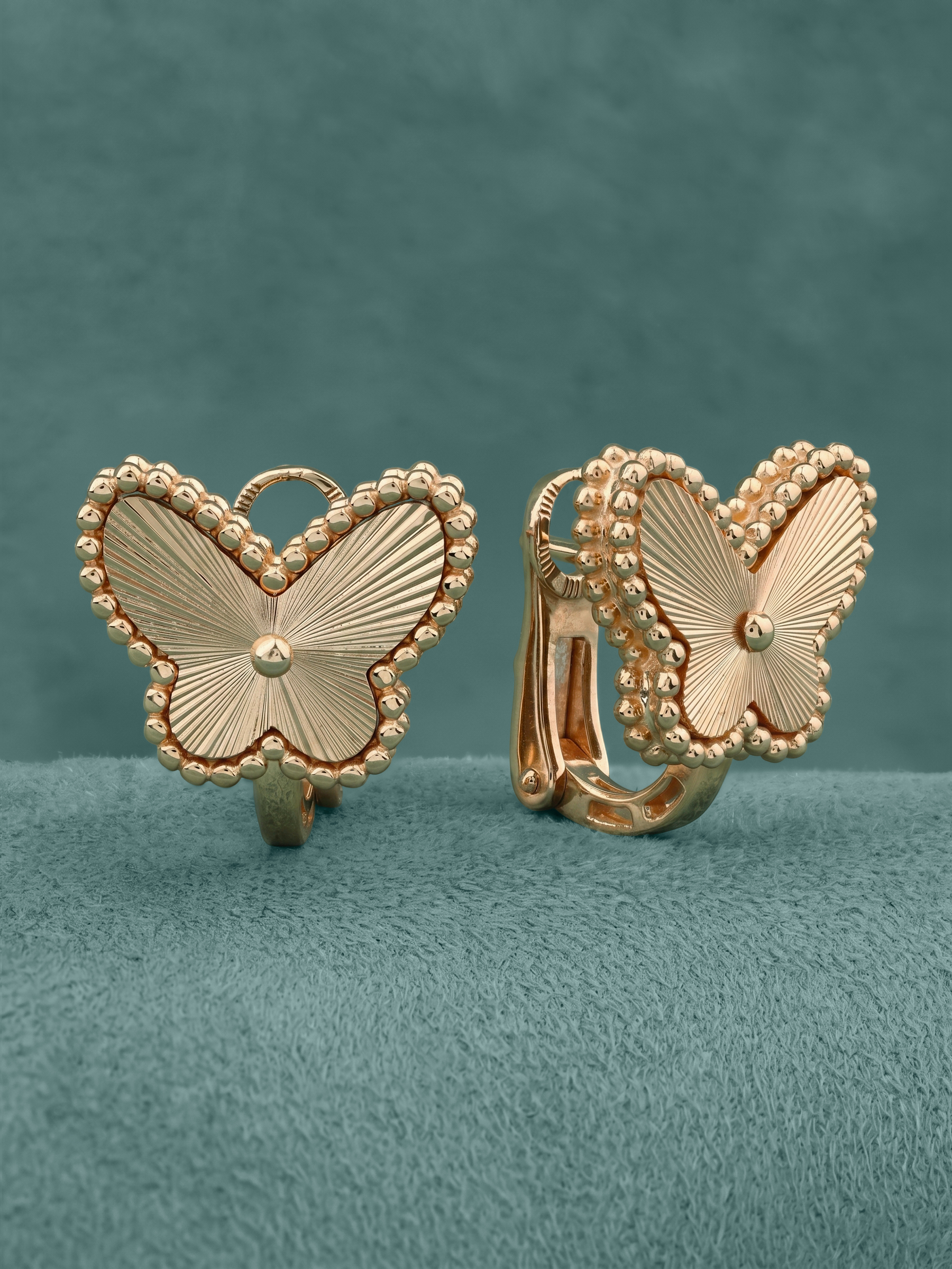 Элегантные серьги из красного золота 585 пробы из коллекции Vioretty — Farfalla станут воплощением утонченного стиля и природной красоты. Дизайн изделия вдохновлен легкостью и грацией бабочек, чьи контуры аккуратно обрамлены изящными золотыми бусинами. Ювелиры мастерски проработали детали: поверхность крыльев украшена тонким радиальным гравированием, которое эффектно играет на свету, подчеркивая благородный оттенок красного металла.