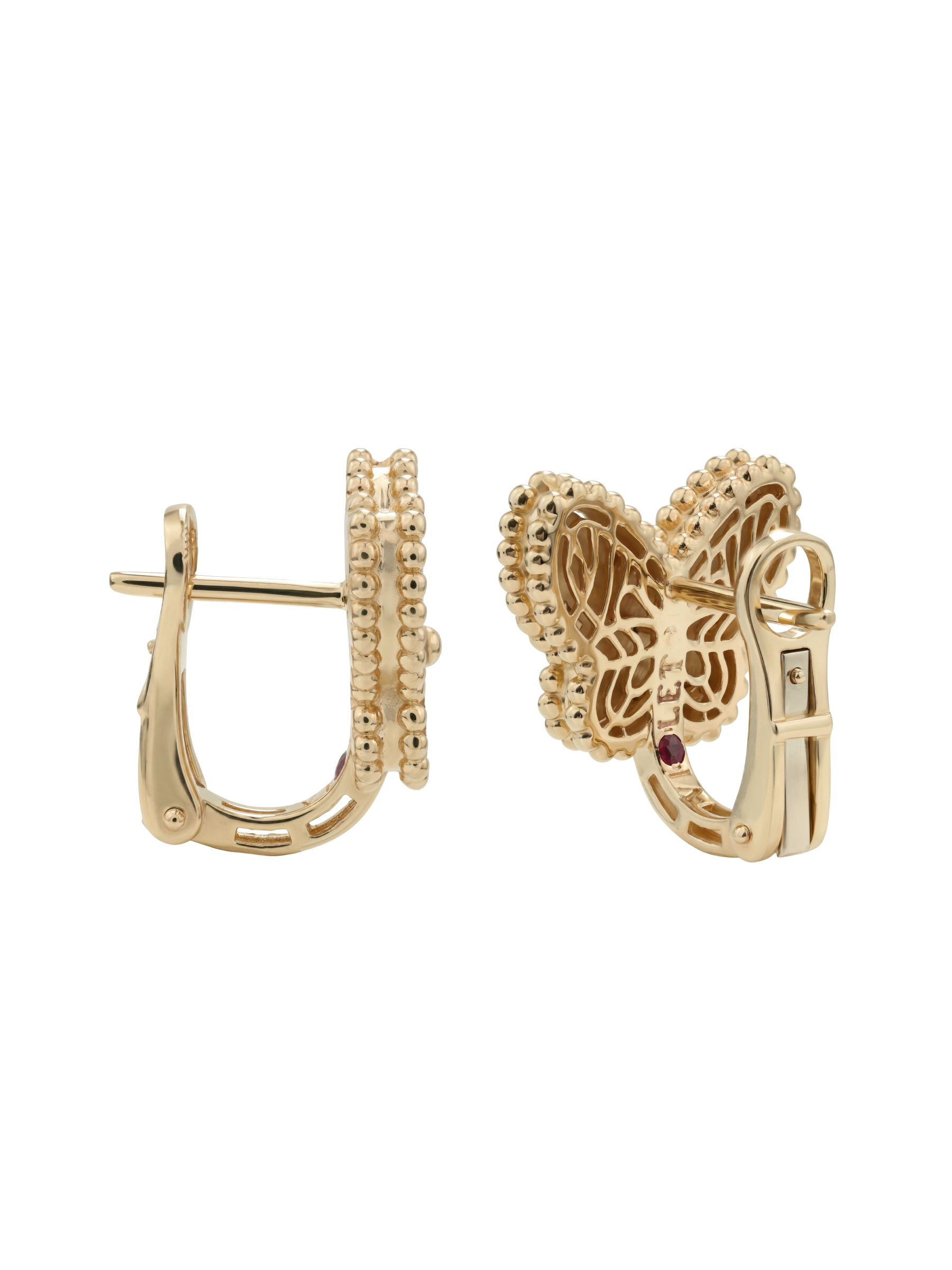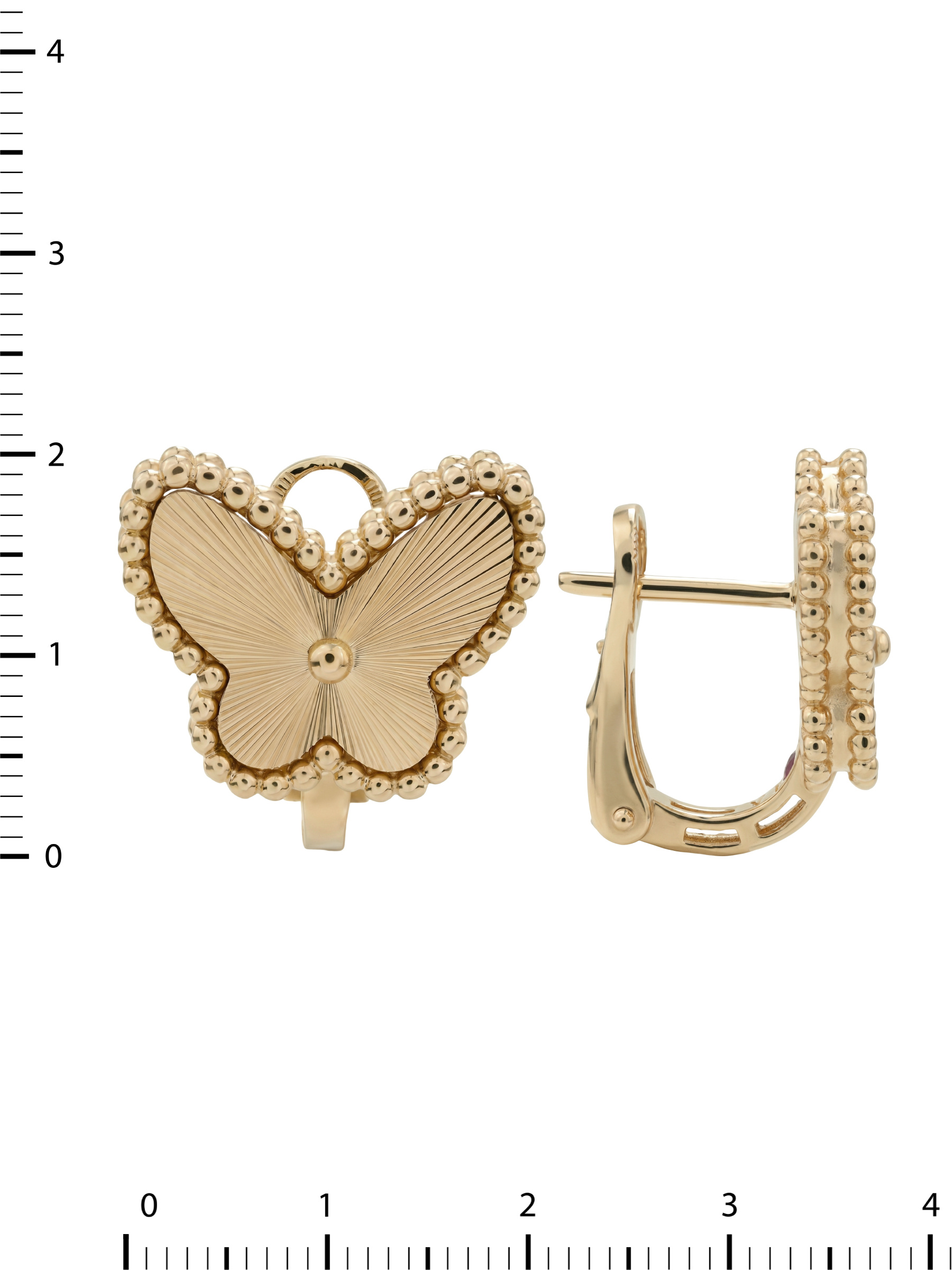 В центре композиции размещены два рубина круглой формы, которые гармонично дополняют дизайн своими глубокими красными переливами. Контраст между фактурным золотом и блеском драгоценных вставок создает неповторимый визуальный акцент. Серьги обладают продуманной эргономикой, обеспечивая комфортную посадку при ежедневном ношении.