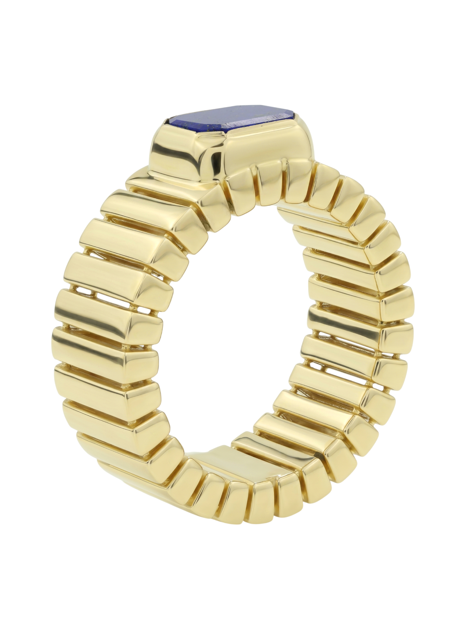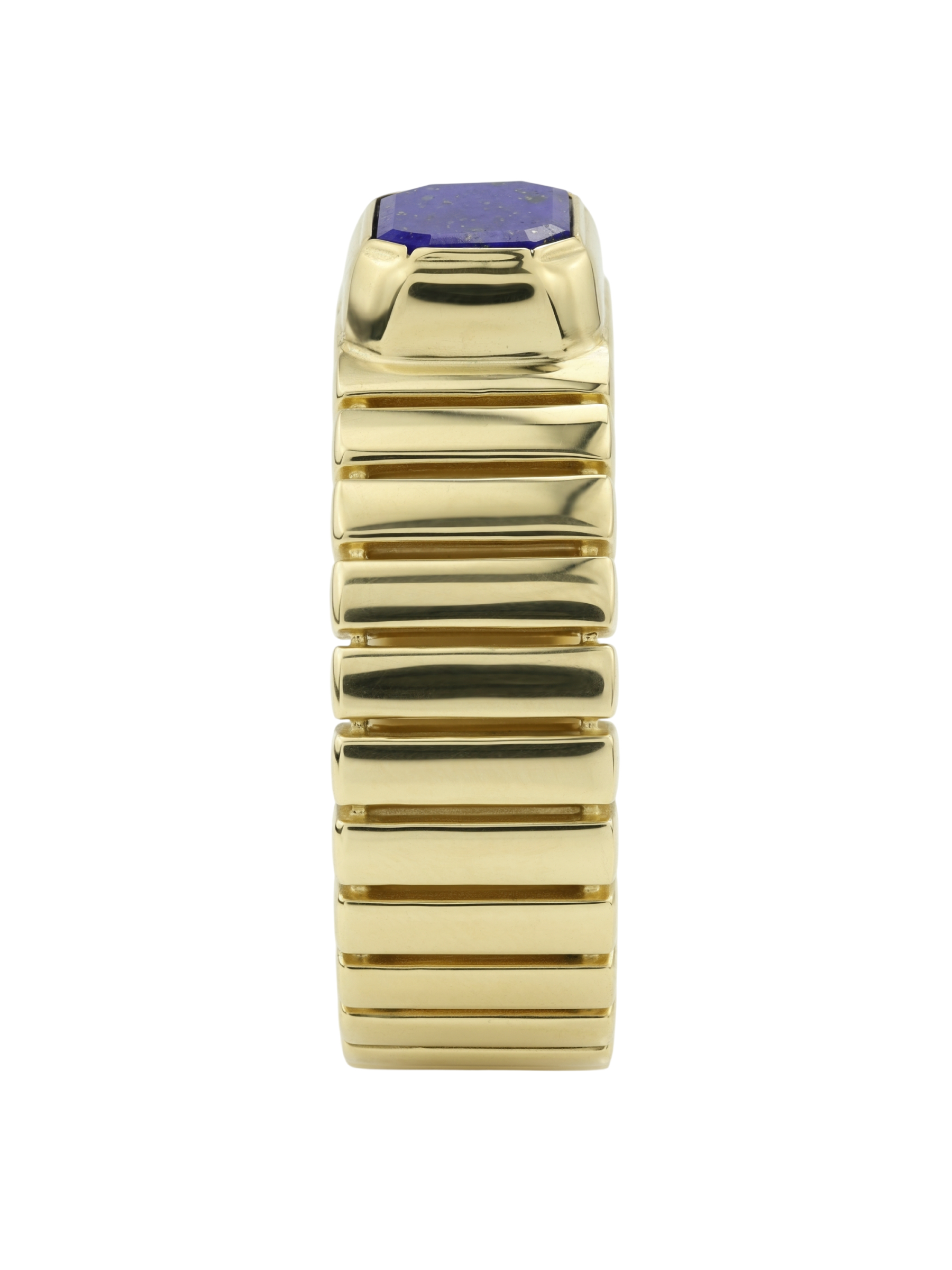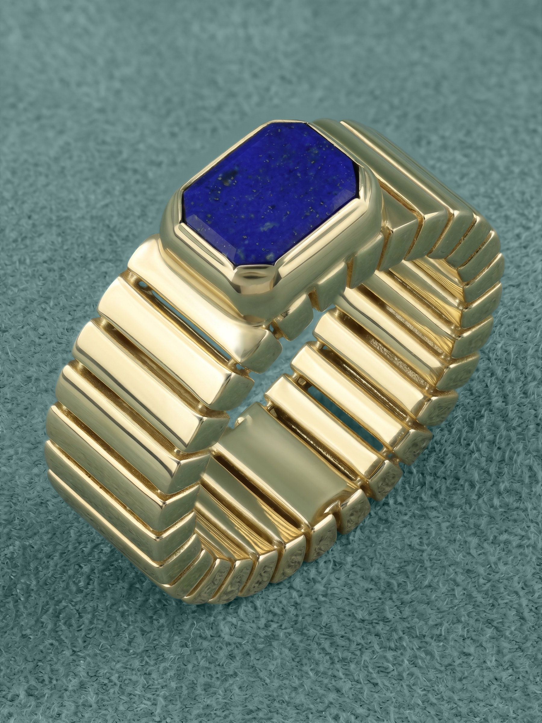 Центральным акцентом композиции стал глубокий синий лазурит, ограненный в форме правильного октагона. Контраст между насыщенным цветом вставки и теплым блеском лимонного золота придает кольцу особый шарм и индивидуальность. Единственная крупная вставка акцентирует внимание на безупречности линий, делая украшение заметным и запоминающимся элементом образа. Это кольцо создано для тех, кто ценит в ювелирных изделиях характер, архитектурный подход к форме и долговечность драгоценных материалов.