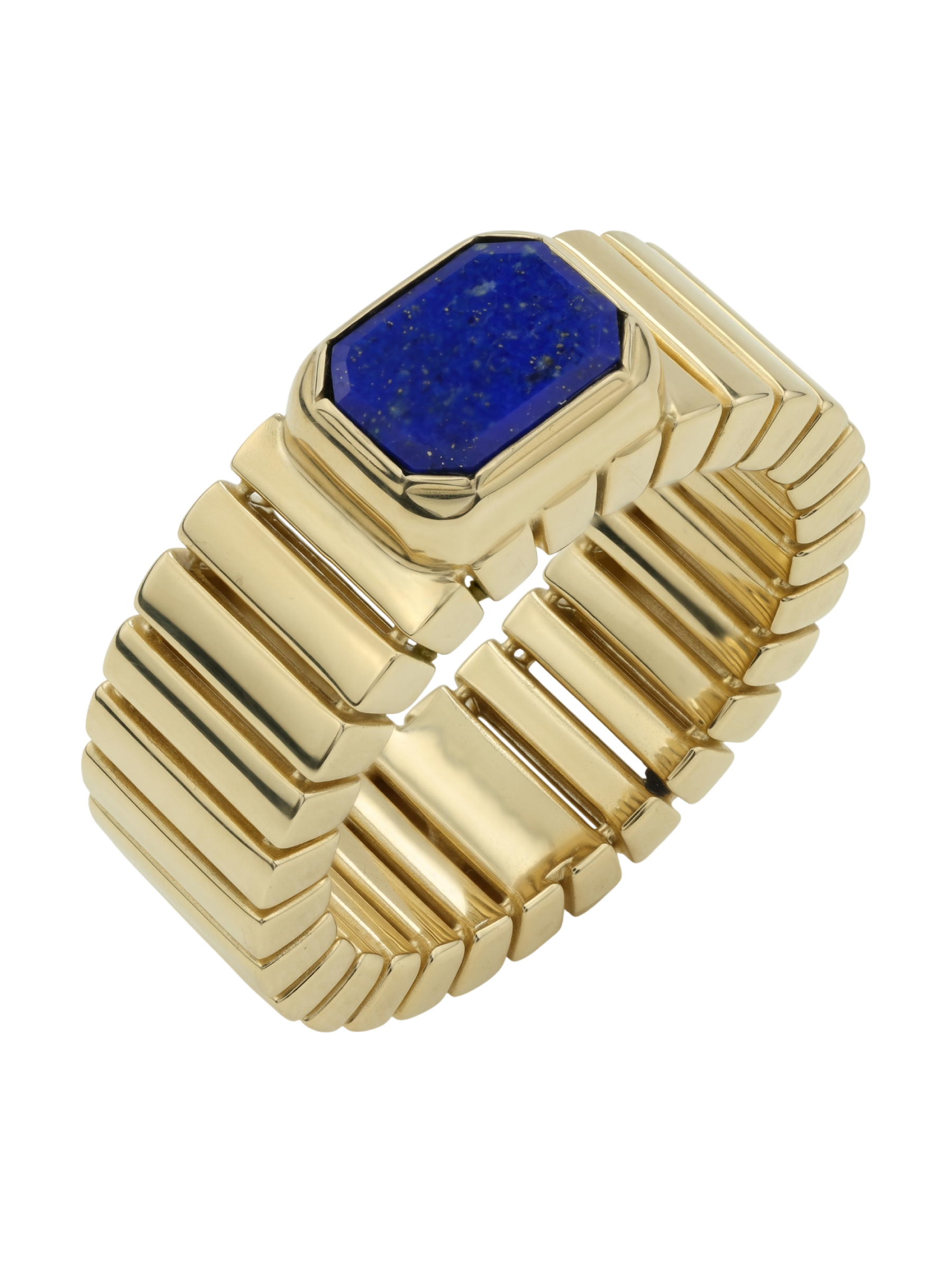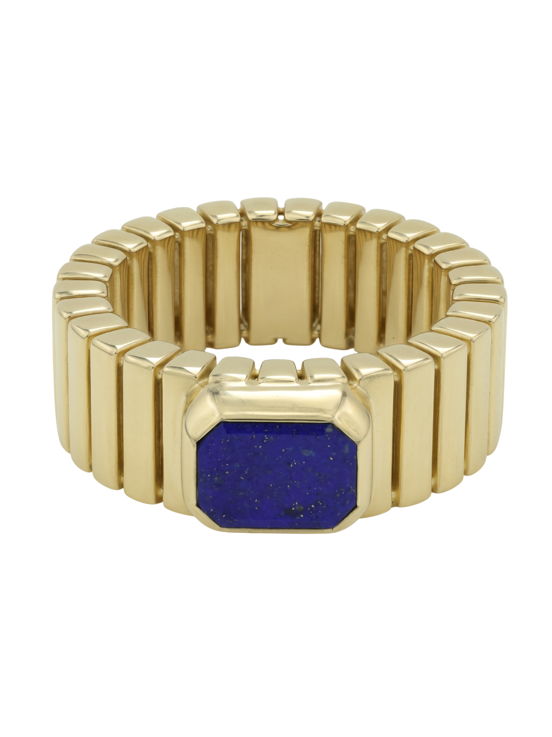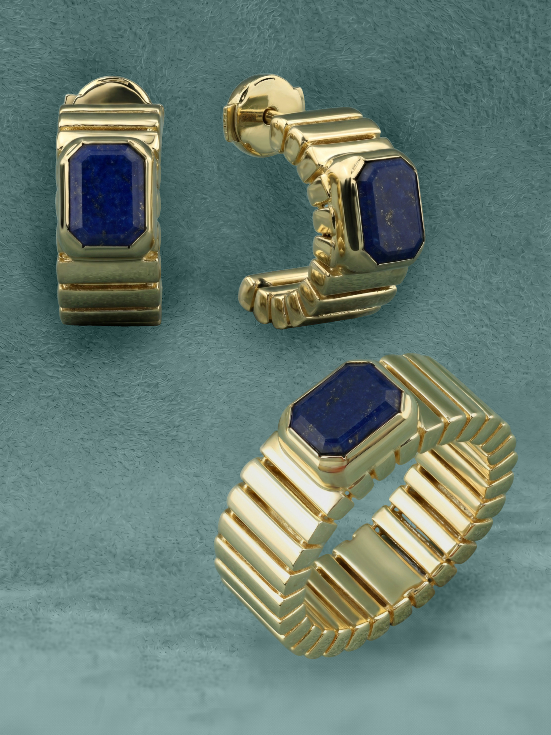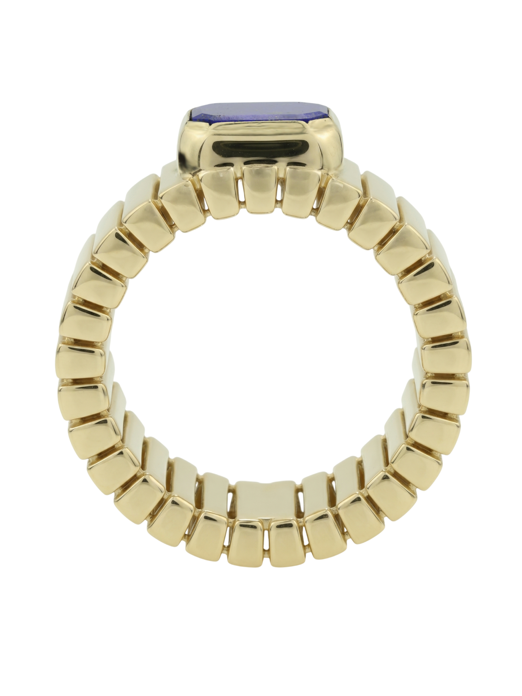 Центральным акцентом композиции стал глубокий синий лазурит, ограненный в форме правильного октагона. Контраст между насыщенным цветом вставки и теплым блеском лимонного золота придает кольцу особый шарм и индивидуальность. Единственная крупная вставка акцентирует внимание на безупречности линий, делая украшение заметным и запоминающимся элементом образа. Это кольцо создано для тех, кто ценит в ювелирных изделиях характер, архитектурный подход к форме и долговечность драгоценных материалов.