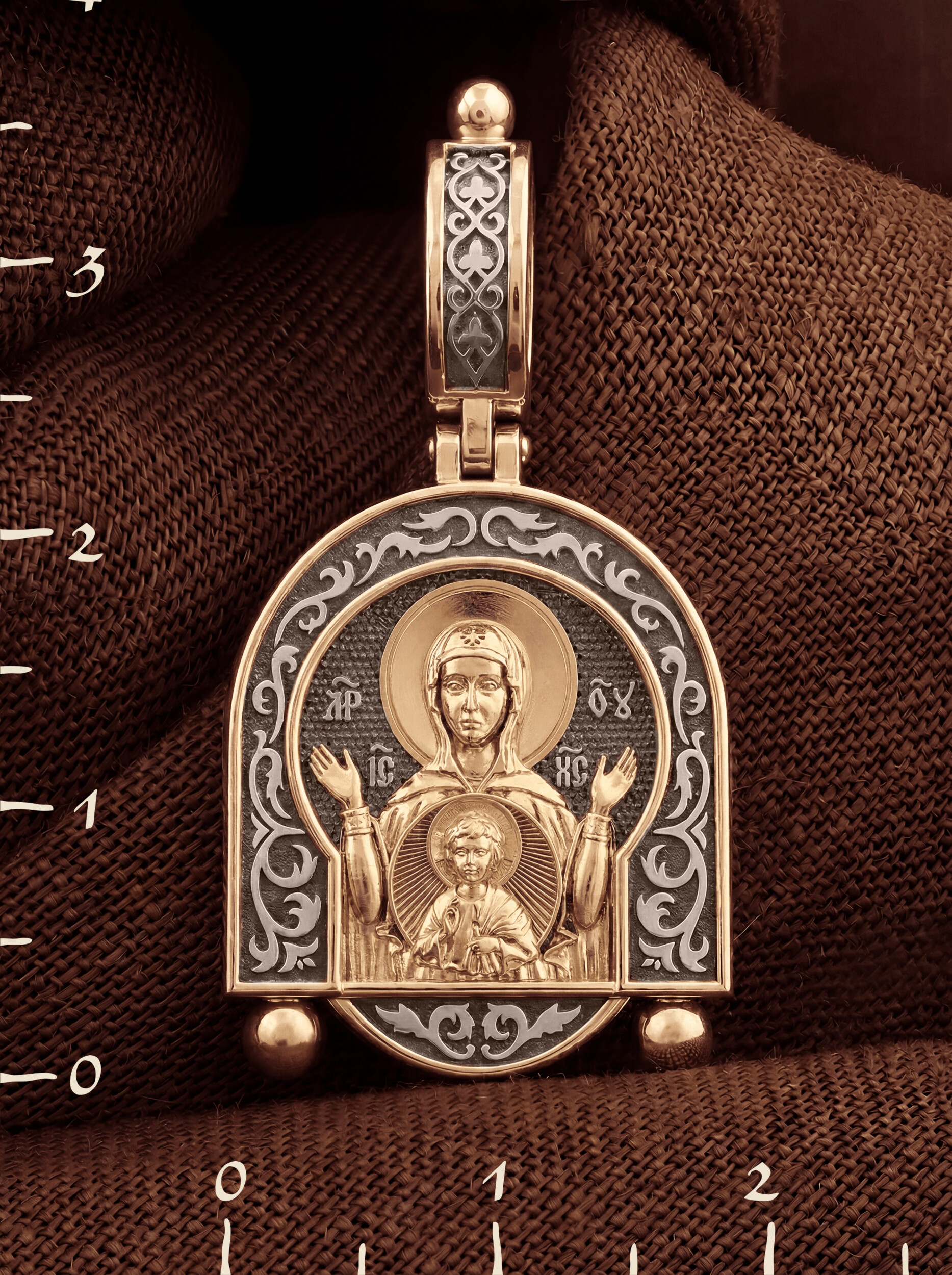 В центр образка помещен образ Божией Матери «Знамение», прославившийся многими чудесами в Новгороде в XII веке. Икона эта чтится как одна из самых великих святынь Русской земли. Молитвенно воздетые руки Богородицы означают заступничество за людей пред Богом. Рядом с Ней, на фоне круглого щита, — благословляющий Божественный Младенец — Спас-Эммануил.