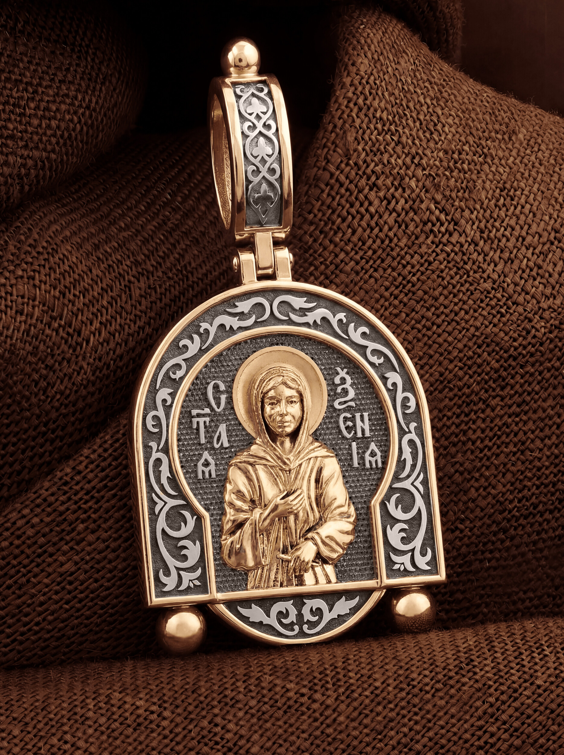 На лицевой стороне образка изображена Святая блаженная Ксения Петербургская, в миру Ксения Григорьевна Петрова.