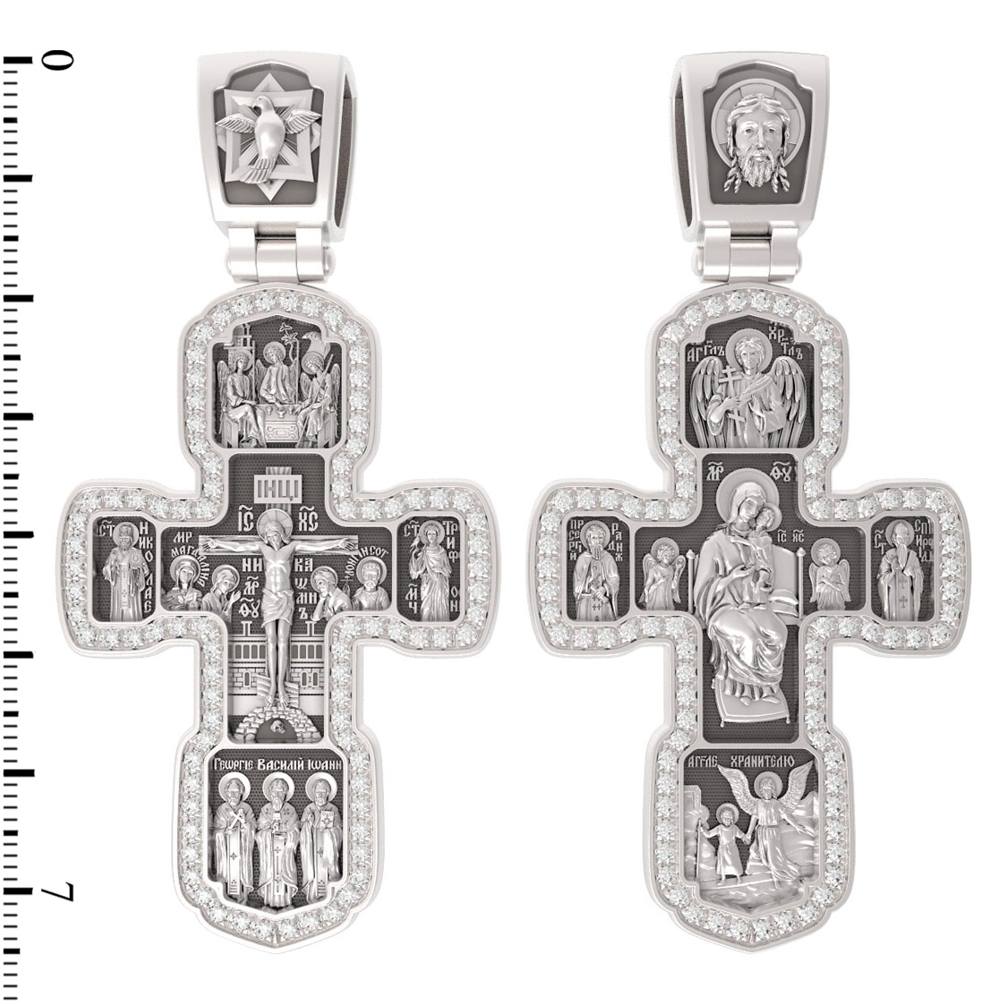 В центральной части оборота креста изображена «Владимирская икона Божией Матери». По преданию, она была написана на доске трапезного стола из дома Иисуса Христа. На Русь икона была привезена в начале XII века и с тех пор почитается как главная святыня нашего Отечества. По бокам изображены прп. Сергий Радонежский и святитель Спиридон Тримифунтский. Сверху и снизу иконы помещены изображения Ангела-Хранителя.