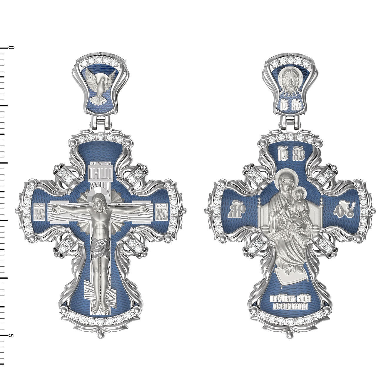 На лицевой стороне креста изображено Распятие Господа и Спасителя нашего Иисуса Христа, отдавшего Себя на смерть, чтобы другие могли жить — жить вечной жизнью, жить с Богом. Своею кровью Господь освятил крест и сделал его проводником Своей благодати, источником освящения верующих. На верхней табличке, выше головы Иисуса, расположена надпись, составленная Понтием Пилатом — «ИНЦИ». Она означает «Иисус Назорей, Царь Иудейский». Надпись «IС ХС» означает Иисус Христос помещается на разных сторонах поперечной (большой) перекладины креста. На кулонном кольце помещено изображение Духа Святого в виде голубя, сходящего с Небес.