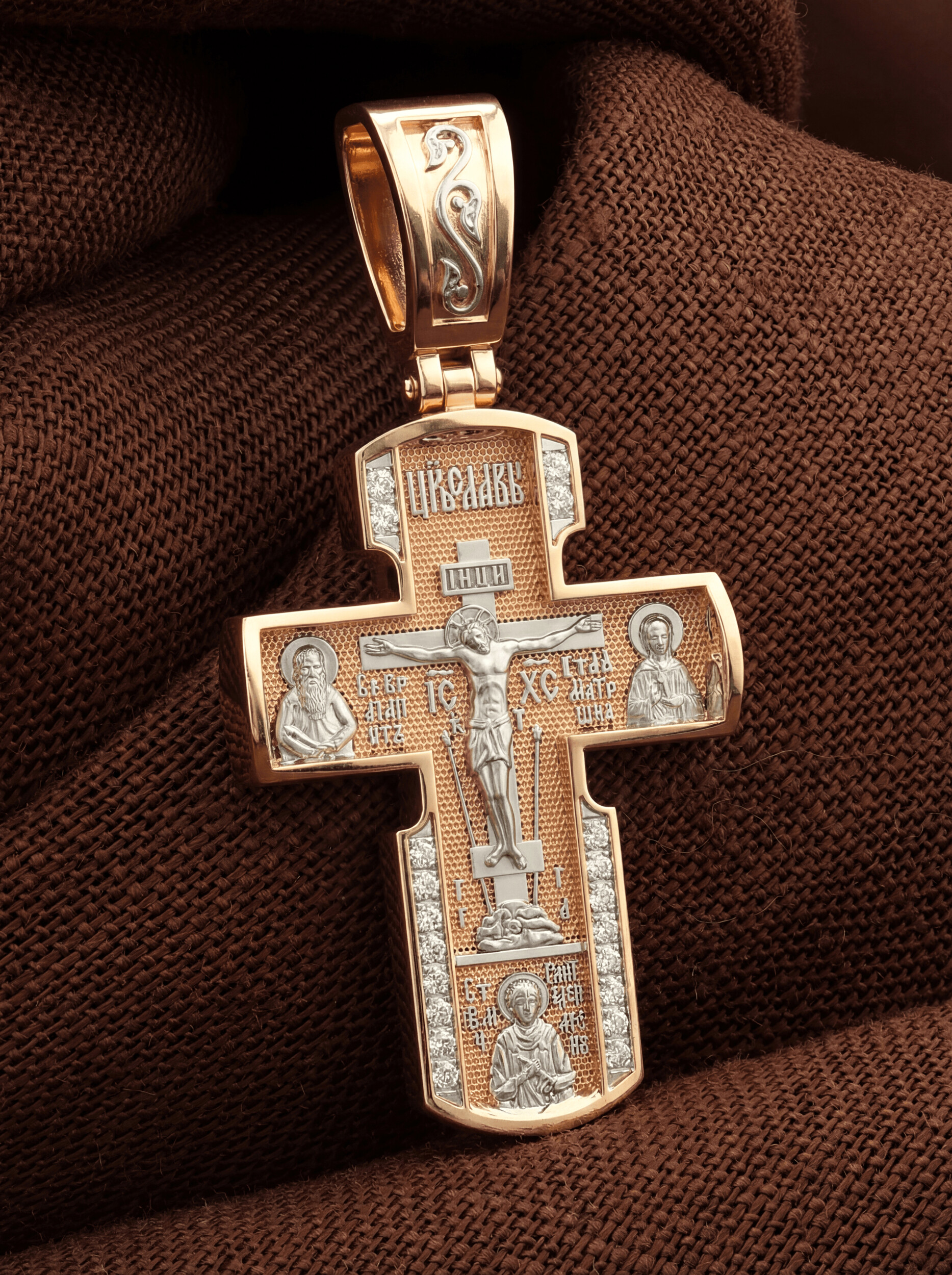 На лицевой стороне креста изображено Распятие Иисуса Христа на Голгофском Кресте, над вершиной которого помещена надпись «Царь Славы». Справа от Распятия помещен образ прославленной святой блаженной Матроны. «Матронушка», — ласково называют эту святую православные за удивительную любовь и помощь, которую она подает всем нуждающимся в ее поддержке. Слева — икона прп. Агапита. Этот святой жил в пещерах Киево-Печерского монастыря в XI веке и бескорыстно врачевал мирян и монахов.