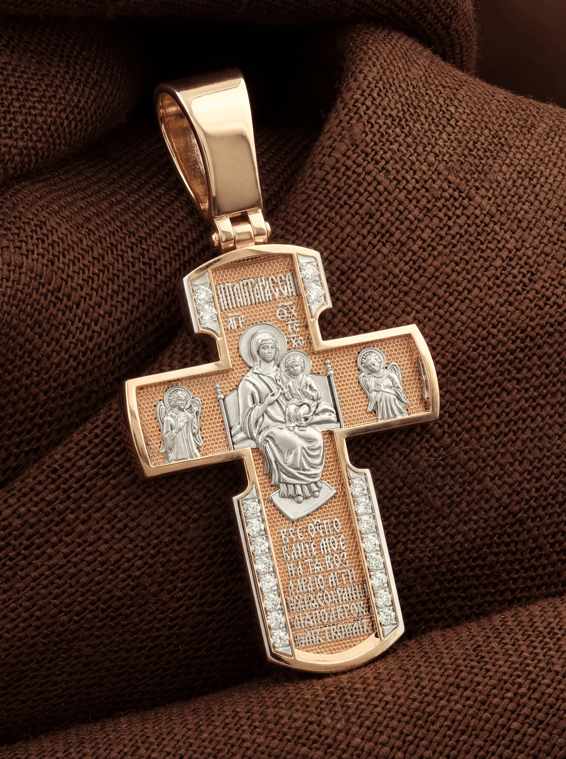 Внизу креста написана молитва обращенная к Божией Матери «Все упование мое на Тя возлагаю, Мати Божия, сохрани мя под кровом Твоим».