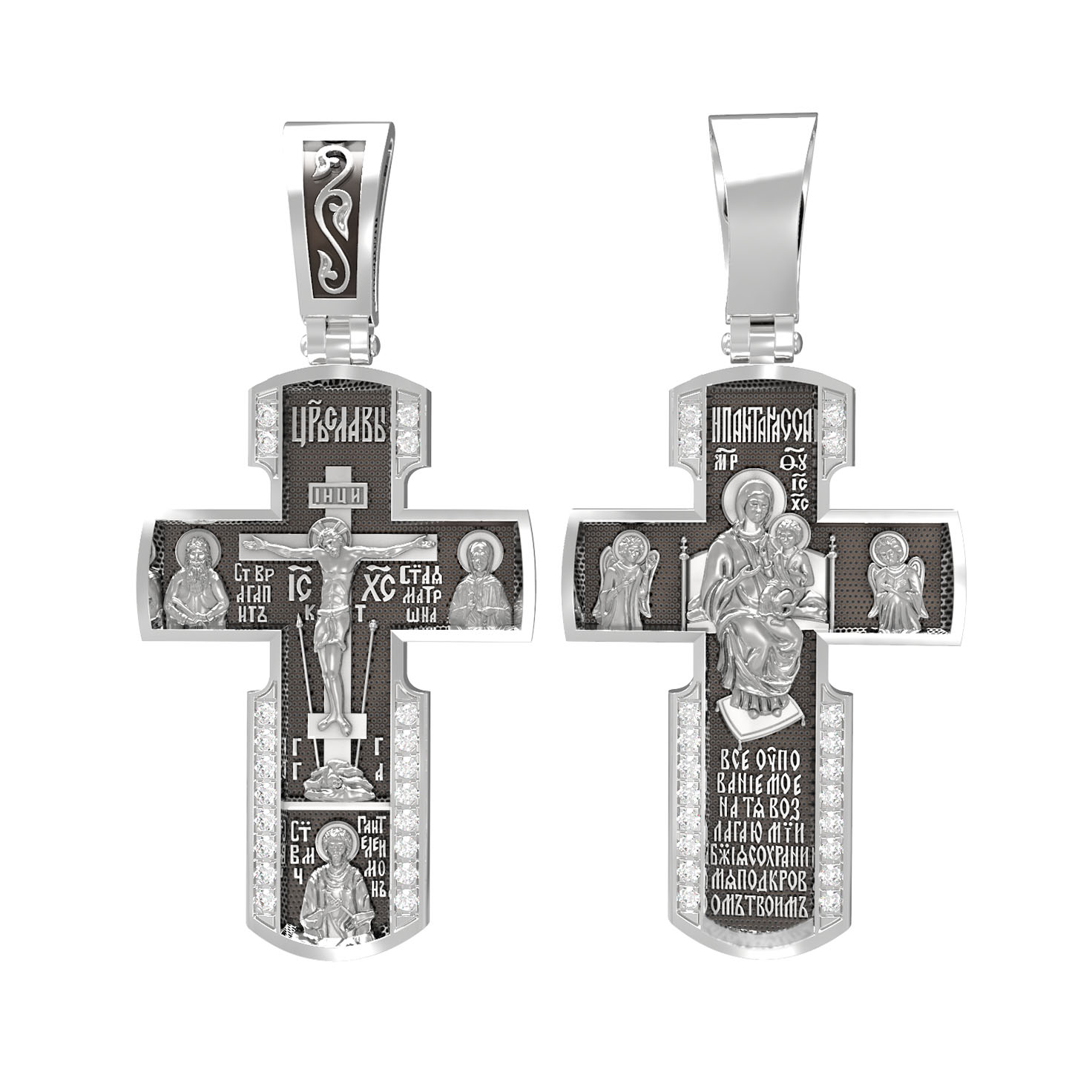 На лицевой стороне креста изображено Распятие Иисуса Христа на Голгофском Кресте, над вершиной которого помещена надпись «Царь Славы». Справа от Распятия помещен образ прославленной святой блаженной Матроны. «Матронушка», — ласково называют эту святую православные за удивительную любовь и помощь, которую она подает всем нуждающимся в ее поддержке. Слева — икона прп. Агапита. Этот святой жил в пещерах Киево-Печерского монастыря в XI веке и бескорыстно врачевал мирян и монахов.