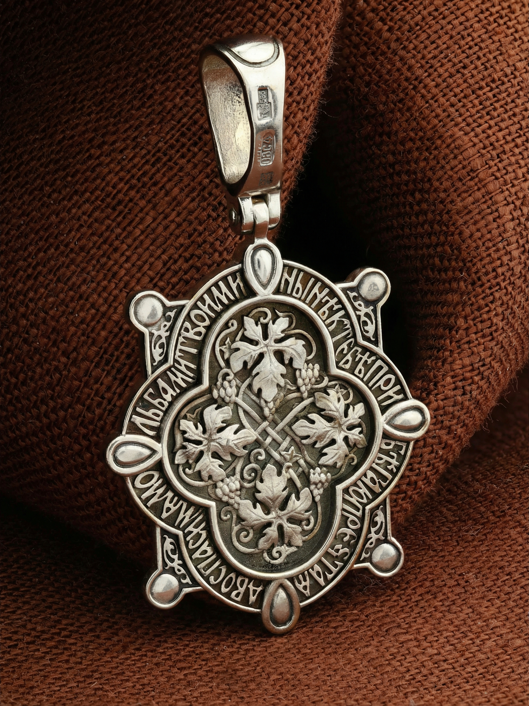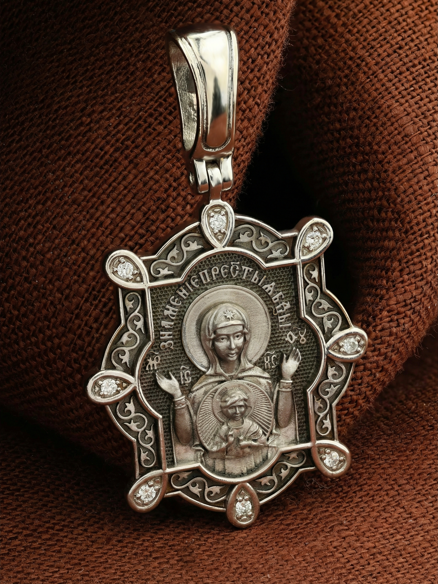 В центр образка помещен образ Божией Матери «Знамение», прославившийся многими чудесами в Новгороде в XII веке. Икона эта чтится как одна из самых великих святынь Русской земли. Молитвенно воздетые руки Богородицы означают заступничество за людей пред Богом. Рядом с Ней, на фоне круглого щита, — благословляющий Божественный Младенец — Спас-Эммануил.