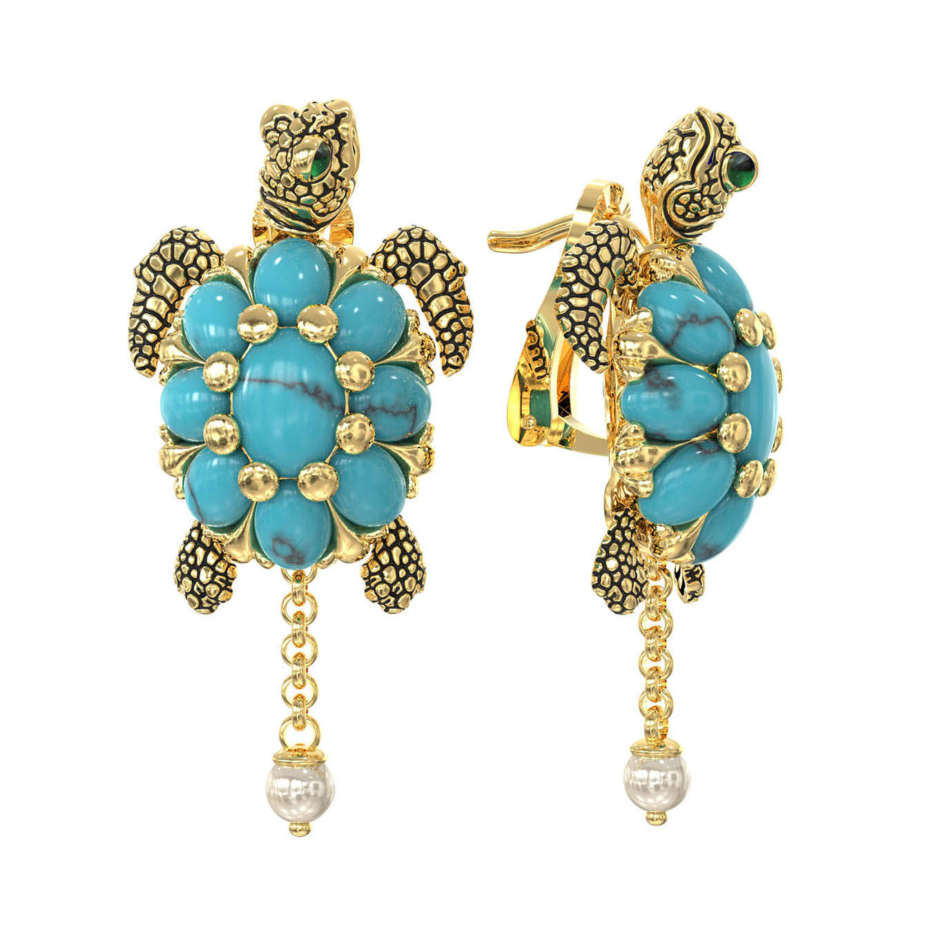 Серьги из лимонного золота c эмалью, жемчугом и бирюзой