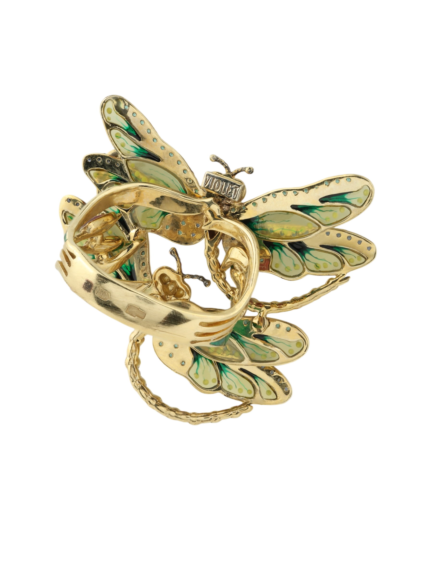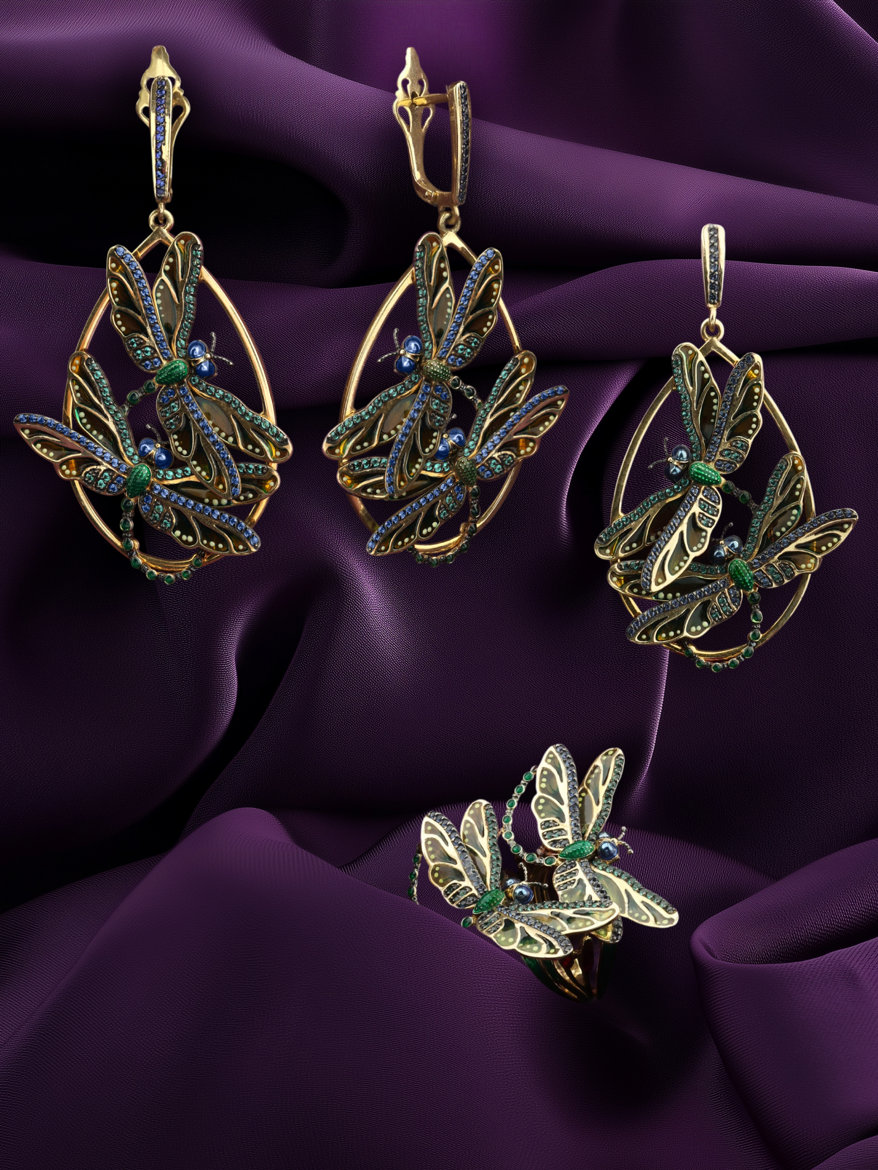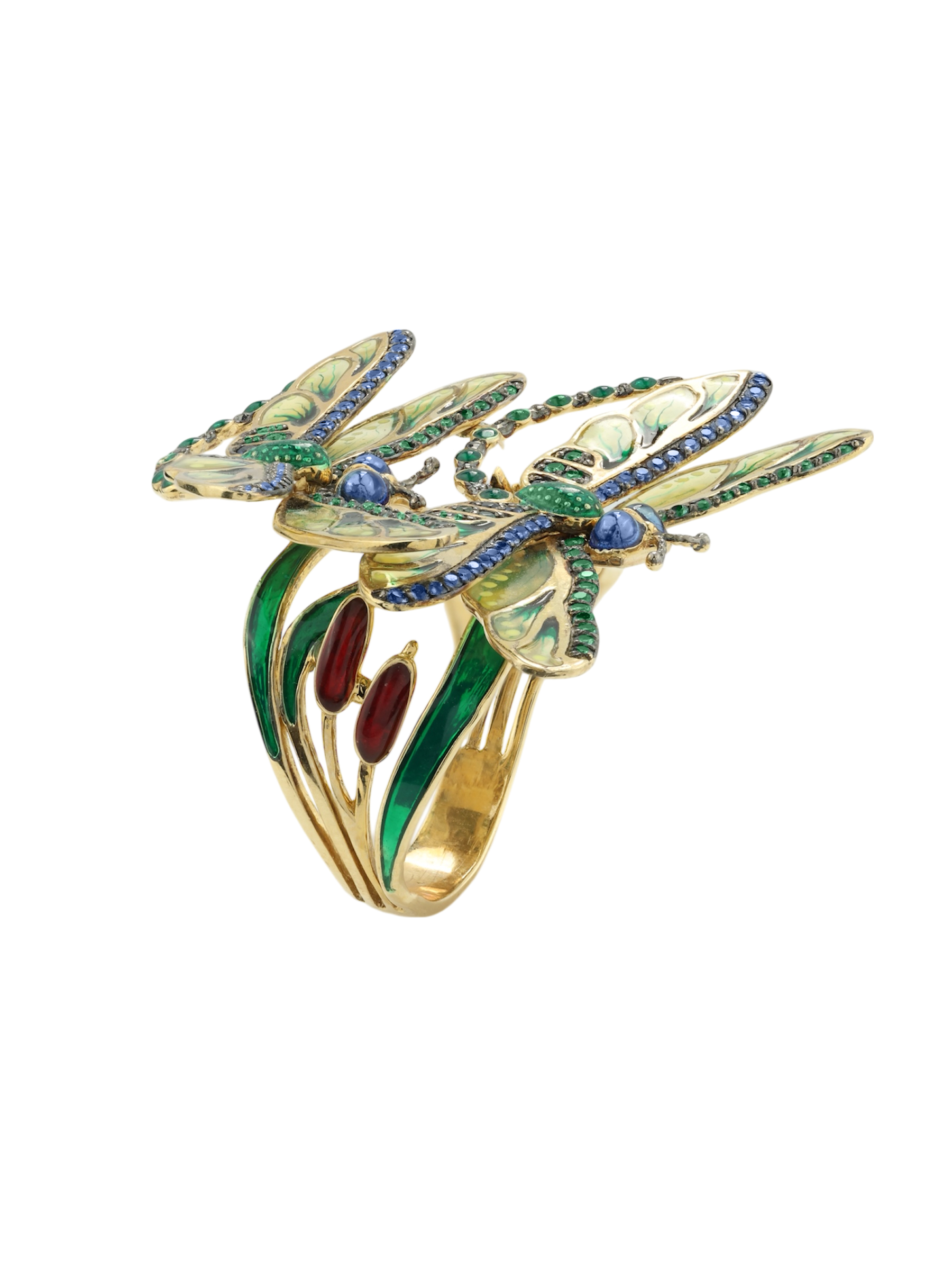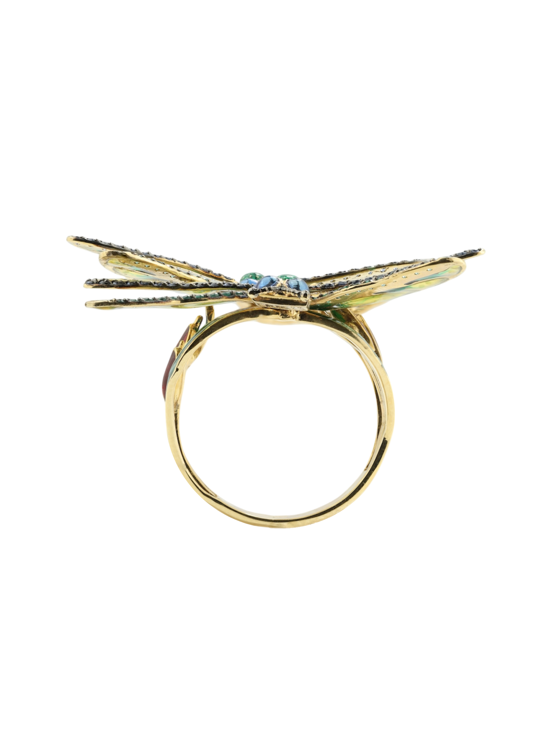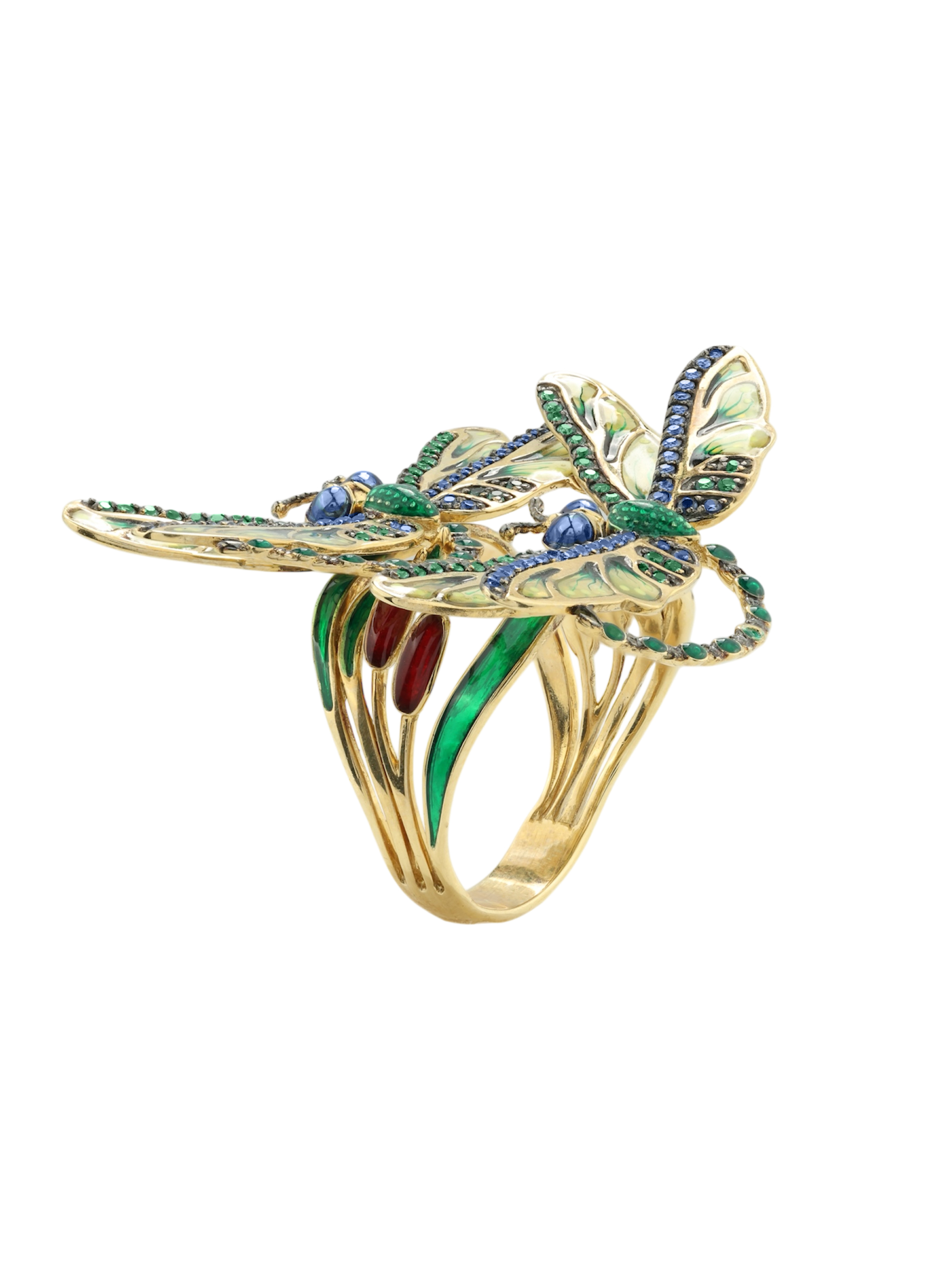 Кольцо из лимонного золота c сапфиром, изумрудом и эмалью