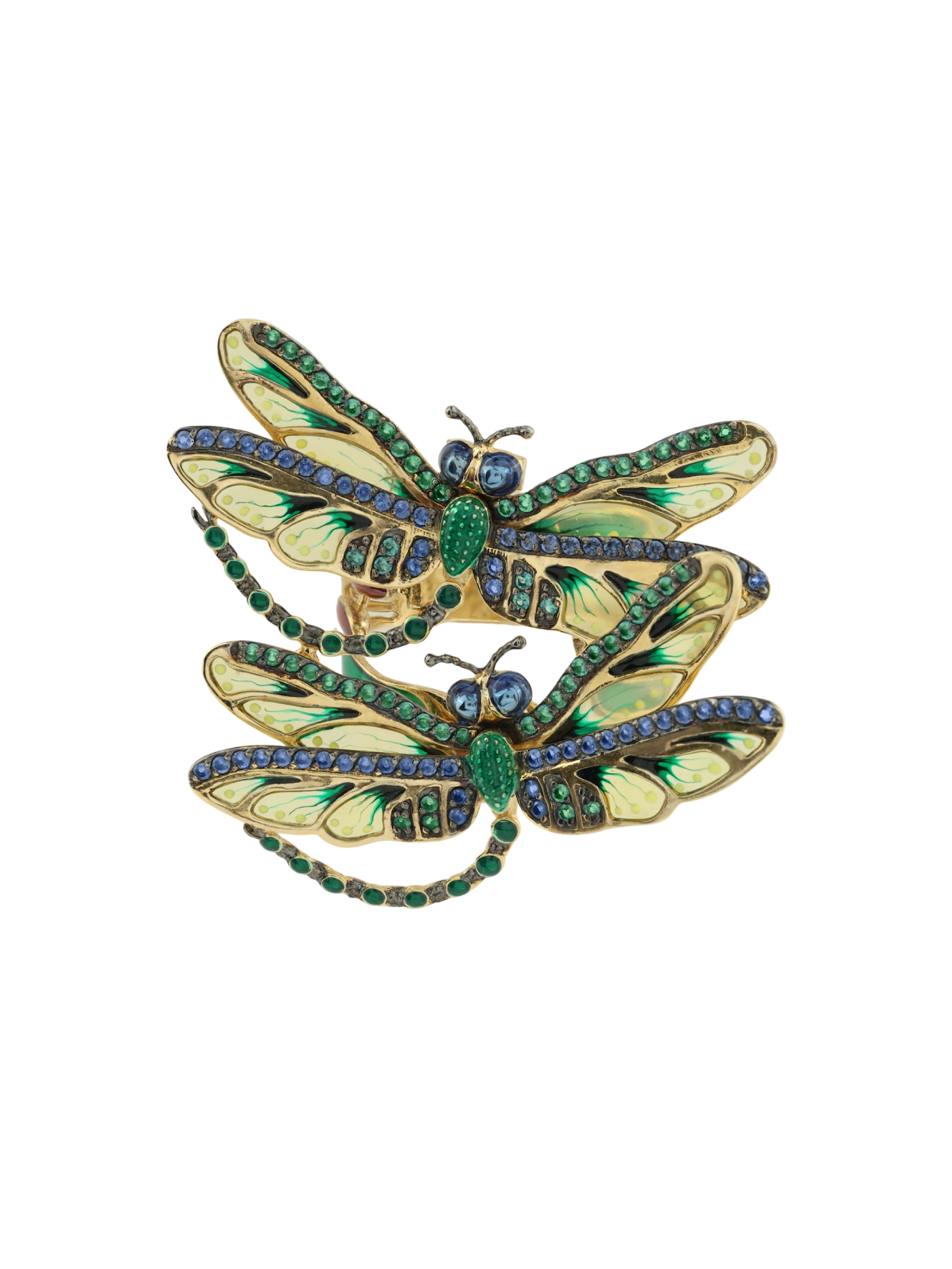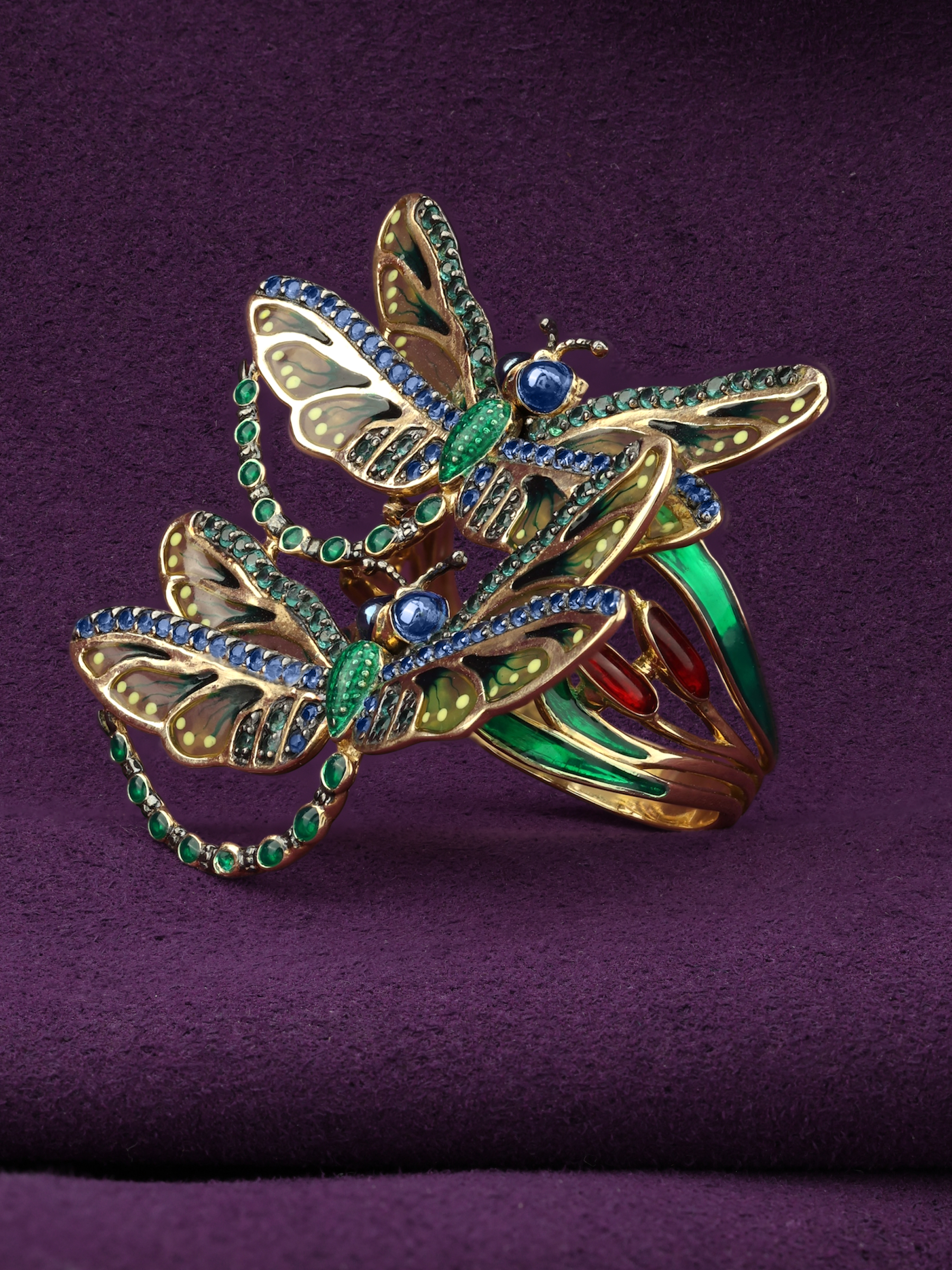 Кольцо из лимонного золота c сапфиром, изумрудом и эмалью