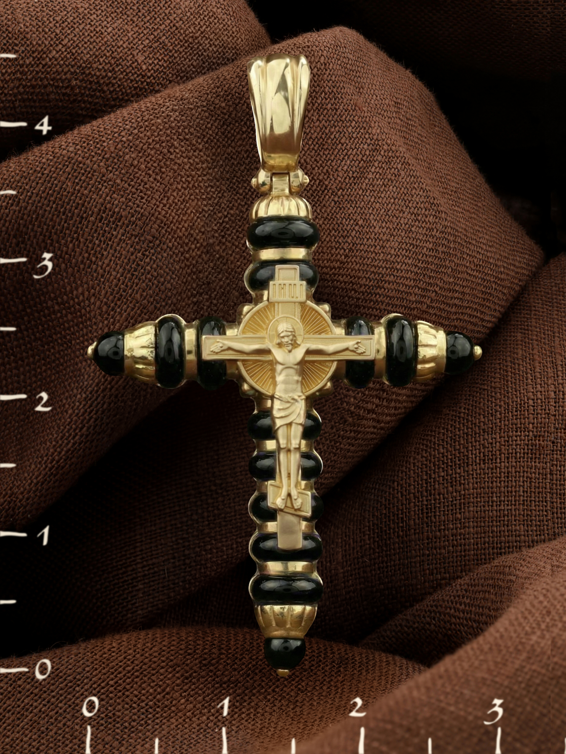 На лицевой стороне креста изображено Распятие Господа и Спасителя нашего Иисуса Христа, отдавшего Себя на смерть для искупления грехов мира. Крест является символом жертвенной любви Всеблагого Бога к падшим людям, всепобеждающим духовным оружием христиан, основанием и средоточием церковной жизни. Над вершиной Распятия помещена надпись «Царь Славы». На верхней перекладине расположена надпись «IНЦI». Она символизирует титло — табличку, на которой, согласно Евангелию, было начертано: Иисус Назорей, Царь Иудейский. Надпись «IC» «ХC»», означает Иисус Христос, помещаются на разных сторонах поперечной перекладины креста. Ниже помещена надпись «НИКА», что означает «победитель».
