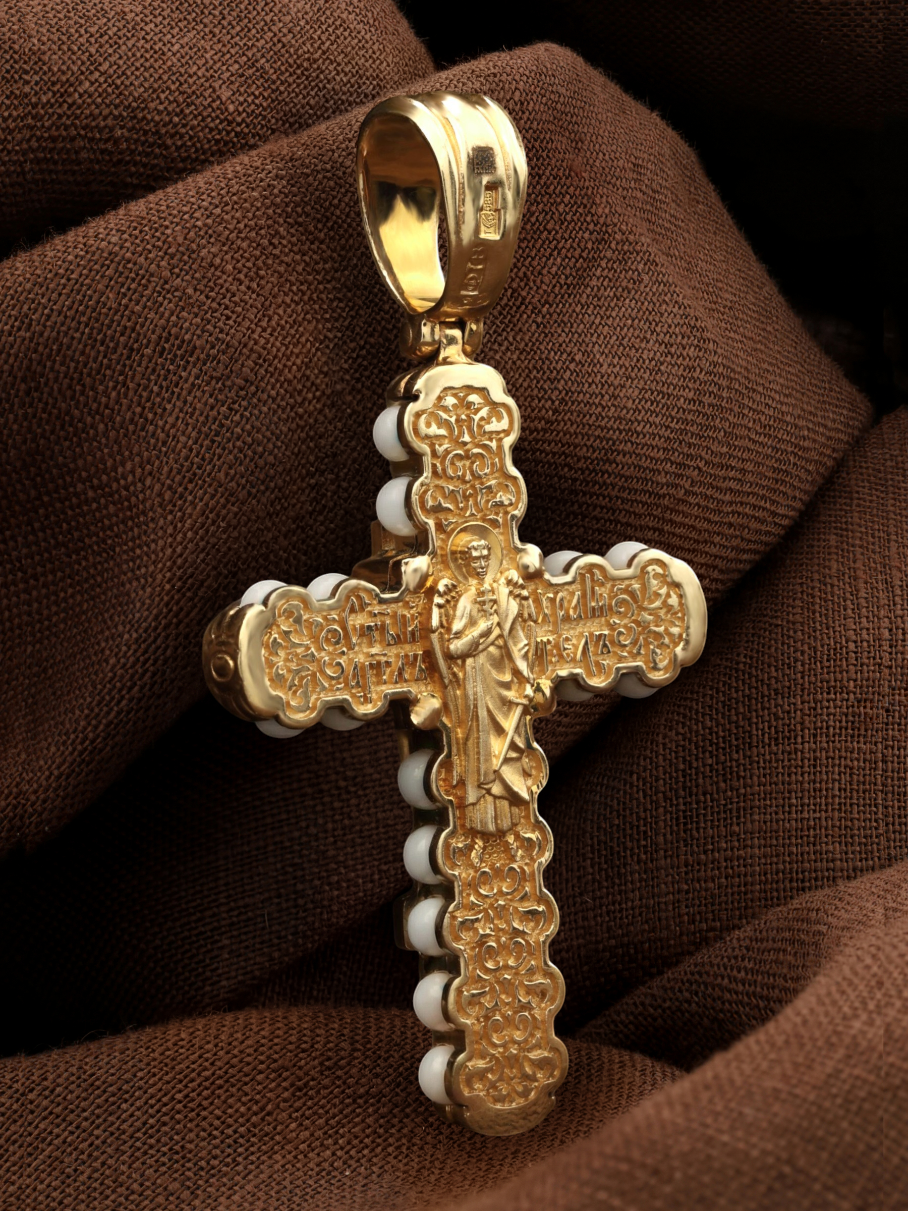 На оборотной стороне креста изображен святой Ангел-Хранитель в виде прекрасного юноши держащего в правой руке крест, а в левой — сферу. Ангел-Хранитель — это Ангел приставляемый Богом к человеку при крещении для охраны и помощи в добрых делах. Невидимо пребывая при нас постоянно, он, руководствуя нас ко спасению, не только по нашему желанию таинственно наставляет нас на все доброе и полезное, не только возносит наши молитвы к Богу, но еще и сам от себя охраняют и защищают нас от врагов видимых и невидимых, ходатайствует за нас пред Богом.