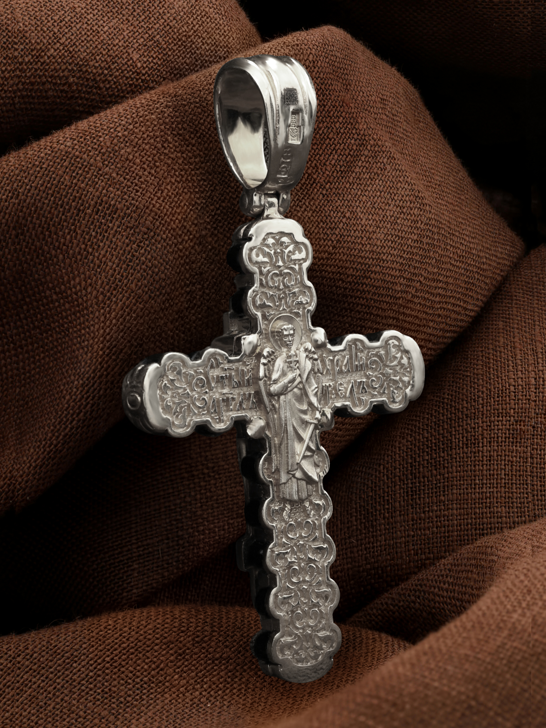 На оборотной стороне креста изображен святой Ангел-Хранитель в виде прекрасного юноши держащего в правой руке крест, а в левой — сферу. Ангел-Хранитель — это Ангел приставляемый Богом к человеку при крещении для охраны и помощи в добрых делах. Невидимо пребывая при нас постоянно, он, руководствуя нас ко спасению, не только по нашему желанию таинственно наставляет нас на все доброе и полезное, не только возносит наши молитвы к Богу, но еще и сам от себя охраняют и защищают нас от врагов видимых и невидимых, ходатайствует за нас пред Богом.
