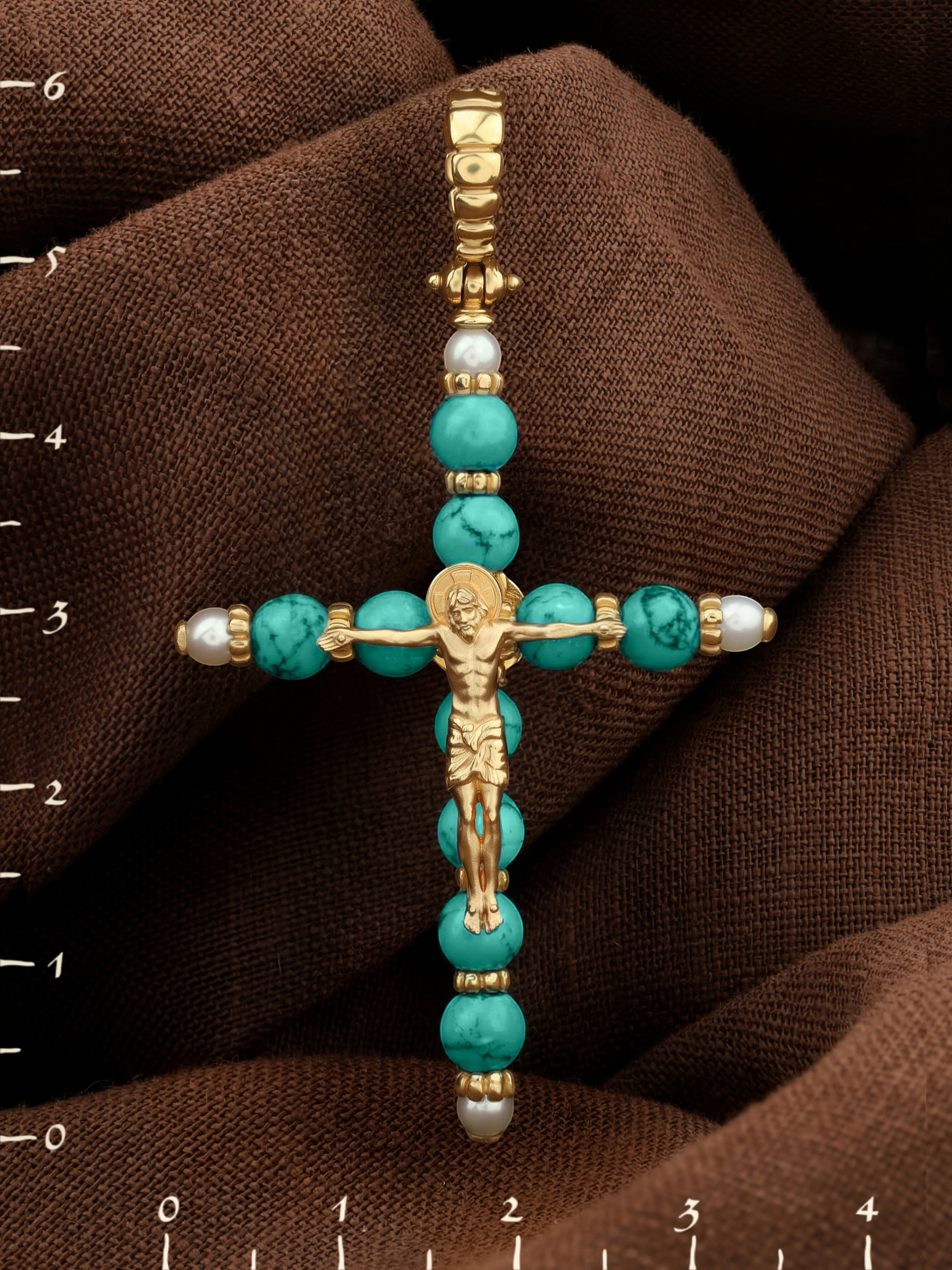 На лицевой стороне креста изображено Распятие Господа и Спасителя нашего Иисуса Христа. Своими крестными страданиями Господь смыл наши грехи, покрыл наш долг перед Богом или, на языке Писания, нас «искупил». В Голгофе сокрыта непостижимая тайна бесконечной правды и любви Бога. Крест стал символом победы добра над злом, жизни над смертью, напоминанием бесконечной Божьей любви, предметом радости. Воплотившийся Сын Божий Своею кровью освятил крест и сделал его проводником Своей благодати, источником освящения верующих. На верхней табличке, выше головы Иисуса, расположена надпись, составленная Понтием Пилатом — «IНЦI». Она означает «Иисус Назорей, Царь Иудейский». Надпись «IC» «ХC», означает Иисус Христос, помещаются на разных сторонах поперечной перекладины креста. Христос в Своей Божественной любви, над которой смерть не властна и которая, страдая, и не страдает в обычном смысле, простирает к людям со Креста Свои объятия, в которые призывается и привлекается весь мир. Поэтому Тело Его не висит, а торжественно покоится на Кресте.