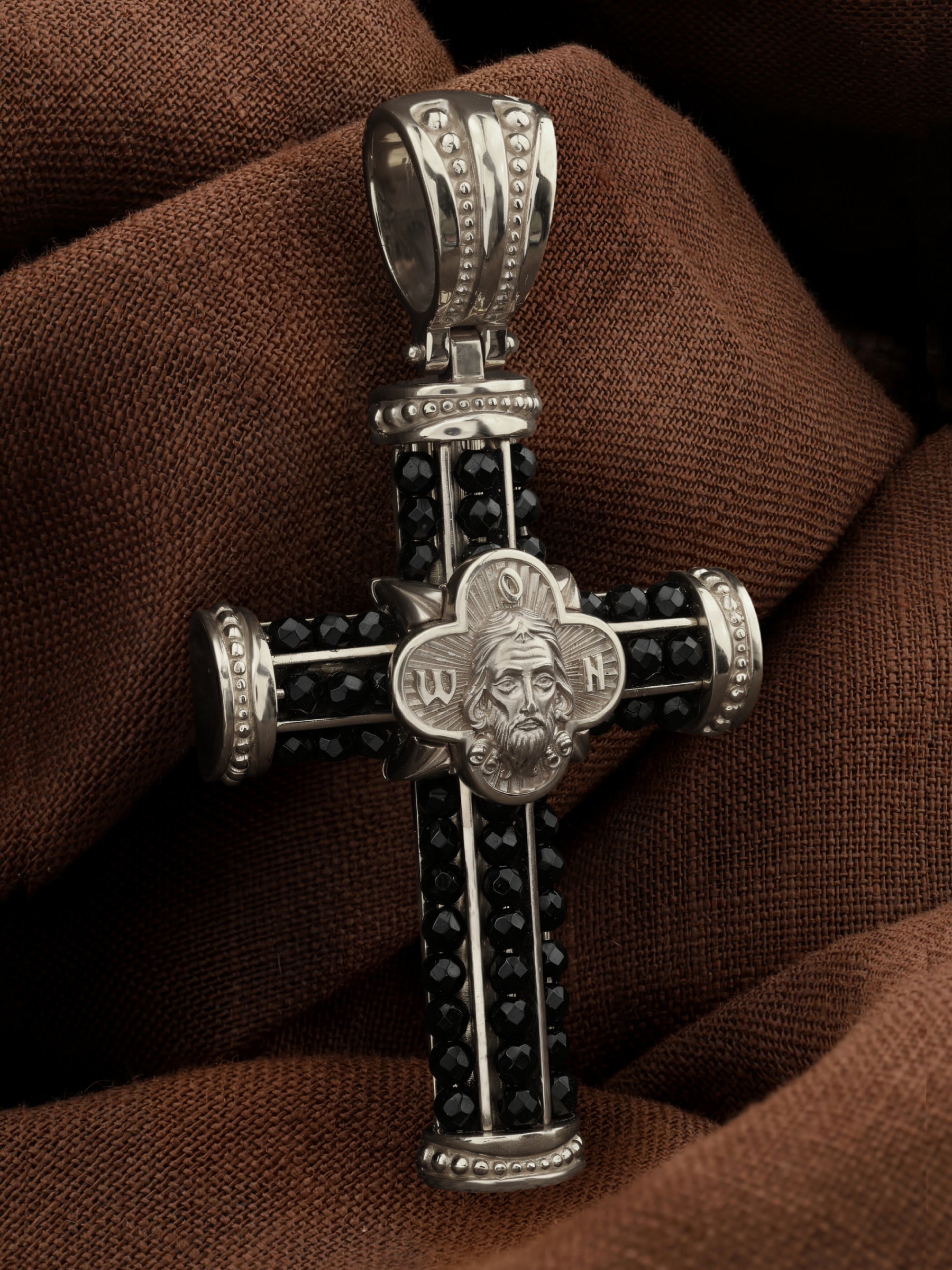 В центральной части лицевой стороны креста изображен Спас Нерукотворный — образ Господа и Спасителя нашего Иисуса Христа, чудесно отпечатавшийся на плате, котором Христос вытер свой лик. Согласно Преданию, изложенному в Четьи Минее, Авгарь V Ухама, больной проказой, послал ко Христу своего архивария Ханнана (Ананию) с письмо, в котором просил Христа прийти в Едессу и исцелить его. Ханнан же был художником, и Авгарь поручил ему, если Спаситель не сможет прийти, то написать хотя бы Его образ и принести ему. Видя, что Ханнан хочет сделать Его портрет, Христос потребовал воды, умылся, вытер Свой лик платом, и на этом плате отпечатался Его образ. Спаситель передал этот плат Ханнану с повелением отнести с ответным письмом пославшему его. Получив портрет, Авгарь исцелился от главного своего недуга, но лицо его оставалось еще поврежденным. После Пятидесятницы в Едессу пошёл святой апостол Фаддей, один из 70-ти, закончил исцеление Авгаря и обратил его в христианство. Авгарь прикрепил образ к доске и поместил в нише над городскими воротами, убрав оттуда находившегося там идола.