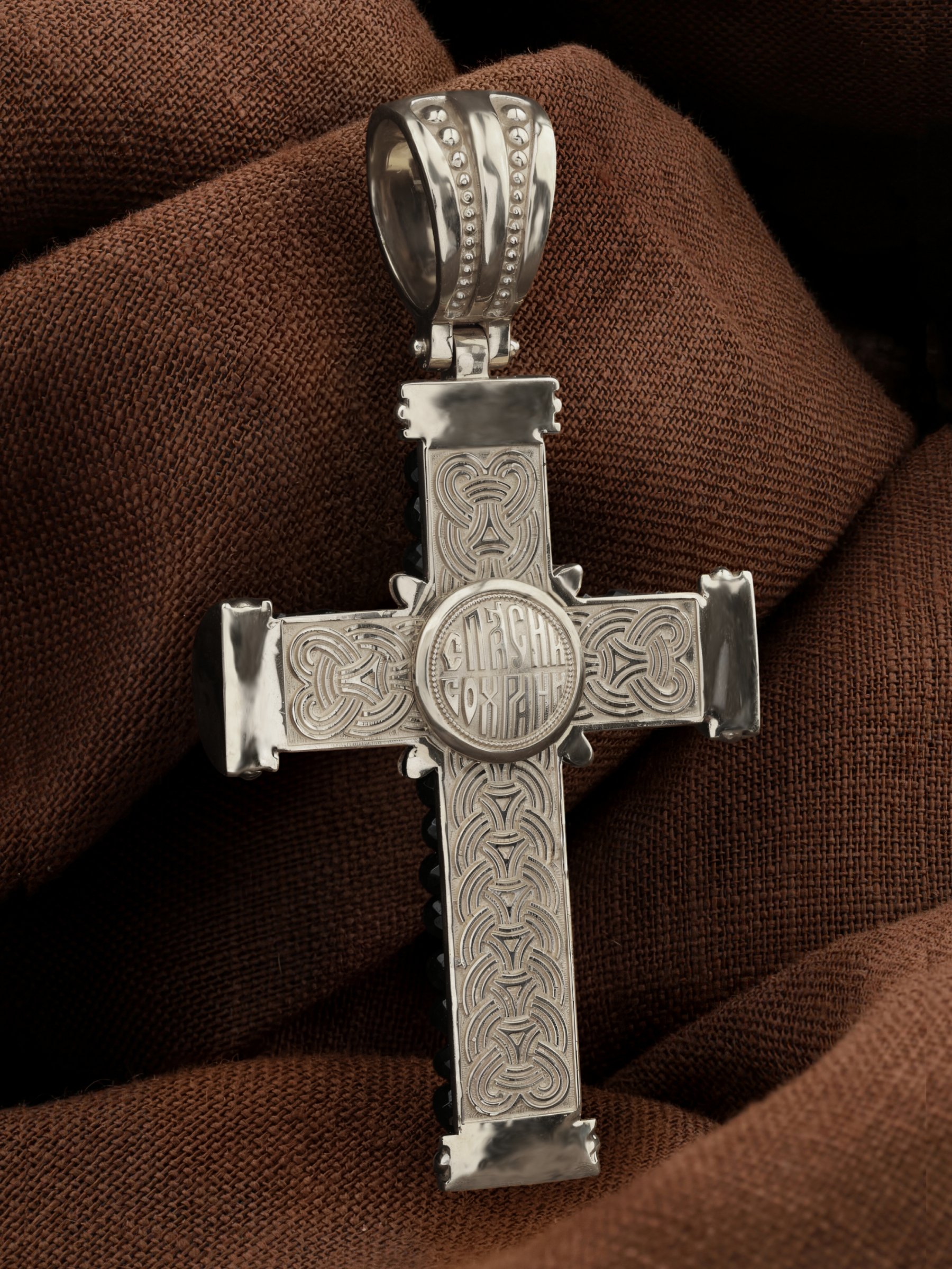 В центрально части оборотной стороны креста написана молитва: «Спаси и сохрани».
