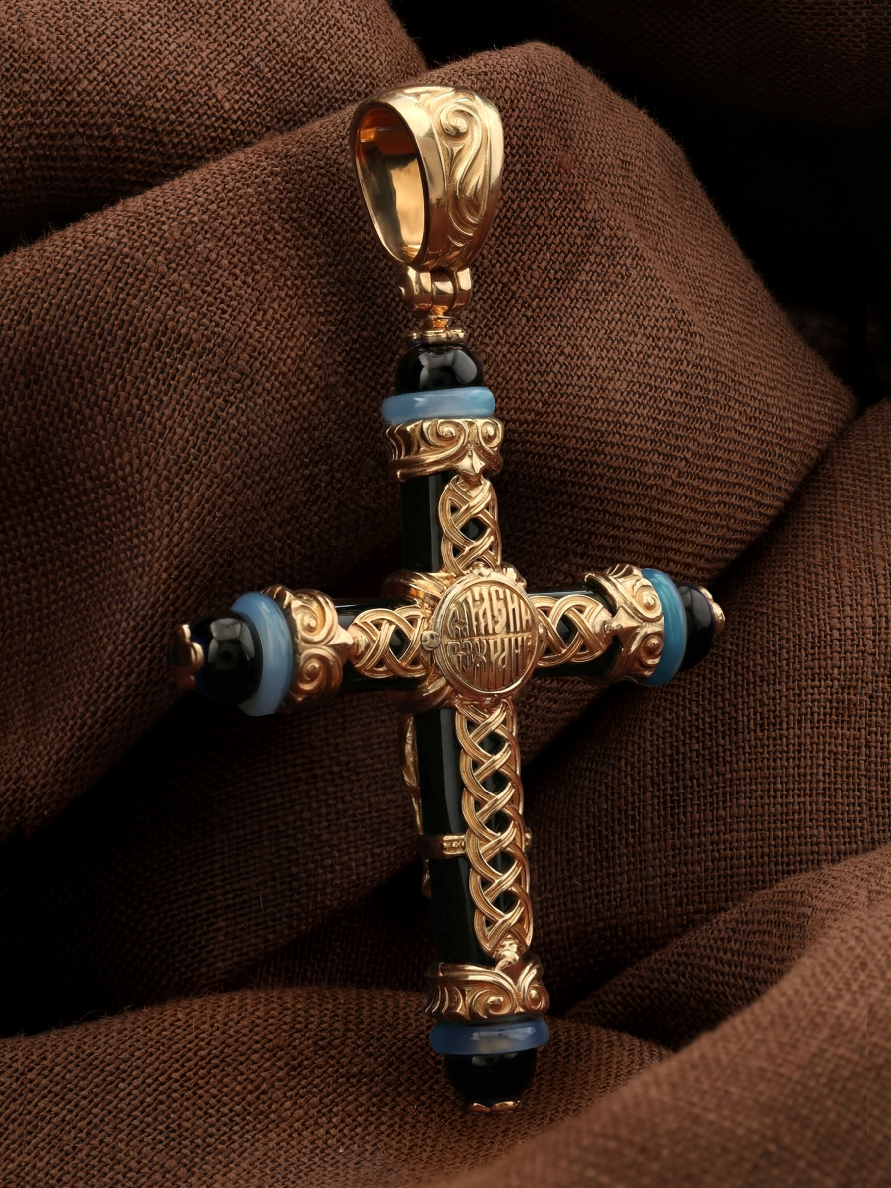 На оборотной стороне креста написана молитва: «Спаси и сохрани». Крест украшен орнаментом.
