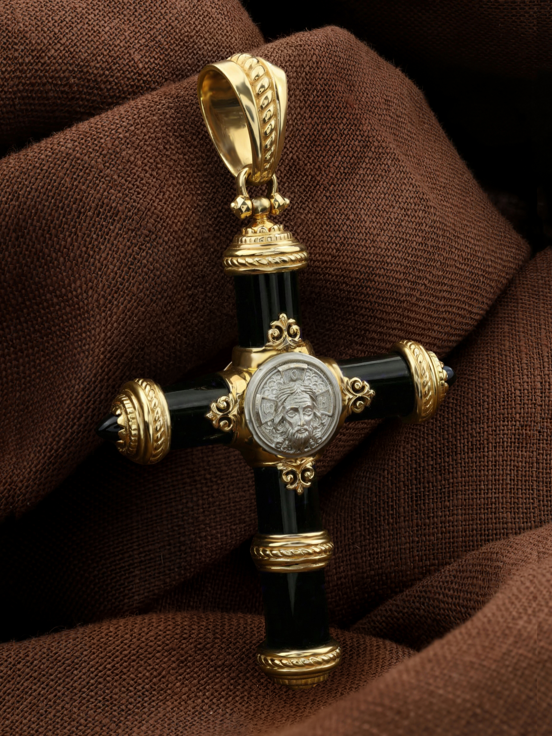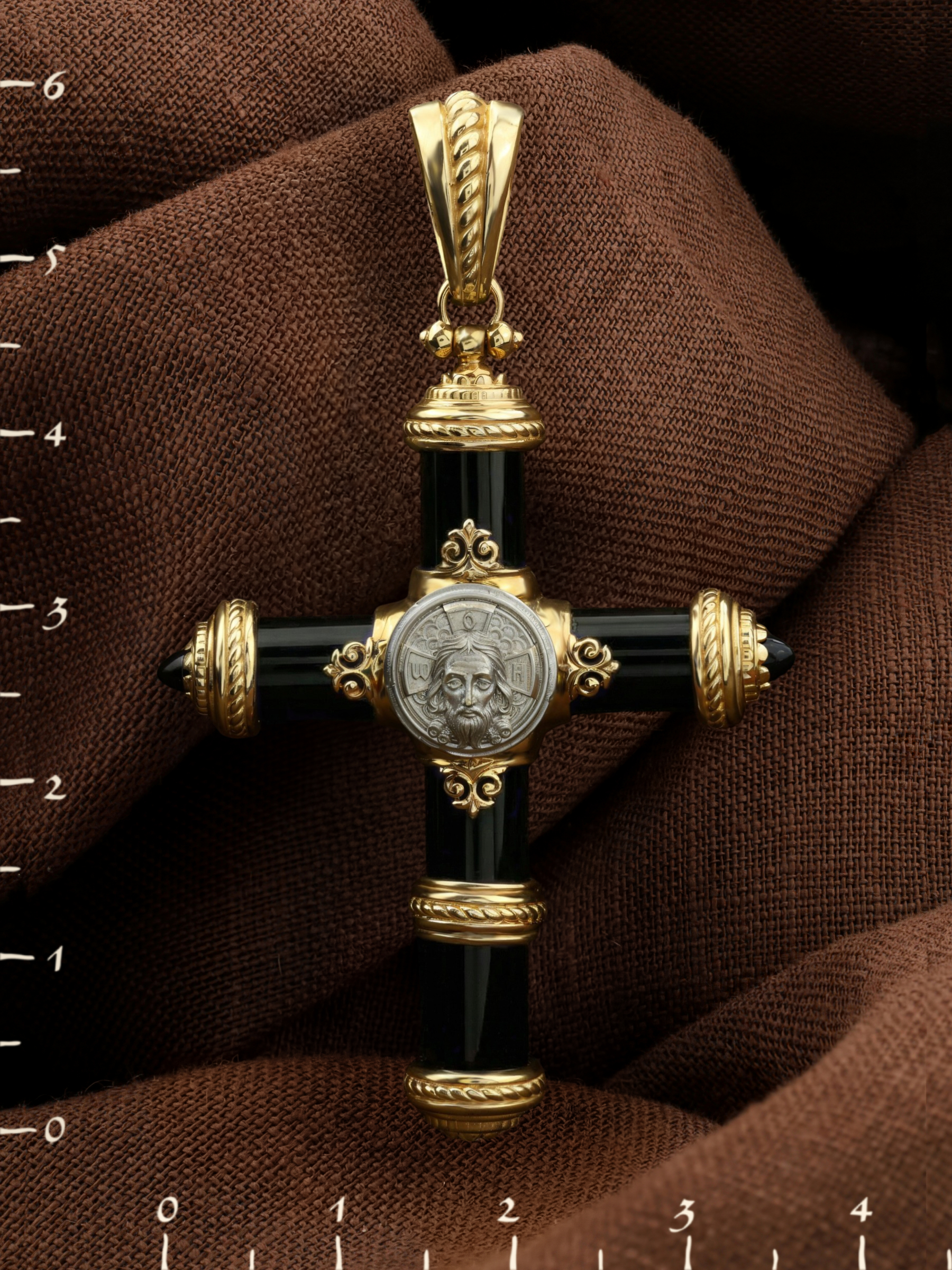 В центральной части лицевой стороны креста изображен Спас Нерукотворный — образ Господа и Спасителя нашего Иисуса Христа, чудесно отпечатавшийся на плате, котором Христос вытер свой лик. Согласно Преданию, изложенному в Четьи Минее, Авгарь V Ухама, больной проказой, послал ко Христу своего архивария Ханнана (Ананию) с письмо, в котором просил Христа прийти в Едессу и исцелить его. Ханнан же был художником, и Авгарь поручил ему, если Спаситель не сможет прийти, то написать хотя бы Его образ и принести ему. Видя, что Ханнан хочет сделать Его портрет, Христос потребовал воды, умылся, вытер Свой лик платом, и на этом плате отпечатался Его образ. Спаситель передал этот плат Ханнану с повелением отнести с ответным письмом пославшему его. Получив портрет, Авгарь исцелился от главного своего недуга, но лицо его оставалось еще поврежденным. После Пятидесятницы в Едессу пошёл святой апостол Фаддей, один из 70-ти, закончил исцеление Авгаря и обратил его в христианство. Авгарь прикрепил образ к доске и поместил в нише над городскими воротами, убрав оттуда находившегося там идола.