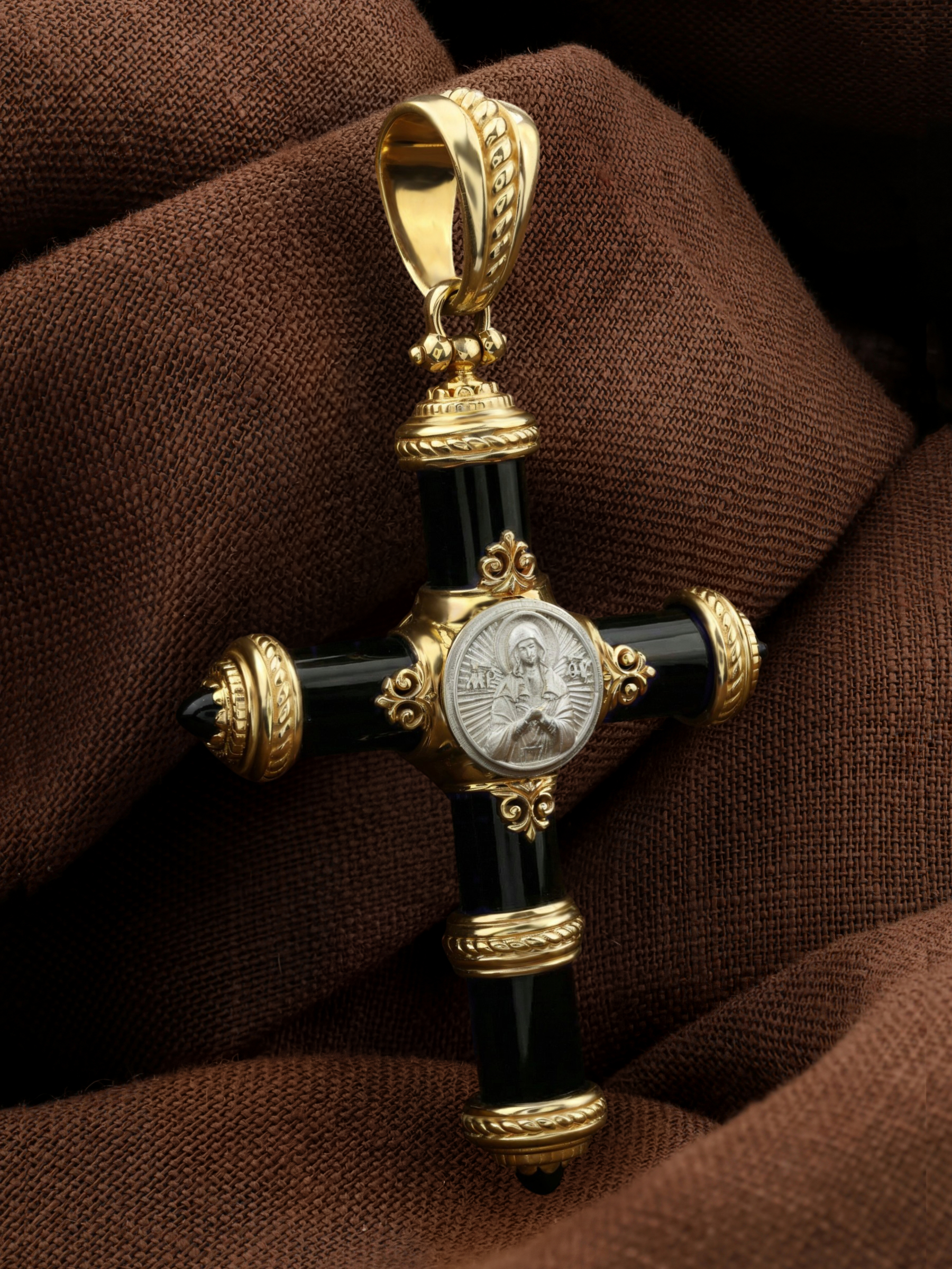 В центральной части оборотной стороны креста изображена икона Пресвятой Богородицы «Умиление» или «Радость всех радостей». Пресвятая Богородица запечатлена в самое счастливое мгновение, еще до рождения своего ребенка — Иисуса, но уже после Благовещения. Лик юной Девы Марии, с опущенными долу глазами и сложенными крестообразно на груди руками, выражает глубочайшее смирение. Икона принадлежала преподобному Серафиму Саровскому, была его келейной иконой. После смерти преподобного настоятель о. Нифонт отдал святую икону «Радость всех радостей» сестрам Дивеевской Серафимовской обители.