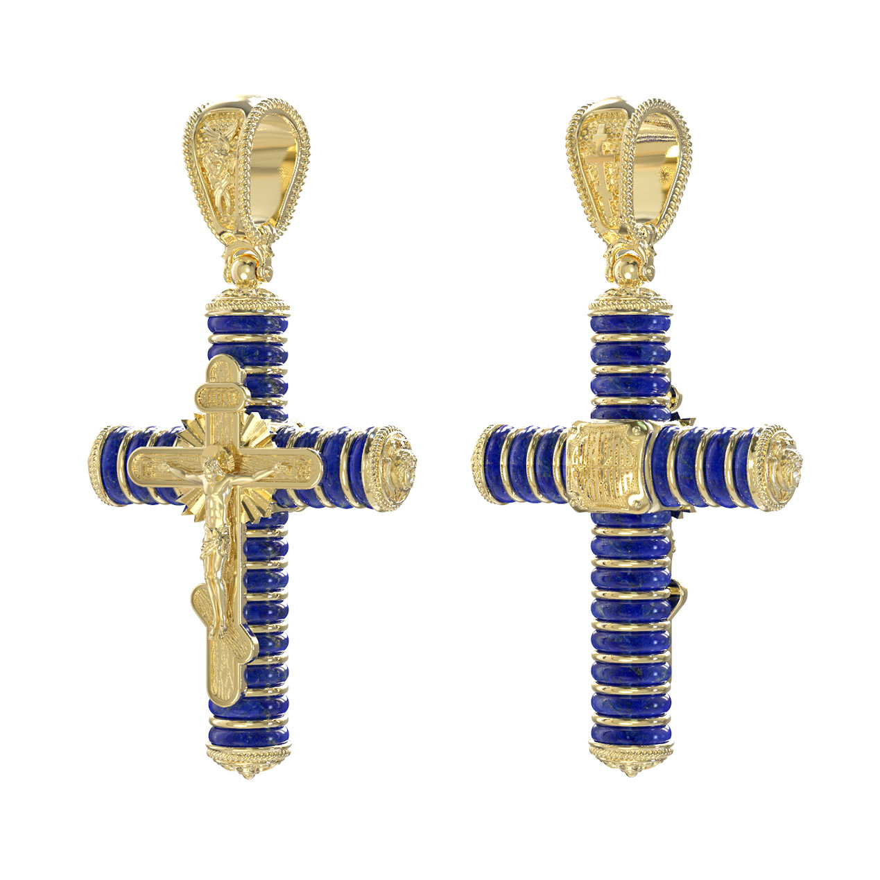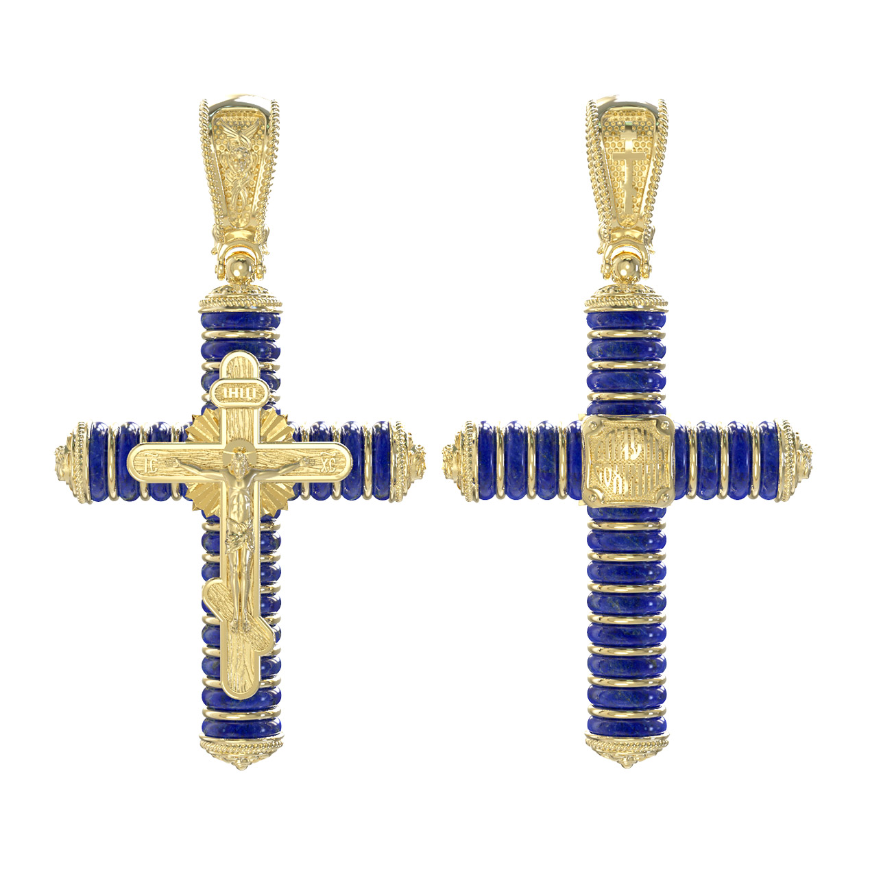 На лицевой стороне креста изображено Распятие Господа и Спасителя нашего Иисуса Христа. Своими крестными страданиями Господь смыл наши грехи, покрыл наш долг перед Богом или, на языке Писания, нас «искупил». В Голгофе сокрыта непостижимая тайна бесконечной правды и любви Бога. Крест стал символом победы добра над злом, жизни над смертью, напоминанием бесконечной Божьей любви, предметом радости. Воплотившийся Сын Божий Своею кровью освятил крест и сделал его проводником Своей благодати, источником освящения верующих. На верхней табличке, выше головы Иисуса, расположена надпись, составленная Понтием Пилатом — «IНЦI». Она означает «Иисус Назорей, Царь Иудейский». Надпись «IC» «ХC», означает Иисус Христос, помещаются на разных сторонах поперечной перекладины креста. Христос в Своей Божественной любви, над которой смерть не властна и которая, страдая, и не страдает в обычном смысле, простирает к людям со Креста Свои объятия, в которые призывается и привлекается весь мир. Поэтому Тело Его не висит, а торжественно покоится на Кресте. На кулонном кольце изображен шестикрылый Серафим. Серафим означает «Пламенный». Горя любовью к Богу, он зажигает огонь этой любви и в сердцах людей.