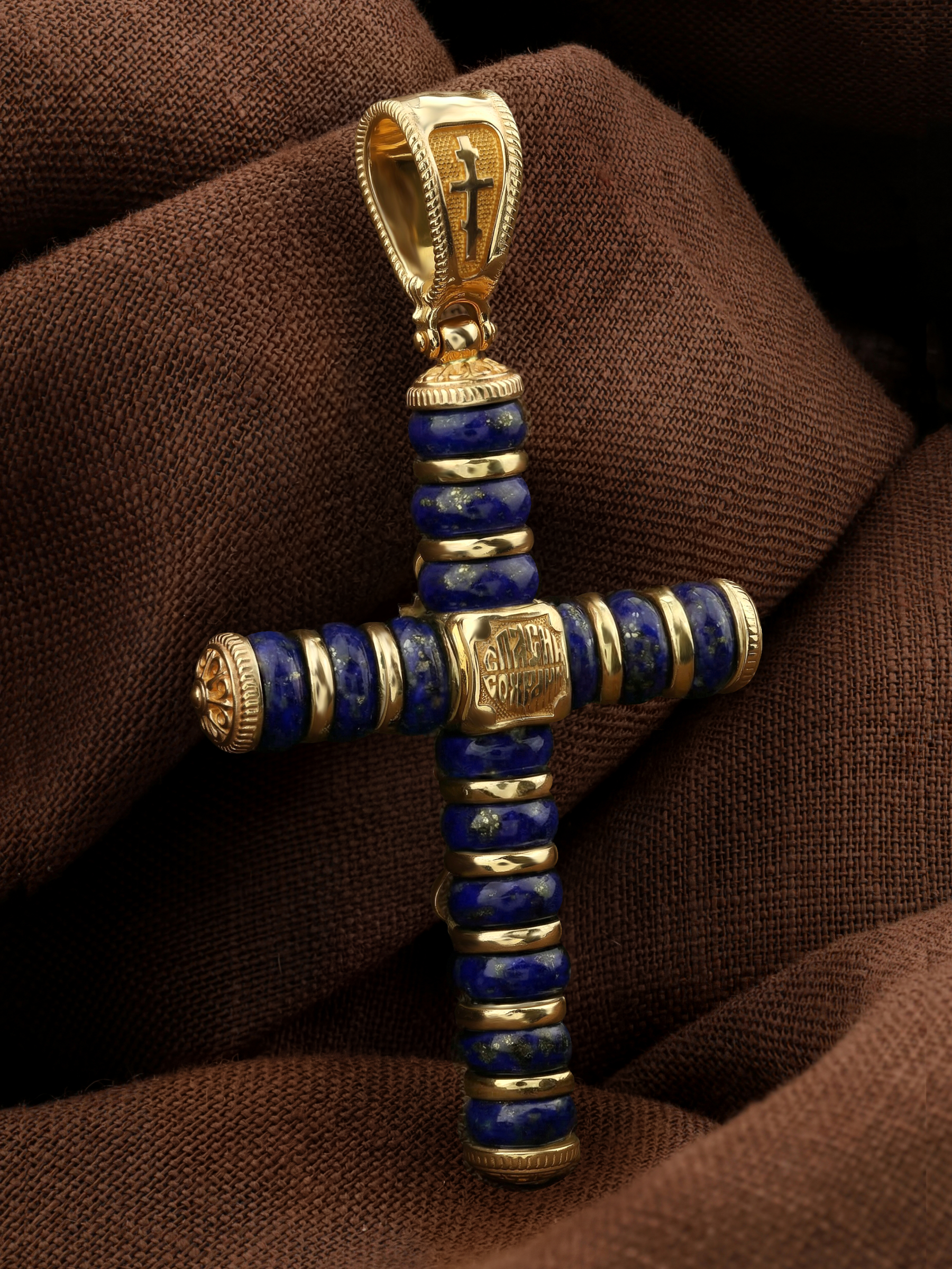 На лицевой стороне креста изображено Распятие Господа и Спасителя нашего Иисуса Христа. Своими крестными страданиями Господь смыл наши грехи, покрыл наш долг перед Богом или, на языке Писания, нас «искупил». В Голгофе сокрыта непостижимая тайна бесконечной правды и любви Бога. Крест стал символом победы добра над злом, жизни над смертью, напоминанием бесконечной Божьей любви, предметом радости. Воплотившийся Сын Божий Своею кровью освятил крест и сделал его проводником Своей благодати, источником освящения верующих. Господь сказал: кто хочет идти за Мною, отвергнись себя, и возьми крест свой, и следуй за Мною. (Мк. 8: 34). На верхней табличке, выше головы Иисуса, расположена надпись, составленная Понтием Пилатом — «IНЦI». Она означает «Иисус Назорей, Царь Иудейский». Надпись «IC» «ХC», означает Иисус Христос, помещается на разных сторонах поперечной перекладины креста. На православном кресте Христос не умирает, а свободно простирает руки, ладони Иисуса открыты, будто он хочет обнять все человечество, даря им свою любовь и открывая путь к вечной жизни. На кулонном кольце изображен шестикрылый Ангел Серафим.