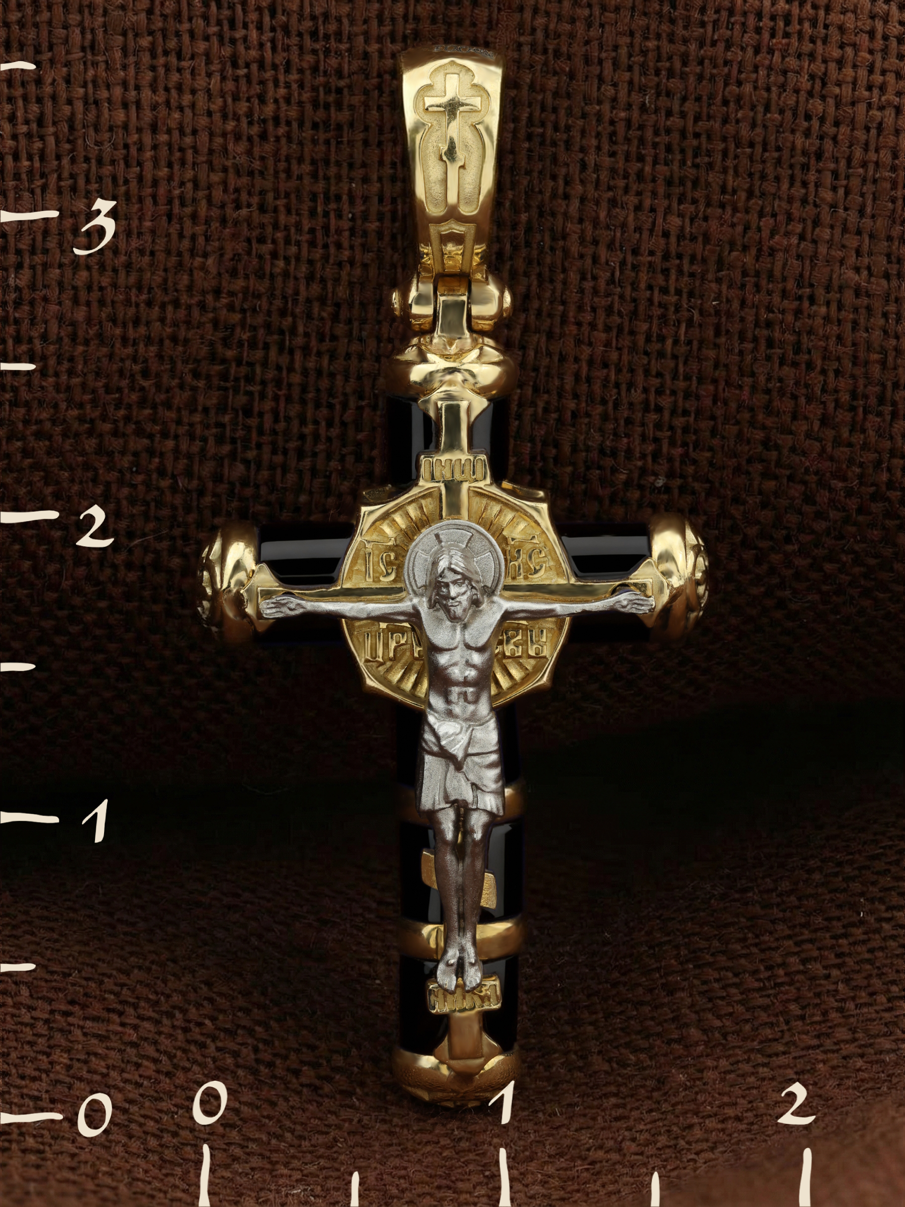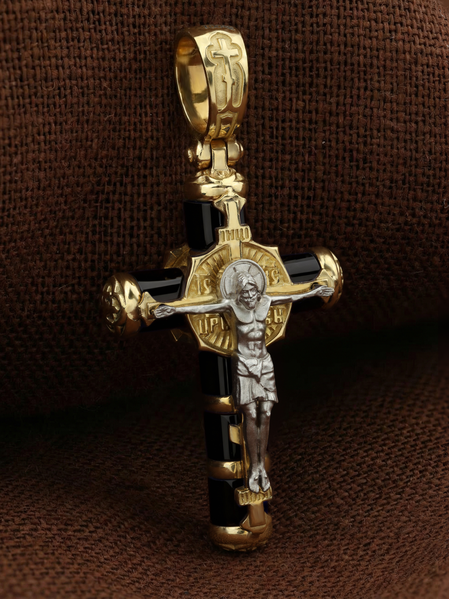 На лицевой стороне креста изображено Распятие Господа и Спасителя нашего Иисуса Христа, отдавшего Себя на смерть, для искупления грехов мира. Крест является символом жертвенной любви всеблагого Бога к падшим людям, всепобеждающим духовным оружием христиан, основанием и средоточием церковной жизни. Верхняя перекладина символизирует титло — табличку, на которой, согласно Евангелию, было начертано: Иисус Назорей Царь Иудейский (IНЦI). Надпись «IС» « ХС» означает Иисус Христос и размещена над поперечной перекладиной. Слева от Распятия изображена Пресвятая Богородица, справа — апостол и евангелист Иоанн Богослов, один из ближайших учеников Иисуса Христа. Возвышение, на котором стоит Крест, символизирует гору Голгофу, на которой произошло Распятие. Под подножием Креста изображена покоящаяся голова (череп) Адама. Под Распятием помещено изображение Духа Святого в виде голубя.
