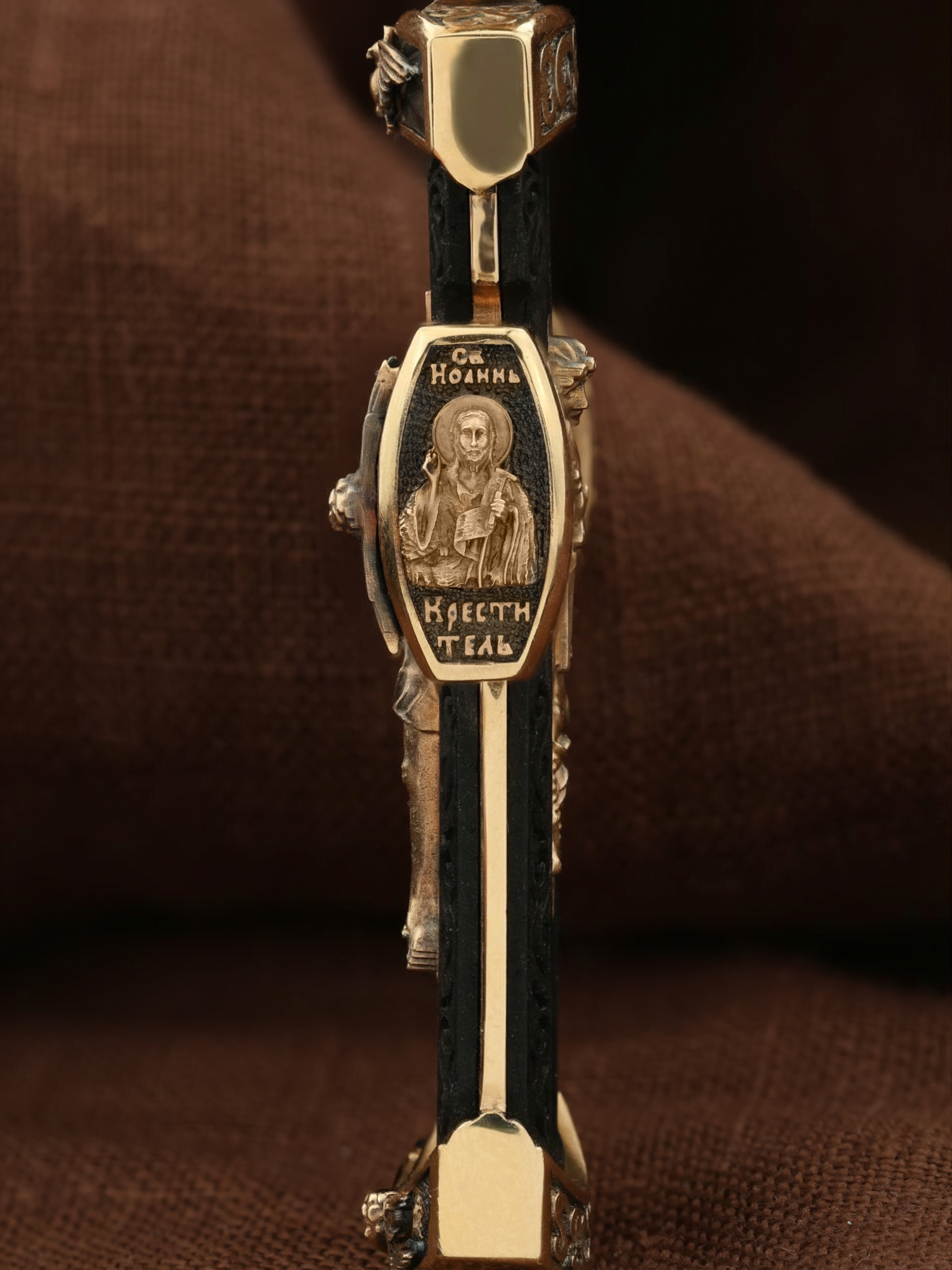 На торце изделия с левой стороны помещена икона Святого Николая Чудотворца — самый почитаемый в Православной Церкви, которого еще называют Николай Угодник за то, что он угодил своей жизнью Богу. Николай Чудотворец, помощник в делах, покровитель учащихся, утешитель обиженных и нуждающихся, целитель самых страшных и тяжелых недугов, предстатель и молитвенник за людей перед Богом. Также Святитель Николай Чудотворец известен своими молитвами за путешественников, когда непрестанный ветер и бушующие волны утихают и корабль заходит в спокойную гавань. На торце изделия с правой стороны — икона Святого Иоанна Крестителя. Святой Иоанн был последним пророком Израиля. Он призывал к покаянию, предвозвещая приближение Царствия Небесного (Мф. 3, 2), и удостоился стать Крестителем Христа. Иисус Христос говорит о нем: «Сей есть о котором написано: «Вот, Я посылаю Ангела Моего пред лицем Твоим, который приготовит путь Твой пред Тобою» (Лк. 7, 27). И еще: «Из рожденных женами нет ни одного пророка больше Иоанна Крестителя» (Лк. 7, 28).