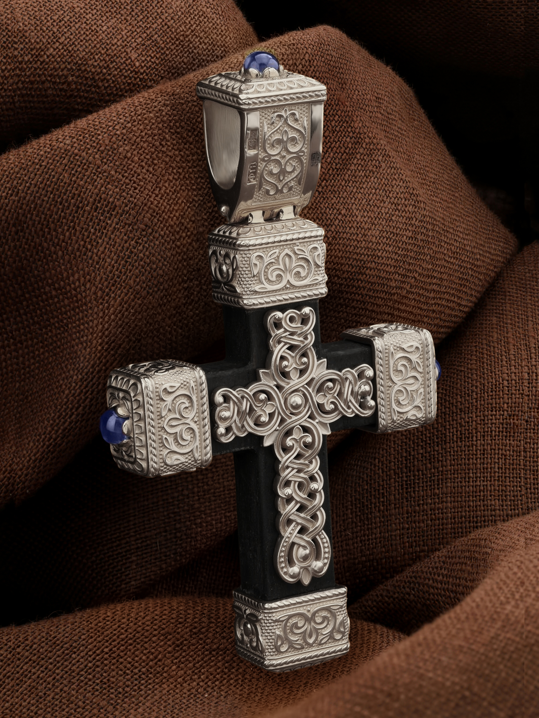 Крест из белого золота c эмалью, сапфиром и эбеновым деревом