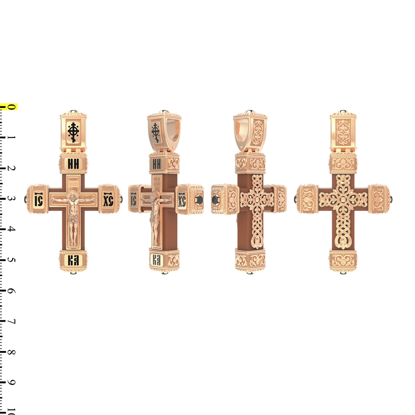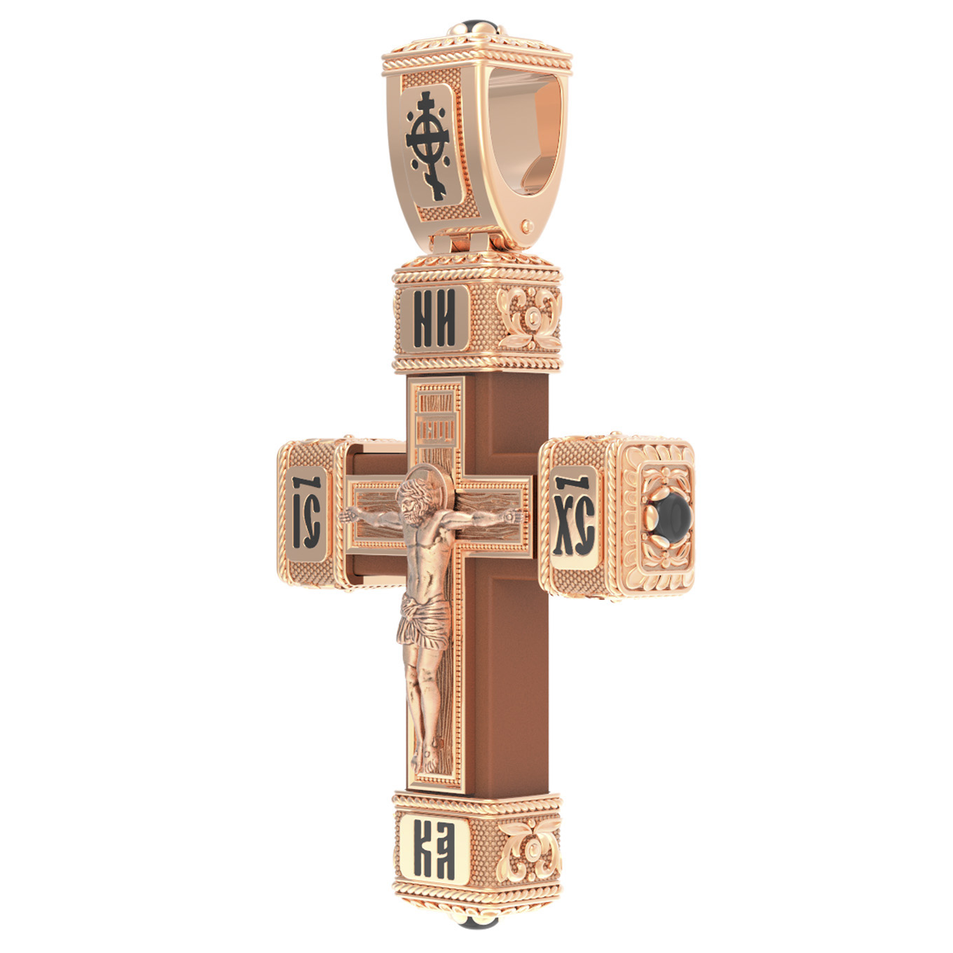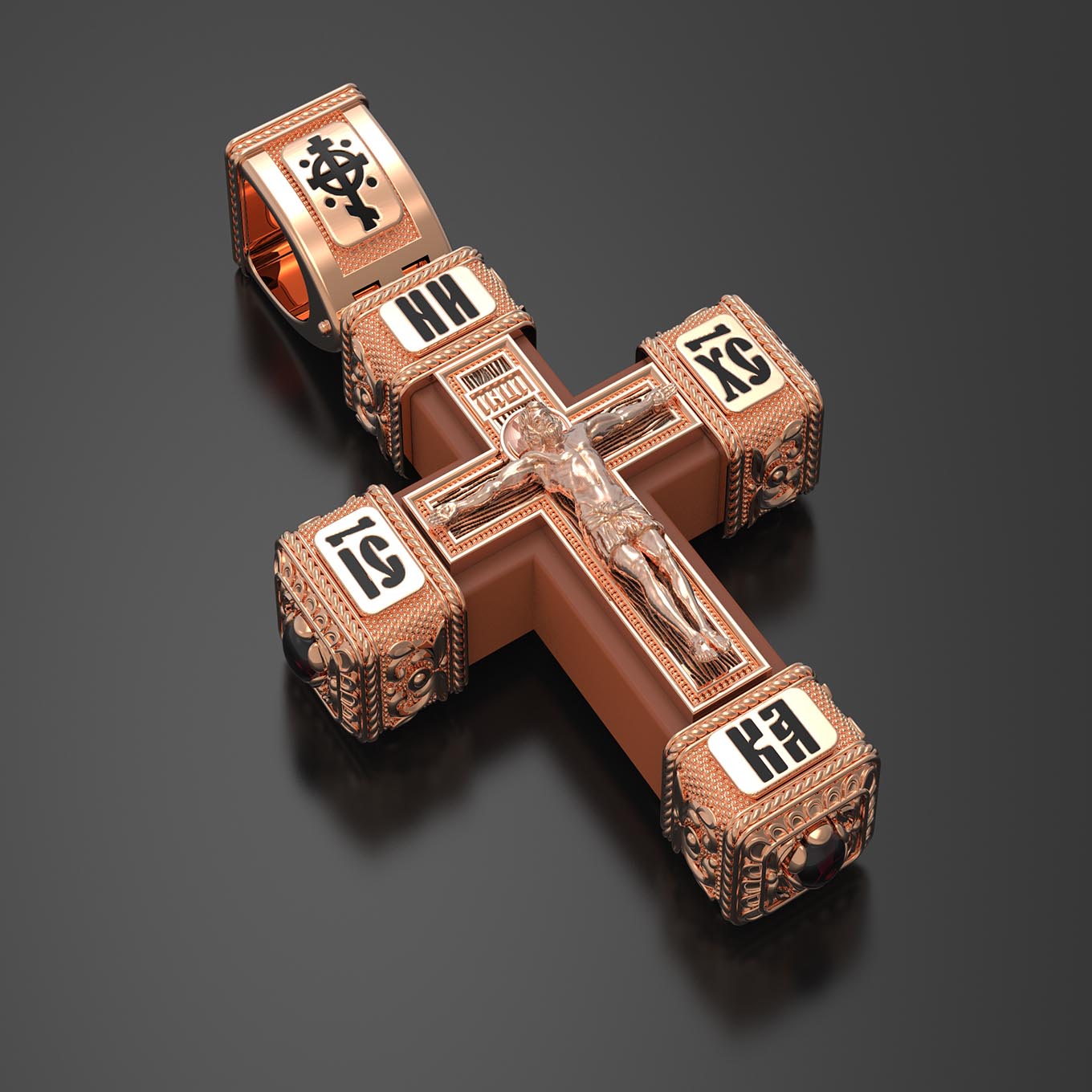 На лицевой стороне креста изображено Распятие Господа и Спасителя нашего Иисуса Христа. Крест- символ спасения и искупления рода человеческого, знамение победы над смертью и адом. Иисус Христос, как искупительная жертва освобождения человечества от власти греха, умер крестной смертью и в третий день воскрес. На верхней табличке, выше головы Иисуса, расположена надпись, составленная Понтием Пилатом — «ИНЦИ». Она означает «Иисус Назорей, Царь Иудейский». Надпись «IС ХС» означает Иисус Христос помещается на разных сторонах поперечной перекладины креста. Надпись –«НИКА» означает победитель. На кулонном кольце помещен крест «терновый венец». Этот крест имеет форму восьмиконечного креста, вторая перекладина которого в центре обведена кругом с остриями по краю, символизирующими терновый венец. «Воины, сплетши венец из терна, возложили ему на голову, — говорится в Евангелии, — и ранами Его мы исцелились» (Ис. 53, 5). Вот почему терновый венок стал для христиан символом победы и награды, «венцом правды» (2 Тим. 4, 8), «венцом славы» (1 Пет. 5, 4), «венцом жизни» (Иак. 1, 12;.Апок. 2, 10).