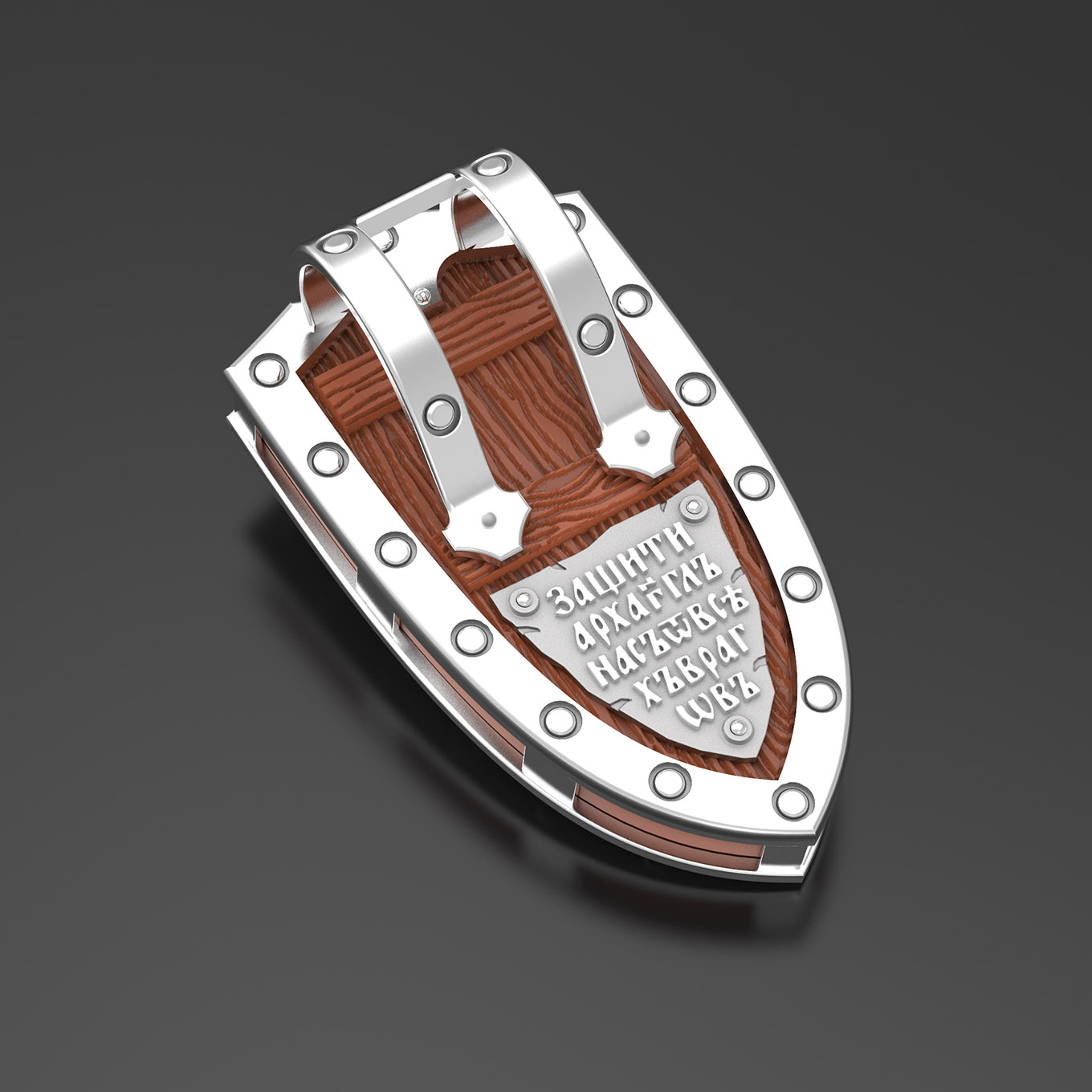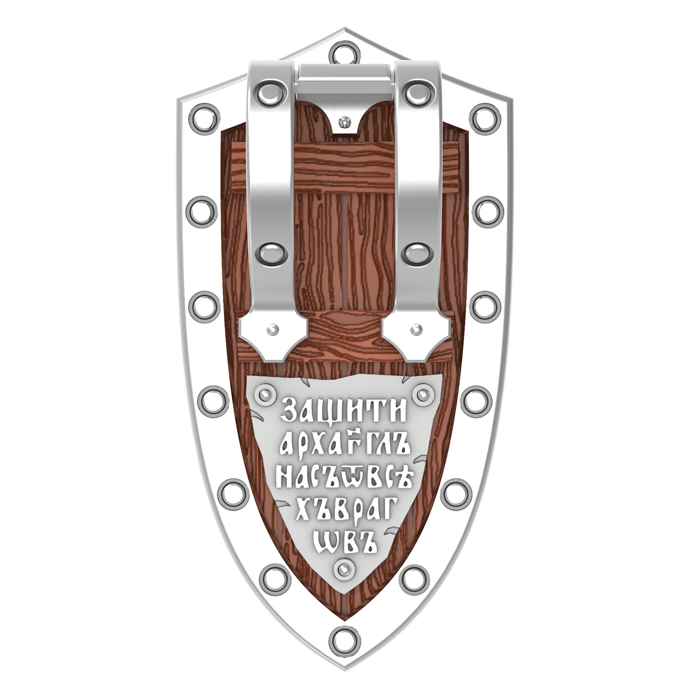 На лицевой стороне образка изображение Архангела Михаила — верного служителя Божия, который низринул с Неба возгордившегося денницу с другими павшими духами. В Православии его называют Архистратигом, что означает глава святого воинства Ангелов и Архангелов. Образок сделан в виде воинского щита. Архангел Михаил изображен в воинственном виде с огненным мечом в правой руке и щитом в левой. Архангел почитается как покровитель воинов и всех верных Богу и ведущих борьбу против сил зла, борец против ересей, а также защитник душ умерших, страж райских врат. С древних времен прославлен своими чудесами Архангел Михаил на Руси. Примеров явления и помощи Архистратига Михаила в русской истории бессчетно. Архангел Михаил не перестает ратоборствовать за славу Творца и Господа всяческих, за дело спасения рода человеческого, за церковь и чад ее. И, согласно, Откровению Иоанна Богослова во время последней битвы небесных и дьявольских сил Михаил и его ангелы опять низвергнут Люцифера вместе с его войском: «Михаил и Ангелы его воевали против дракона, и дракон и ангелы его воевали [против них], но не устояли, и не нашлось уже для них места на небе. И низвержен был великий дракон, древний змий, называемый диаволом и сатаною, обольщающий всю вселенную, низвержен на землю, и ангелы его низвержены с ним» (Откр.12:7−9).