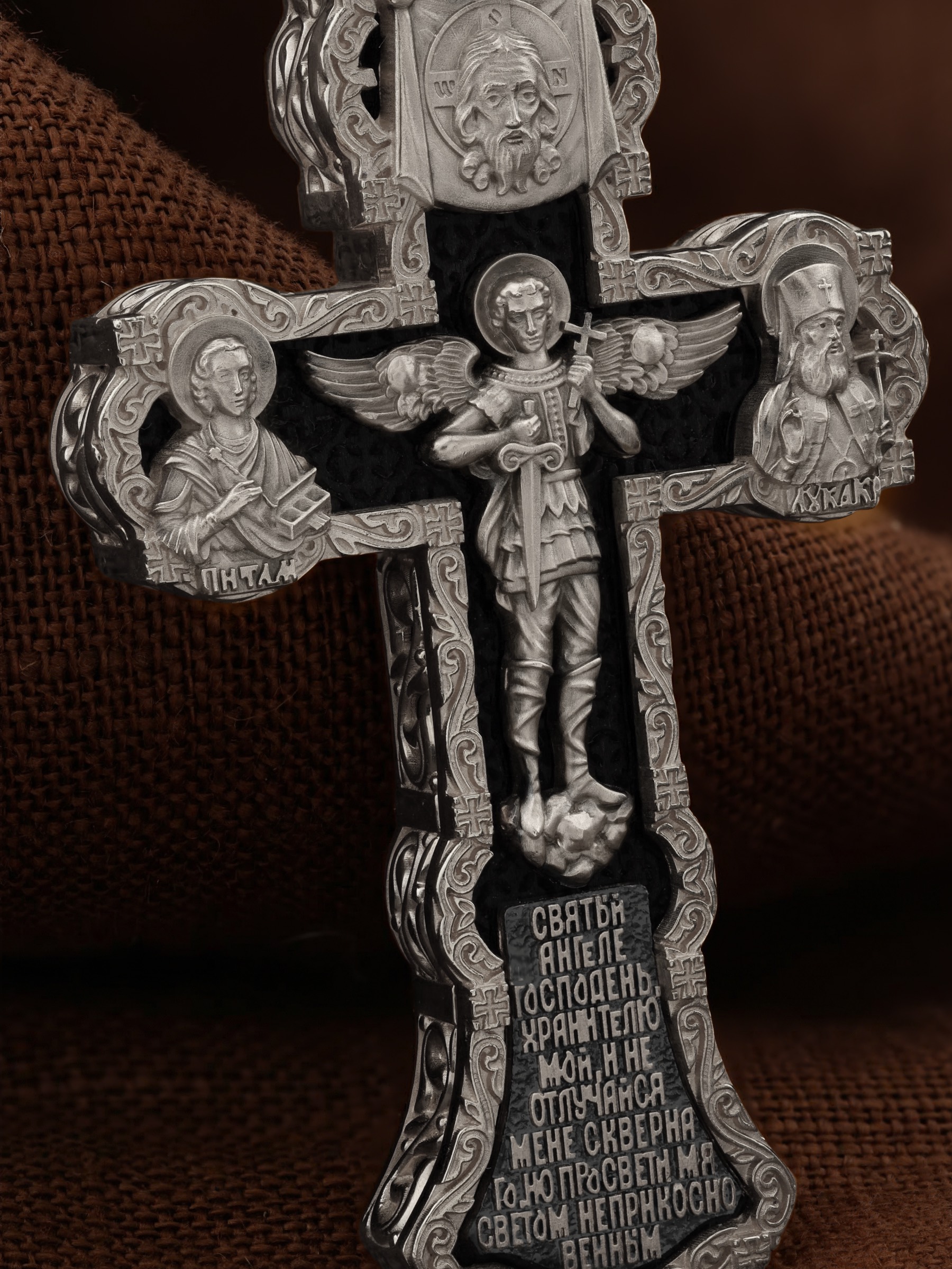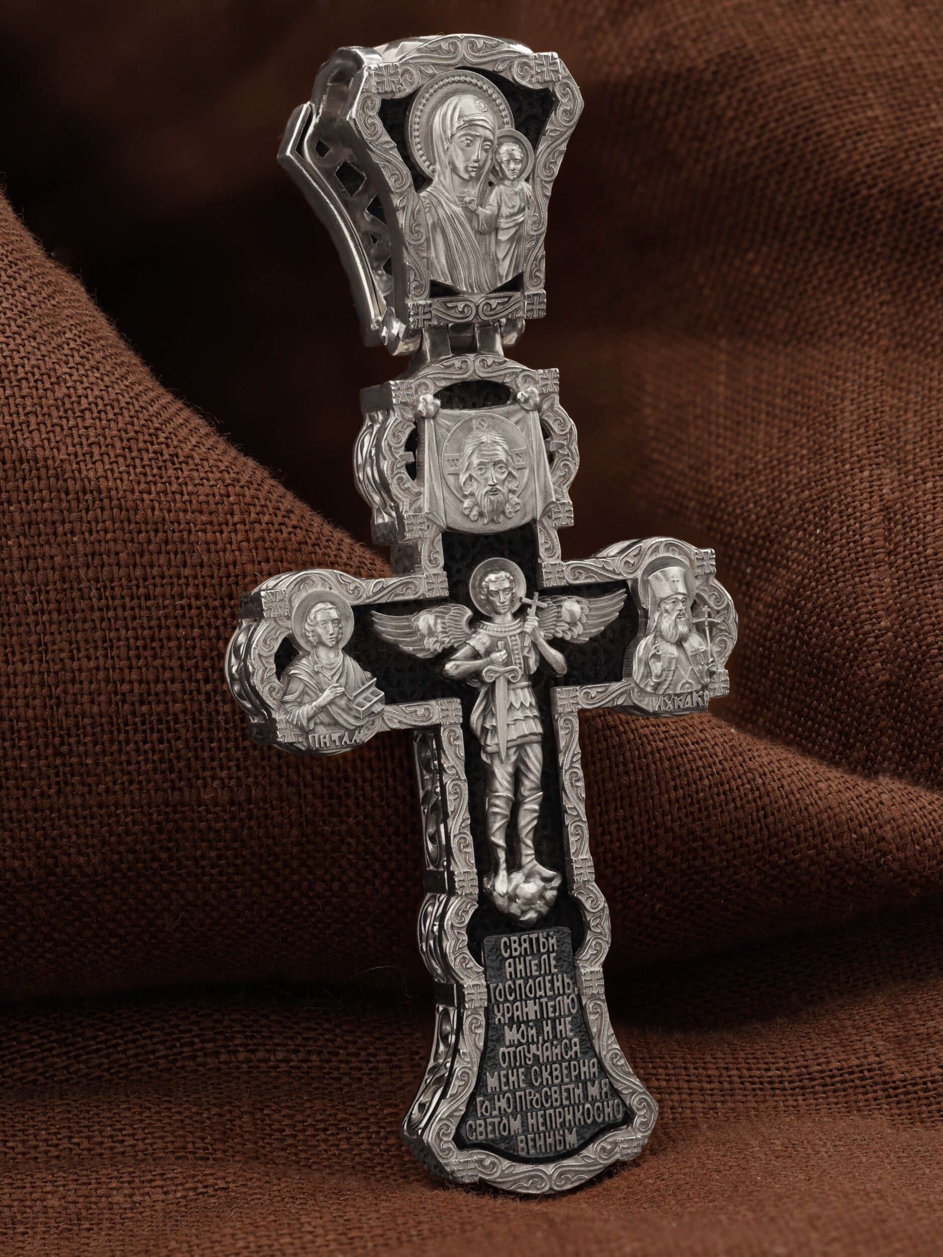 На центральной части оборотной стороны креста изображен Святой Ангел-Хранитель в виде прекрасного юноши держащего в правой руке крест, а в левой — мечь. Ангел-Хранитель — это Ангел приставляемый Богом к человеку при крещении для охраны и помощи в добрых делах. Невидимо пребывая при нас постоянно, он, руководствуя нас ко спасению, не только по нашему желанию таинственно наставляет нас на все доброе и полезное, не только возносит наши молитвы к Богу, но еще и сам от себя охраняют и защищают нас от врагов видимых и невидимых и ходатайствует за нас пред Богом. Ниже образа написана молитва: «Святый Ангеле Господень, Хранитель мой, не отлучайся мене скверного, но просвети мя светом неприкосновенным.» Выше образа изображен Спас Нерукотворный — образ Господа и Спасителя нашего Иисуса Христа, чудесно отпечатавшийся на плате, котором Христос вытер свой лик. Слева — Свя¬той ве¬ли¬ко¬му¬че¬ник и це¬ли¬тель Пан¬те-ле¬и¬мон. Господь даровал удивительную силу его молитве. Ею он исцелял любые болезни, воскрешал мертвых. Справа — Святитель Лука (Войно-Ясенецкий). На кулонном кольце изображена Казанская икона Божией Матери — одна из самых любимых на Руси.