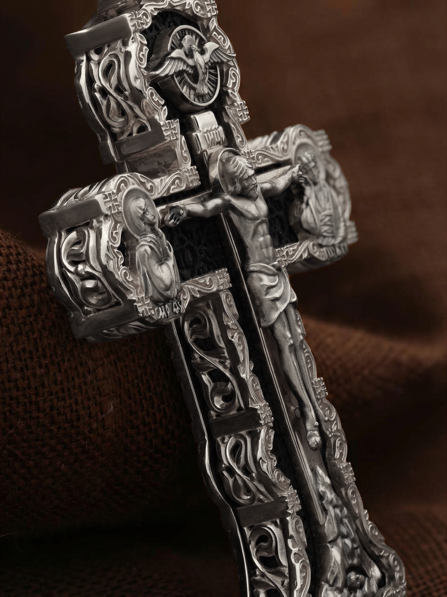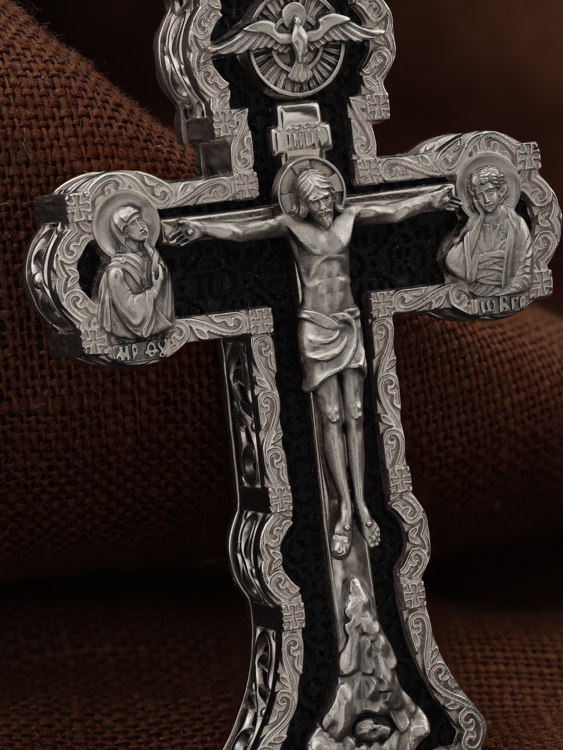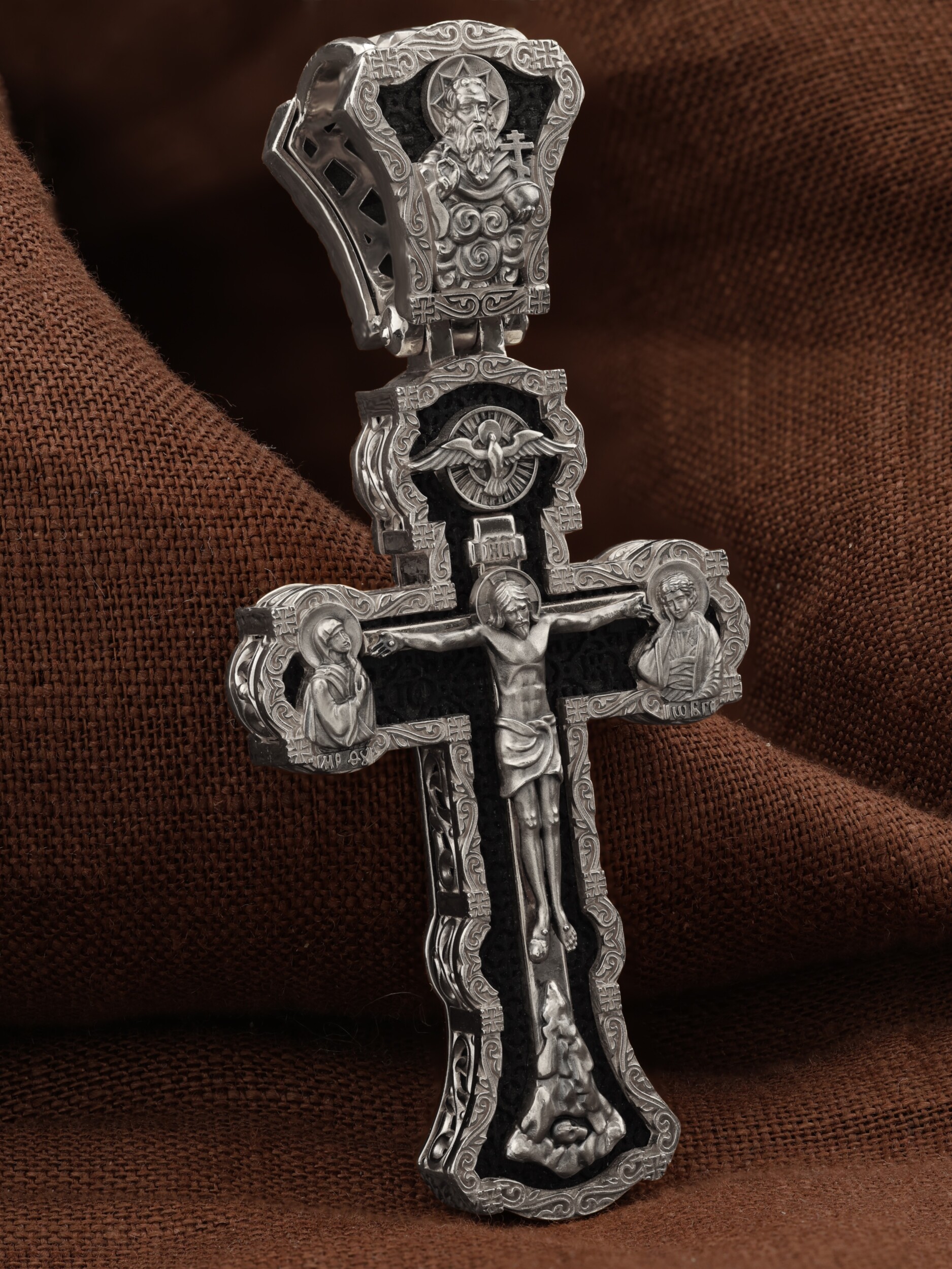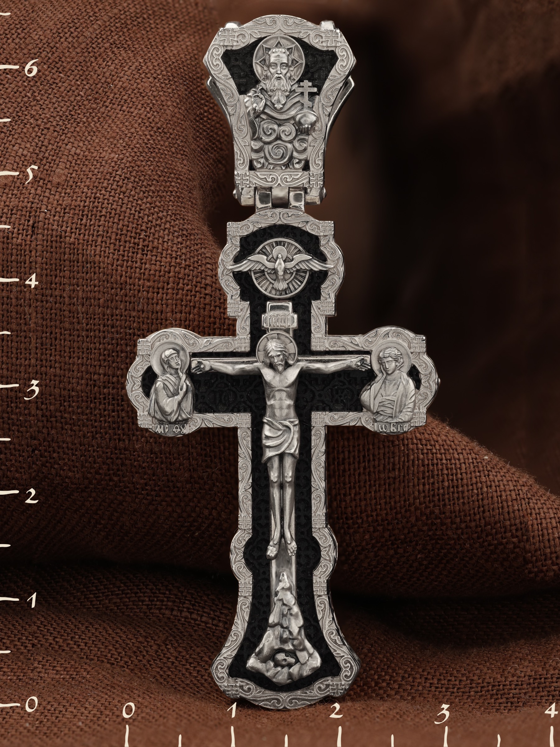 На лицевой стороне креста изображено Распятие Господа и Спасителя нашего Иисуса Христа. Христос, подвергнутый на кресте мучительной казни, своими страданиями искупил нас от древнего греха и даровал нам жизнь вечную. Без Распятия не было бы Воскресения Христова, и поэтому Крест из орудия казни обратился в святыню, в которой действует Благодать Божия. Через крестную жертву Бог раскрывает нам Свою безмерную любовь и призывает к ответной любви. На верхней табличке, выше головы Иисуса, расположена надпись, составленная Понтием Пилатом на трех языках — «IНЦI». Она означает «Иисус Назорей, Царь Иудейский». Надпись «IС ХС» означает Иисус Христос и помещается на разных сторонах поперечной (большой) перекладины креста. Крест стоит на горе камней, символизирующих Голгофу. В ее основании различается череп– это голова Адама. У Креста стоят оплакивающие Господа Божия Матерь и апостол Иоанн Богослов. Из всех апостолов об одном лишь Иоанне Богослове говорится, что он стоял на Голгофе у креста Спасителя, не заботясь о собственной безопасности. Он услышал обращенные к Ней с высоты Креста слова Распятого Господа: «Жено, се сын Твой» и к нему: «Се Мати твоя». С этого времени Иоанн взял Матерь Божию к себе, и Она жила в его доме до самой смерти. Над Распятием — изображение Духа Святого в виде голубя, сходящего с Небес. На кулонном кольце изображен Бог Отец.