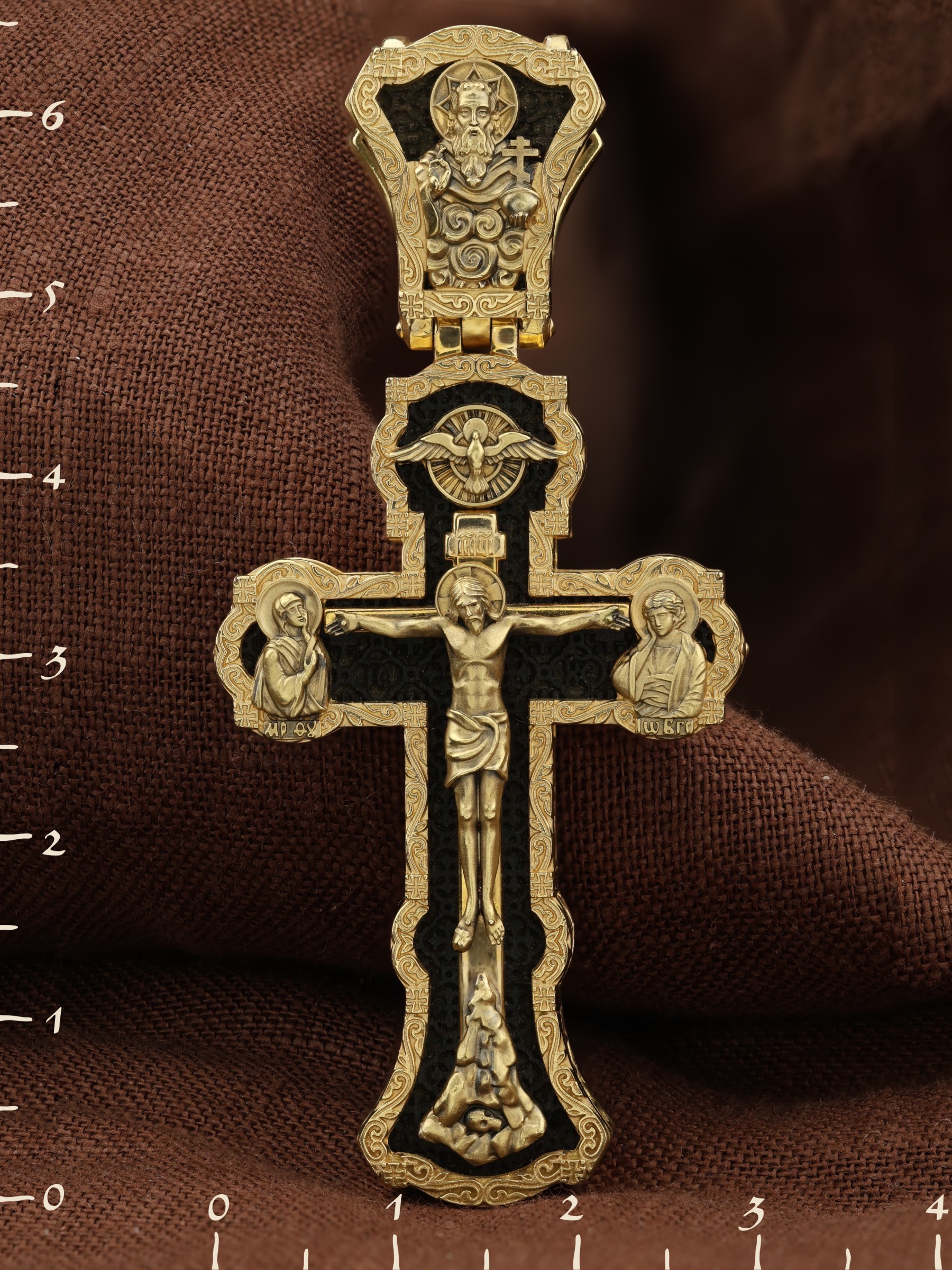 На лицевой стороне креста изображено Распятие Господа и Спасителя нашего Иисуса Христа. Христос, подвергнутый на кресте мучительной казни, своими страданиями искупил нас от древнего греха и даровал нам жизнь вечную. Без Распятия не было бы Воскресения Христова, и поэтому Крест из орудия казни обратился в святыню, в которой действует Благодать Божия. Через крестную жертву Бог раскрывает нам Свою безмерную любовь и призывает к ответной любви. На верхней табличке, выше головы Иисуса, расположена надпись, составленная Понтием Пилатом на трех языках — «IНЦI». Она означает «Иисус Назорей, Царь Иудейский». Надпись «IС ХС» означает Иисус Христос и помещается на разных сторонах поперечной (большой) перекладины креста. Крест стоит на горе камней, символизирующих Голгофу. В ее основании различается череп– это голова Адама. У Креста стоят оплакивающие Господа Божия Матерь и апостол Иоанн Богослов. Из всех апостолов об одном лишь Иоанне Богослове говорится, что он стоял на Голгофе у креста Спасителя, не заботясь о собственной безопасности. Он услышал обращенные к Ней с высоты Креста слова Распятого Господа: «Жено, се сын Твой» и к нему: «Се Мати твоя». С этого времени Иоанн взял Матерь Божию к себе, и Она жила в его доме до самой смерти. Над Распятием — изображение Духа Святого в виде голубя, сходящего с Небес. На кулонном кольце изображен Бог Отец.