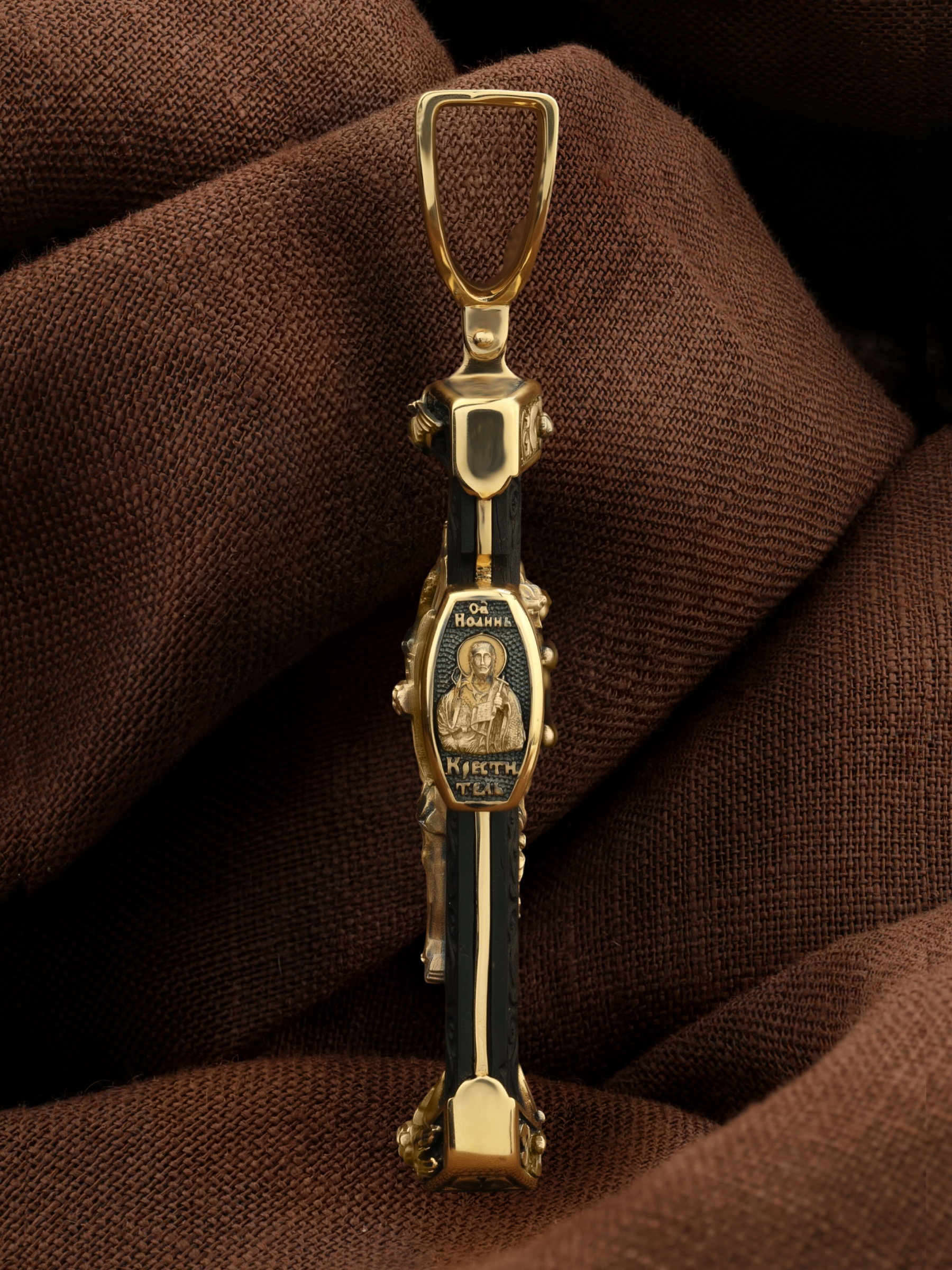 На торце изделия с левой стороны помещена икона Святого Николая Чудотворца — самый почитаемый в Православной Церкви, которого еще называют Николай Угодник за то, что он угодил своей жизнью Богу. Николай Чудотворец, помощник в делах, покровитель учащихся, утешитель обиженных и нуждающихся, целитель самых страшных и тяжелых недугов, предстатель и молитвенник за людей перед Богом. Также Святитель Николай Чудотворец известен своими молитвами за путешественников, когда непрестанный ветер и бушующие волны утихают и корабль заходит в спокойную гавань. На торце изделия с правой стороны — икона Святого Иоанна Крестителя. Святой Иоанн был последним пророком Израиля. Он призывал к покаянию, предвозвещая приближение Царствия Небесного (Мф. 3, 2), и удостоился стать Крестителем Христа. Иисус Христос говорит о нем: «Сей есть о котором написано: «Вот, Я посылаю Ангела Моего пред лицем Твоим, который приготовит путь Твой пред Тобою» (Лк. 7, 27). И еще: «Из рожденных женами нет ни одного пророка больше Иоанна Крестителя» (Лк. 7, 28).